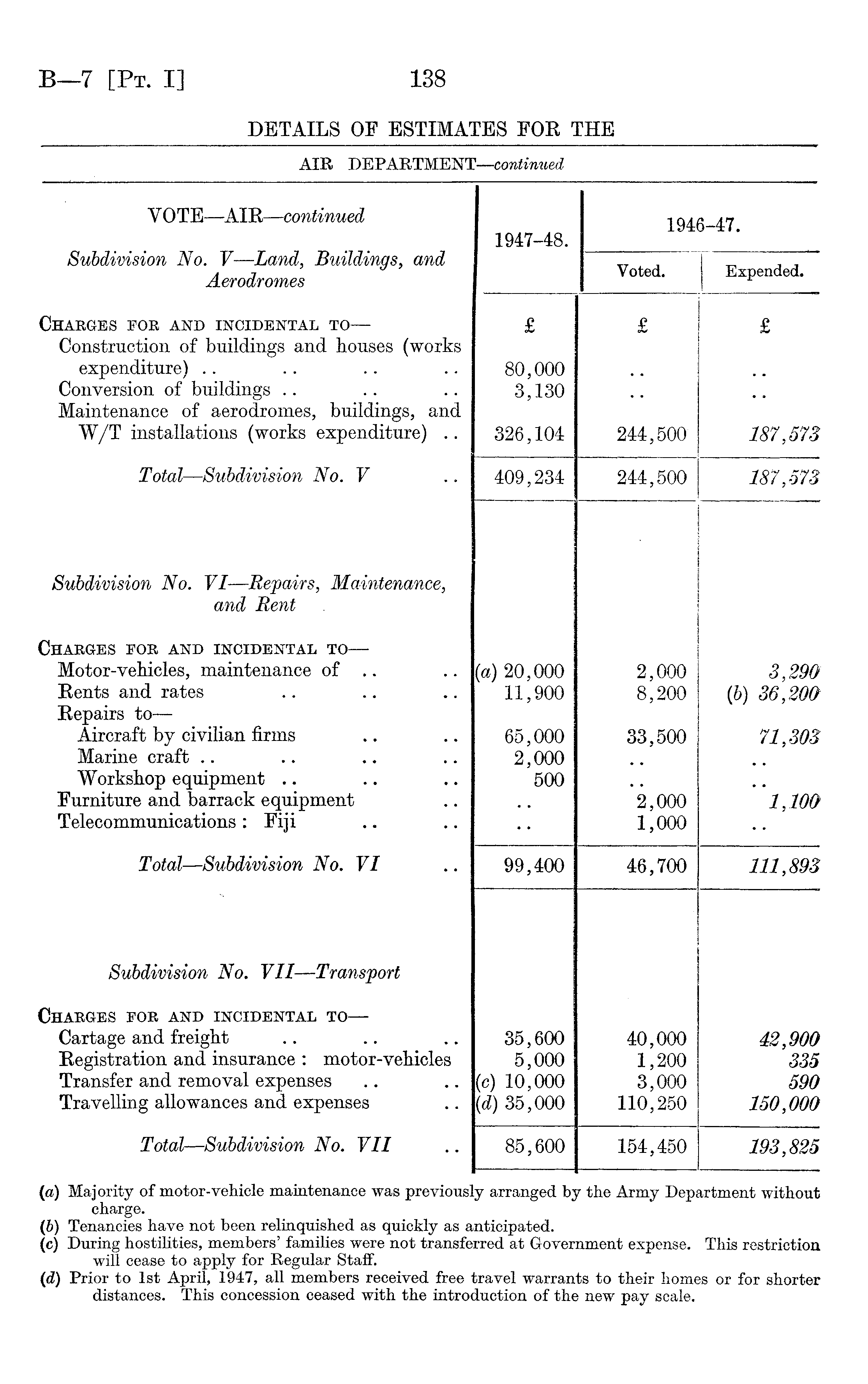 VOTE—AIR— continued 1946-47. 1947-48. Subdivision No. V — Land, Buildings, and Aerodromes Voted. Expended. Charges foe and incidental to — £ £ £ Construction of buildings and houses (works expenditure) 80,000 . . Conversion of buildings 3,130 Maintenance of aerodromes, buildings, and W/T installations (works expenditure) .. 326,104 244,500 187,573 Total — Subdivision No. V 409,234 244,500 187,573 Subdivision No. VI — Repairs, Maintenance, and Rent Charges for and incidental to — Motor-vehicles, maintenance of .. (a) 20,000 2,000 3,290 Rents and rates 11,900 8,200 (6) 36,209 Repairs to — Aircraft by civilian firms 65,000 33,500 71,303 Marine craft 2,000 Workshop equipment 500 , . Furniture and barrack equipment 2,000 1,100 Telecommunications : Fiji 1,000 Total — Subdivision No. VI 99,400 46,700 111,893 Subdivision No. VII — Transport Charges for and incidental to — Cartage and freight 35,600 40,000 42,900 Registration and insurance : motor-vehicles 5,000 1,200 335 Transfer and removal expenses (c) 10,000 3,000 590 Travelling allowances and expenses (d) 35,000 110,250 150,000 Total — Subdivision No. VII 85,600 154,450 193,825 (a) Majority of motor-vehicle maintenance was previous] y arranged b; r the Army Dep irtment without charge. (6) Tenancies have not been relinquished as quickly as a uticipated. (c) During hostilities, members' families were not transfe rred at Gover nment expense. This restriction will cease to apply for Regular Staff. (d) Prior to 1st April, 1947, all members received free 1 travel warran ts to their home js or for shorter distances. This concession ceased with the intro( Luction of the s new pay scale.