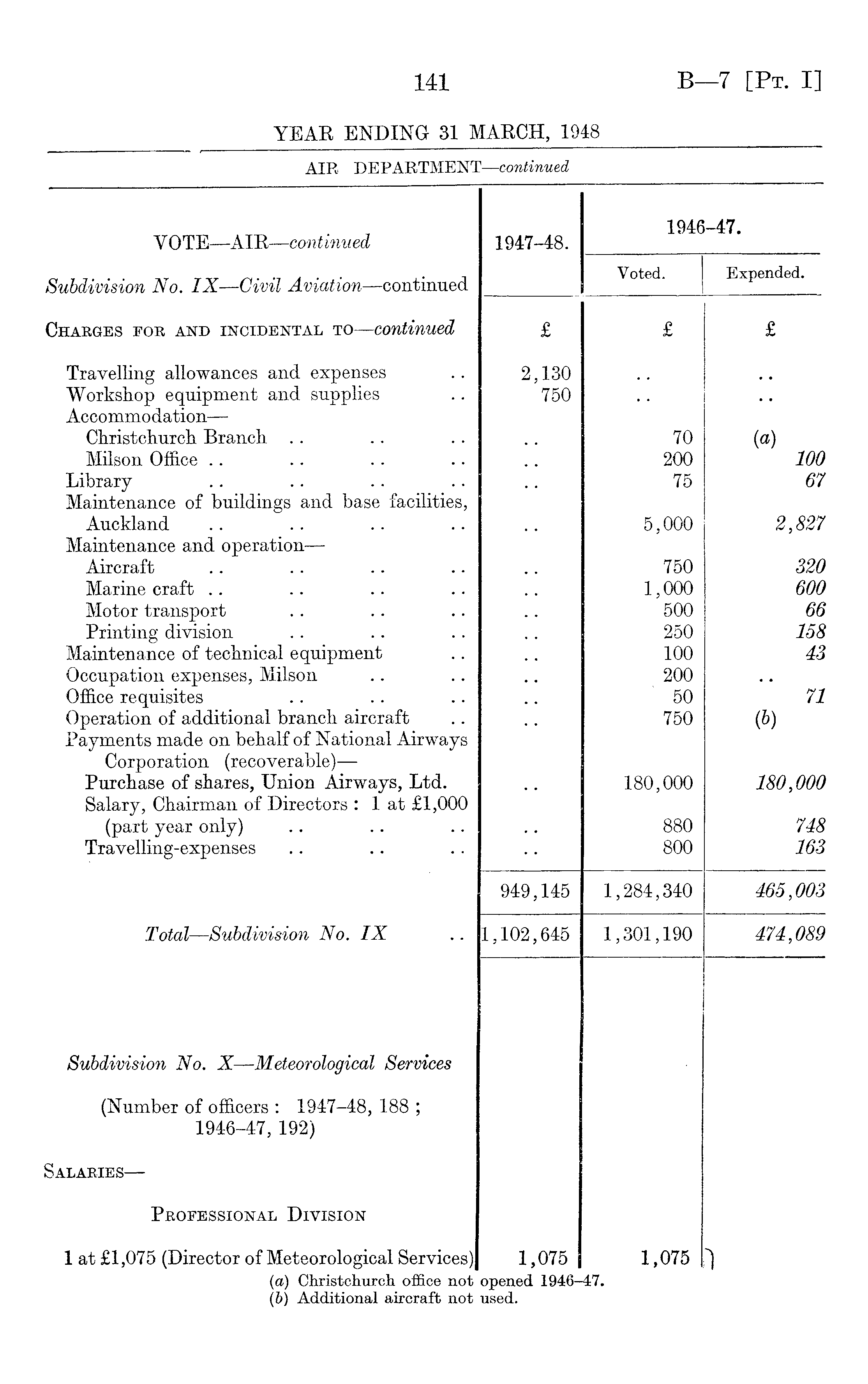 V OTE —AIR—continued 1947-48. 1946-47. Subdivision No. IX —Civil Aviation —continued Voted. Expended. Charges for and incidental to —continued £ £ £ Travelling allowances and expenses Workshop equipment and supplies Accommodation — Christchurch Branch Milson Office .. .. .. Library Maintenance of buildings and base facilities, Auckland Maintenance and operation — Aircraft Marine craft Motor transport .. .. Printing division .. .. Maintenance of technical equipment Occupation expenses, Milson Office requisites Operation of additional branch aircraft Payments made on behalf of National Airways Corporation (recoverable) — Purchase of shares, Union Airways, Ltd. Salary, Chairman of Directors : 1 at £1,000 (part year only) .. Travelling-expenses 2,130 750 70 200 75 5,000 750 1,000 500 250 100 200 50 750 180,000 880 800 (а) 100 67 2,827 320 600 66 158 43 71 (б) 180,000 748 163 949,145 1,284,340 465,003 Total —Subdivision No. IX 1,102,645 1,301,190 474,089 Subdivision No. X —Meteorological Services (Number of officers : 1947-48, 188 ; 1946-47, 192) Salaries — Professional Division 1 at £1,075 (Director of Meteorological Services) 1,075 1,075 n