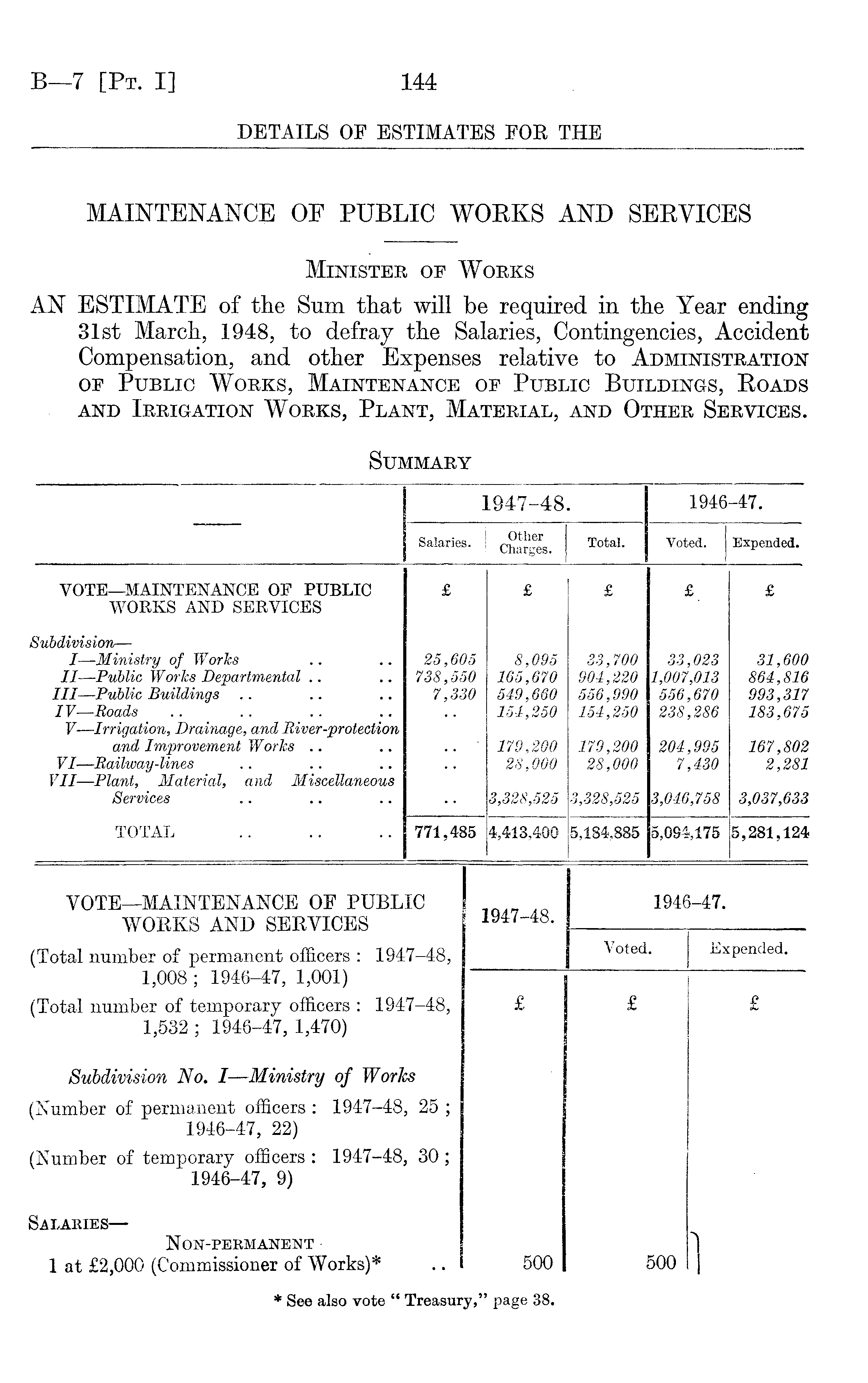 1947-48 1946-47. Salaries. I Other Charges. Total. Voted. Expended. VOTE—MAINTENANCE OF PUBLIC WORKS AND SERVICES £ £ £ £ £ Subdivision— I—Ministry of Works II—Public Works Departmental III—Public Buildings IV—Roads V—Irrigation, Drainage, and River-protection and Improvement Works VI—Railway-lines .. .. .. VII—Plant, Material, and Miscellaneous Services 25,605 738,550 7,330 8,095 165,670 549,660 154,250 179,200 28,000 3,328,525 33,700 904,220 556,990 154,250 179,200 28,000 3,328,525 33,023 1,007,013 556,670 238,286 204,995 7,430 3,046,758 31,600 864,816 993,317 183,675 167,802 2,281 3,037,633 TOTAL 771,485 4,413,400 5,184,885 5,094,175 5,281,124 VOTE—MAINTENANCE OF PUBLIC WORKS AND SERVICES 1947-48. 1946-47. (Total number of permanent officers : 1947-48, Voted. Expended. 1,008 ; 1946-47, 1,001) (Total number of temporary officers : 1947-48, 1,532; 1946-47,1,470) £ £ £ Subdivision No. I—Ministry of Works (Number of permanent officers : 1947-48 1946-47, 22) , 25; (Number of temporary officers : 1947-48. 1946-47, 9) , 30; Salaries — Non-permanent 1 at £2,000 (Commissioner of Works)* 500 500 1 * See also vote " Treasury," page 38.