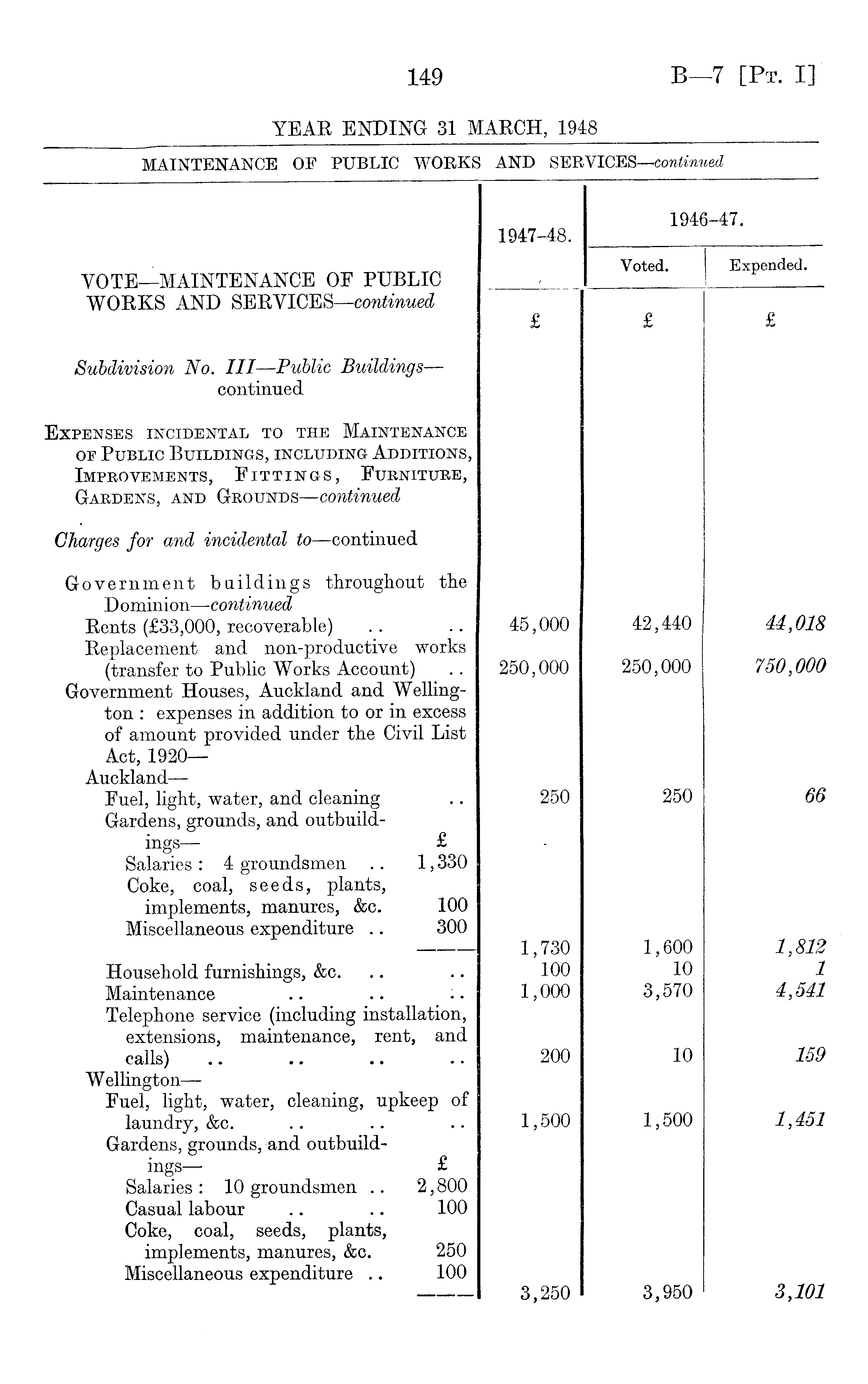 1946-47. 1947-48. VOTE—MAINTENANCE OF PUBLIC Voted. Expended. / WORKS AND SERVICES —continued . £ £ £ Subdivision No. Ill —Public Buildings — continued Expenses incidental to the Maintenance of Public Buildings, including Additions, Improvements, Fittings, Fuenituee, Gaedens, and Geounds —continued Charges for and incidental to —continued Government buildings throughout the D ominion—continued Rents (£33,000, recoverable) 45,000 42,440 44,018 Replacement and non-productive works 750,000 (transfer to Public Works Account) 250,000 250,000 Government Houses, Auckland and Wellington : expenses in addition to or in excess of amount provided under the Civil List Act, 1920— Auckland — Fuel, light, water, and cleaning 250 250 66 Gardens, grounds, and outbuildings— £ Salaries : 4 groundsmen .. 1,330 Coke, coal, seeds, plants, implements, manures, &c. 100 Miscellaneous expenditure .. 300 1,730 1,600 1,812 Household furnishings, &c. 100 10 1 Maintenance 1,000 3,570 4,541 Telephone service (including installation, extensions, maintenance, rent, and calls) 200 10 159 Wellington— Fuel, light, water, cleaning, upkeep of 1,451 laundry, &c. 1,500 1,500 Gardens, grounds, and outbuildings— £ Salaries : 10 groundsmen .. 2,800 Casual labour .. .. 100 Coke, coal, seeds, plants, implements, manures, &c. 250 Miscellaneous expenditure .. 100 3,250 3,950 3,101