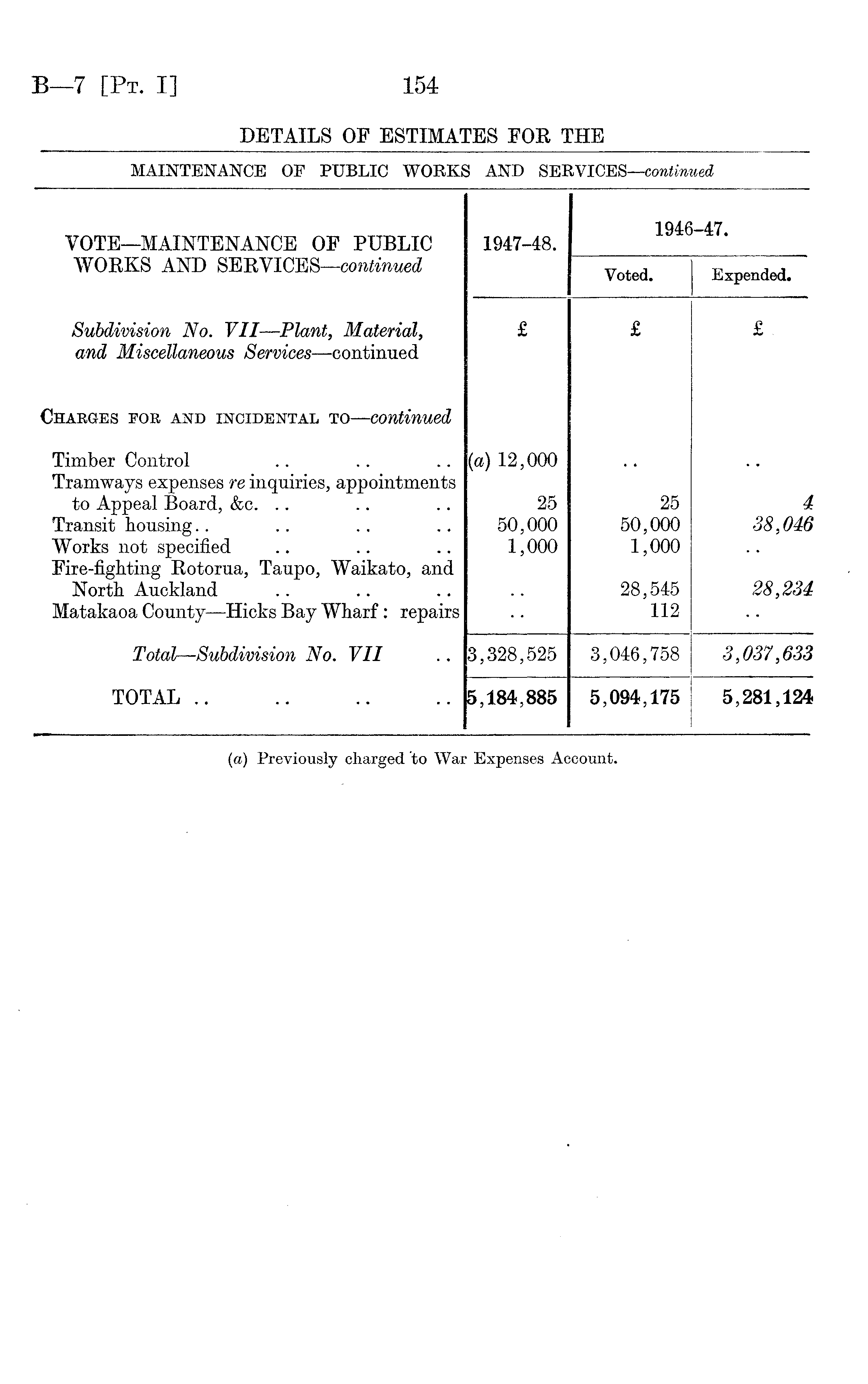 VOTE—MAINTENANCE OF PUBLIC 1947-48. 1946-47. WORKS AND SERVICES —continued Voted. Expended. Subdivision No. VII —Plant, Material, and Miscellaneous Services—continued £ £ £ . Charges for and incidental to—continued Timber Control Tramways expenses re inquiries, appointments to Appeal Board, &c. Transit housing Works not specified Fire-fighting Rotorua, Taupo, Waikato, and North Auckland Matakaoa County —Hicks Bay Wharf: repairs (a) 12,000 25 50,000 1,000 25 50,000 1,000 28,545 112 4 38,046 28,234 Total —Subdivision No. VII 3,328,525 3,046,758 3,037,633 TOTAL .. 5,184,885 5,094,175 5,281,124 (a) Previously charged 'to War Expenses Account.