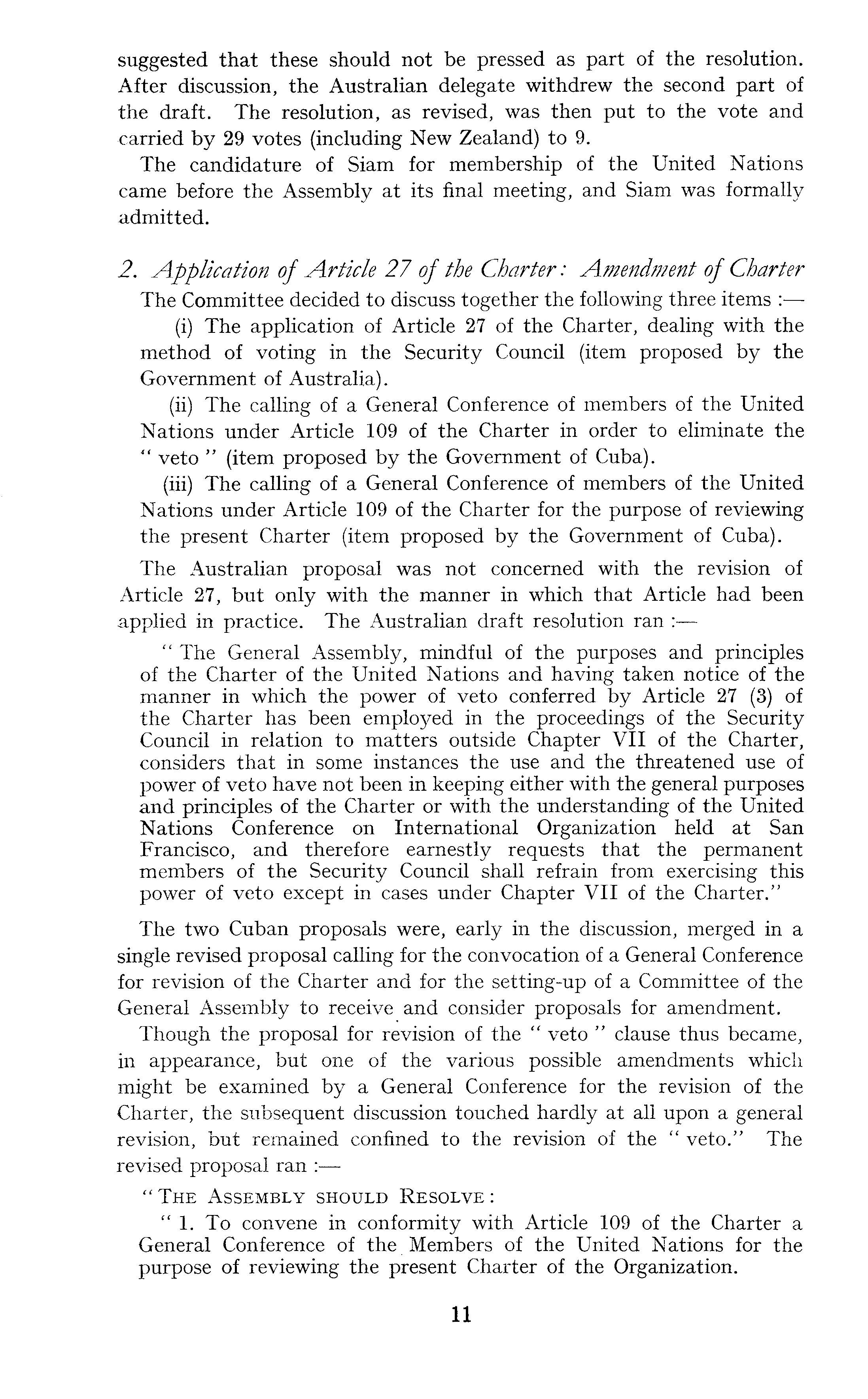 suggested that these should not be pressed as part of the resolution. After discussion, the Australian delegate withdrew the second part of the draft. The resolution, as revised, was then put to the vote and carried by 29 votes (including New Zealand) to 9. The candidature of Siam for membership of the United Nations came before the Assembly at its final meeting, and Siam was formally admitted. 2. Application of Article 27 of the Charter: Amendment of Charter The Committee decided to discuss together the following three items (i) The application of Article 27 of the Charter, dealing with the method of voting in the Security Council (item proposed by the Government of Australia). (ii) The calling of a General Conference of members of the United Nations under Article 109 of the Charter in order to eliminate the " veto " (item proposed by the Government of Cuba). (iii) The calling of a General Conference of members of the United Nations under Article 109 of the Charter for the purpose of reviewing the present Charter (item proposed by the Government of Cuba). The Australian proposal was not concerned with the revision of Article 27, but only with the manner in which that Article had been applied in practice. The Australian draft resolution ran : " The General Assembly, mindful of the purposes and principles of the Charter of the United Nations and having taken notice of the manner in which the power of veto conferred by Article 27 (3) of the Charter has been employed in the proceedings of the Security Council in relation to matters outside Chapter VII of the Charter, considers that in some instances the use and the threatened use of power of veto have not been in keeping either with the general purposes and principles of the Charter or with the understanding of the United Nations Conference on International Organization held at San Francisco, and therefore earnestly requests that the permanent members of the Security Council shall refrain from exercising this power of veto except in cases under Chapter VII of the Charter." The two Cuban proposals were, early in the discussion, merged in a single revised proposal calling for the convocation of a General Conference for revision of the Charter and for the setting-up of a Committee of the General Assembly to receive and consider proposals for amendment. Though the proposal for revision of the " veto " clause thus became, in appearance, but one of the various possible amendments which might be examined by a General Conference for the revision of the Charter, the subsequent discussion touched hardly at all upon a general revision, but remained confined to the revision of the " veto." The revised proposal ran : "The Assembly should Resolve: " 1. To convene in conformity with Article 109 of the Charter a General Conference of the Members of the United Nations for the purpose of reviewing the present Charter of the Organization.