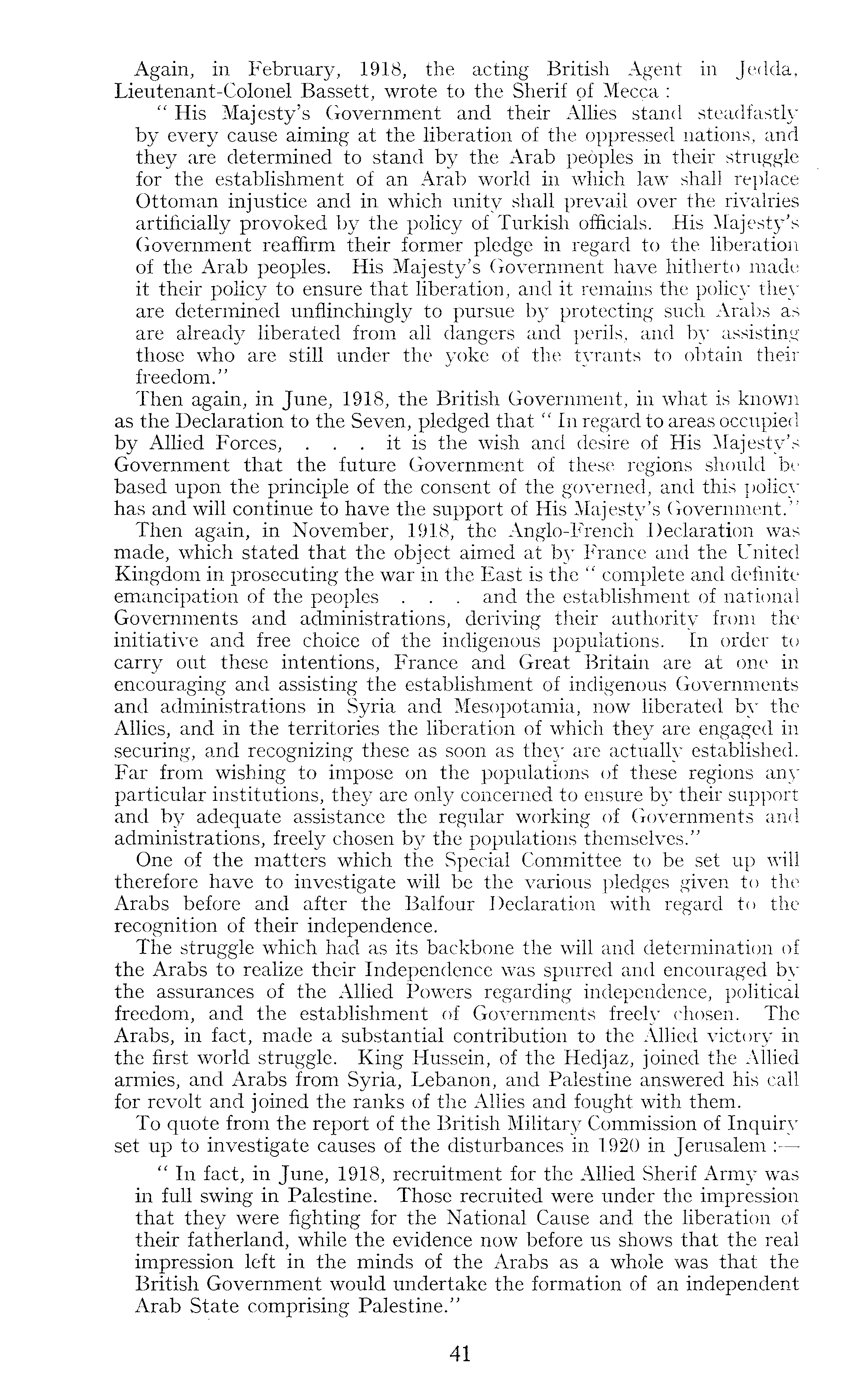 Again, in February, 1918, the acting British Agent in Jedda, Lieutenant-Colonel Bassett, wrote to the Sherif of Mecca : "His Majesty's Government and their -Allies stand steadfastly by every cause aiming at the liberation of the oppressed nations, and they are determined to stand by the Arab peoples in their struggle for the establishment of an Arab world in which law shall replace Ottoman injustice and in which unity shall prevail over the rivalries artificially provoked by the policy of Turkish officials. His Majesty's Government reaffirm their former pledge in regard to the liberation of the Arab peoples. His Majesty's Government have hitherto made it their policy to ensure that liberation, and it remains the policy they are determined unflinchingly to pursue by protecting such Arabs as are already liberated from all dangers and perils, and by assisting those who are still under the yoke of the tyrants to obtain their freedom." Then again, in June, 1918, the British Government, in what is known as the Declaration to the Seven, pledged that " In regard to areas occupied by Allied Forces, . . . it is the wish and desire of His Majesty's Government that the future Government of these regions should be based upon the principle of the consent of the governed, and this policy has and will continue to have the support of His Majesty's Government." Then again, in November, 1918, the Anglo-French Declaration was made, which stated that the object aimed at by France and the United Kingdom in prosecuting the war in the East is the " complete and definite emancipation of the peoples . . . and the establishment of national Governments and administrations, deriving their authority from the initiative and free choice of the indigenous populations. In order to carry out these intentions, France and Great Britain are at one in encouraging and assisting the establishment of indigenous Governments and administrations in Syria and Mesopotamia, now liberated by the Allies, and in the territories the liberation of which they are engaged in securing, and recognizing these as soon as they are actually established. Far from wishing to impose on the populations of these regions any particular institutions, they are only concerned to ensure by their support and by adequate assistance the regular working of Governments and administrations, freely chosen by the populations themselves." One of the matters which the Special Committee to be set up will therefore have to investigate will be the various pledges given to the Arabs before and after the Balfour Declaration with regard to the recognition of their independence. The struggle which had as its backbone the will and determination of the Arabs to realize their Independence was spurred and encouraged ,by the assurances of the Allied Powers regarding independence, political freedom, and the establishment of Governments freely chosen. The Arabs, in fact, made a substantial contribution to the Allied victory in the first world struggle. King Hussein, of the Hedjaz, joined the Allied armies, and Arabs from Syria, 'Lebanon, and Palestine answered his call for revolt and joined the ranks of the Allies and fought with them. To quote from the report of the British Military Commission of Inquiry set up to investigate causes of the disturbances in 1920 in Jerusalem : " In fact, in June, 1918, recruitment for the Allied Sherif Army was in full swing in Palestine. Those recruited were under the impression that they were fighting for the National Cause and the liberation of their fatherland, while the evidence now before us shows that the real impression left in the minds of the Arabs as a whole was that the British Government would undertake the formation of an independent Arab State comprising Palestine."