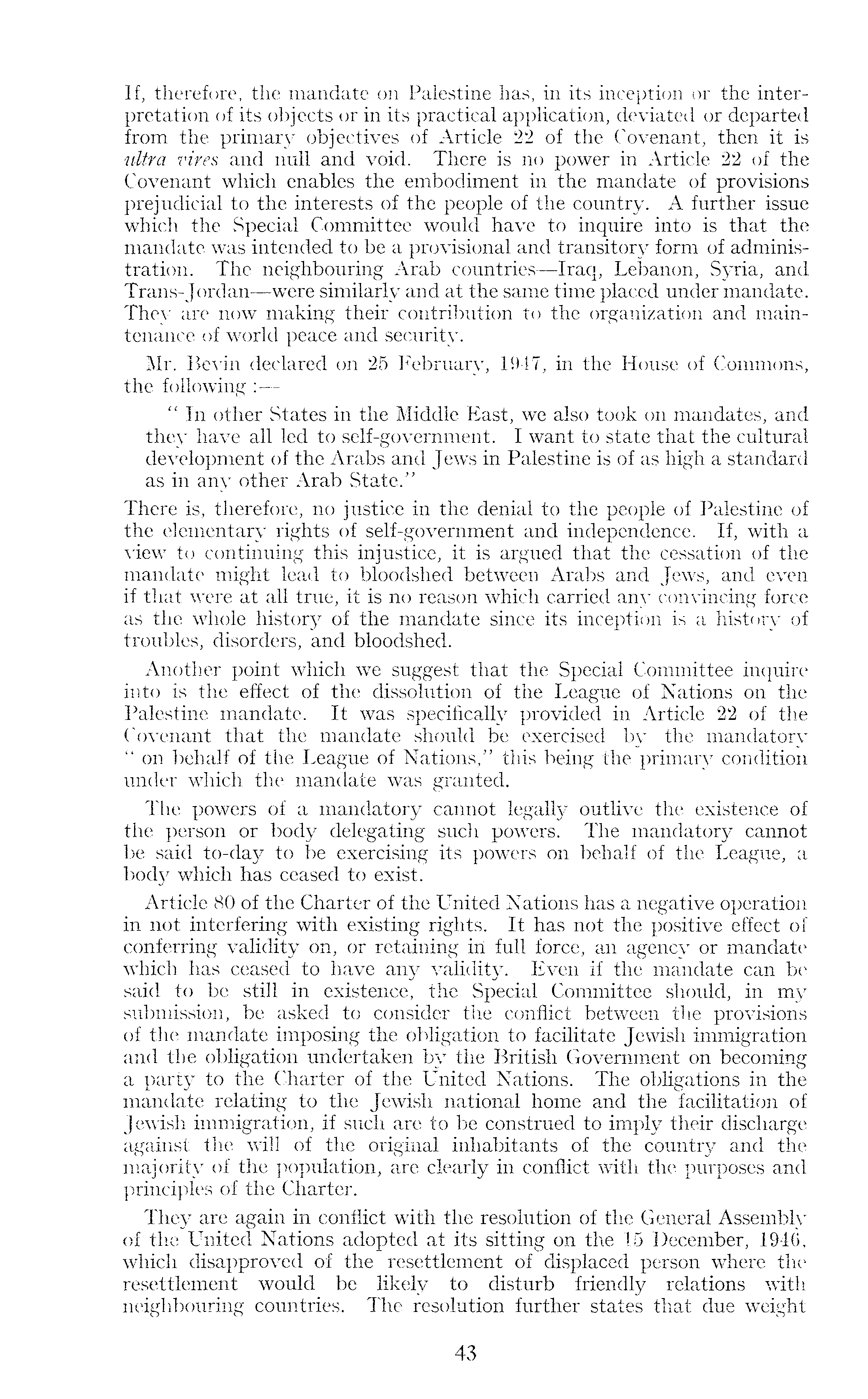 If, therefore, the mandate on Palestine has, in its inception or the interpretation of its objects or in its practical application, deviated or departed from the primary objectives of Article 22 of the Covenant, then it is ultra vires and null and void. There is no power in Article 22 of the Covenant which enables the embodiment in the mandate of provisions prejudicial to the interests of the people of the country. A further issue which the Special Committee would have to inquire into is that the mandate was intended to be a provisional and transitory form of administration. The neighbouring Arab countries—lraq, Lebanon, Syria, and Trans-Jordan —were similarly and at the same time placed under mandate. They are now making their contribution to the organization and maintenance of world peace and security. Mr. Bevin declared on 25 February, 1947, in the House of Commons, the following : " In other States in the Middle East, we also took on mandates, and they have all led to self-government. I want to state that the cultural development of the Arabs and Jews in Palestine is of as high a standard as in any other Arab State." There is, therefore, no justice in the denial to the people of Palestine of the elementary" rights of self-government and independence. If, with a view to continuing this injustice, it is argued that the cessation of the mandate might lead to bloodshed between Arabs and Jews, and even if that were at all true, it is no reason which carried any convincing force as the whole history of the mandate since its inception is a history of troubles, disorders, and bloodshed. Another point which we suggest that the Special Committee inquire into is the effect of the dissolution of the League of Nations on the Palestine mandate. It was specifically provided in Article 22 of the Covenant that the mandate should be exercised by the mandatory " on behalf of the League of Nations/' this being the primary condition under which the mandate was granted. The powers of a mandatory cannot legally outlive the existence of the person or body delegating such powers. The mandatory cannot be said to-day to be exercising its powers on behalf of the League, a body which has ceased to exist. Article 80 of the Charter of the United Nations has a negative operation in not interfering with existing rights. It has not the positive effect of conferring validity on, or retaining in full force, an agency or mandate which has ceased to have any validity. Even if the mandate can be said to be still in existence, the Special Committee should, in my submission, be asked to consider the conflict between the provisions of the mandate imposing the obligation to facilitate Jewish immigration and the obligation undertaken by the British Government on becoming a party to the Charter of the United Nations. The obligations in the mandate relating to the Jewish national home and the facilitation of Jewish immigration, if such are to be construed to imply their discharge against the will of the original inhabitants of the country and .the majority of the population, are clearly in conflict with the purposes and principles of the Charter. They are again in conflict with the resolution of the General Assembly of the United Nations adopted at its sitting on the 15 December, 1946, which disapproved of the resettlement of displaced person where the resettlement would be likely to disturb friendly relations with neighbouring countries. The resolution further states that due weight