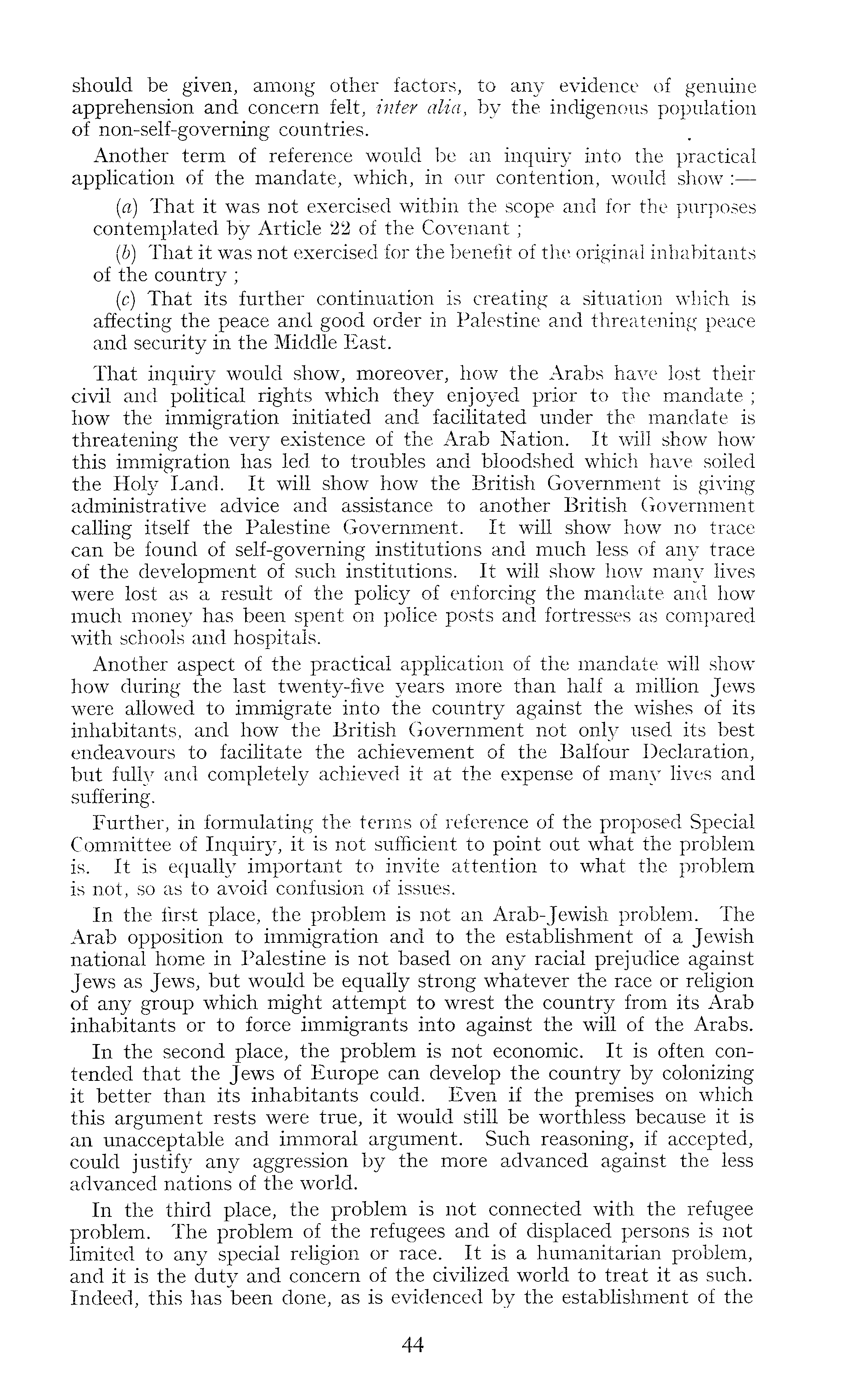 should be given, among other factors, to any evidence of genuine apprehension and concern felt, inter alia, by the indigenous population of non-self-governing countries. Another term of reference would be an inquiry into the practical application of the mandate, which, in our contention, would show : (a) That it was not exercised within the scope and for the purposes contemplated by Article 22 of the Covenant; (b) That it was not exercised for the benefit of the original inhabitants of the country ; (c) That its further continuation is creating a situation which is affecting the peace and good order in Palestine and threatening peace and security in the Middle East. That inquiry would show, moreover, how the Arabs have lost their civil and political rights which they enjoyed prior to the mandate ; how the immigration initiated and facilitated under the mandate is threatening the very existence of the Arab Nation. It will show how this immigration has led to troubles and bloodshed which have soiled the Holy Land. It will show how the British Government is giving administrative advice and assistance to another British Government calling itself the Palestine Government. It will show how no trace can be found of self-governing institutions and much less of any trace of the development of such institutions. It will show how many lives were lost as a result of the policy of enforcing the mandate and how much money has been spent on police posts and fortresses as compared with schools and hospitals. Another aspect of the practical application of the mandate will show how during the last twenty-five years more than half a million Jews were allowed to immigrate into the country against the wishes of its inhabitants, and how the British Government not only used its best endeavours to facilitate the achievement of the Balfour Declaration, but frilly and completely achieved it at the expense of many lives and suffering. Further, in formulating the terms of reference of the proposed Special Committee of Inquiry, it is not sufficient to point out what the problem is. It is equally important to invite attention to what the problem is not, so as to avoid confusion of issues. In the first place, the problem is not an Arab-Jewish problem. The Arab opposition to immigration and to the establishment of a Jewish national home in Palestine is not based on any racial prejudice against Jews as Jews, but would be equally strong whatever the race or religion of any group which might attempt to wrest the country from its Arab inhabitants or to force immigrants into against the will of the Arabs. In the second place, the problem is not economic. It is often contended that the Jews of Europe can develop the country by colonizing it better than its inhabitants could. Even if the premises on which this argument rests were true, it would still be worthless because it is an unacceptable and immoral argument. Such reasoning, if accepted, could justify any aggression by the more advanced against the less advanced nations of the world. In the third place, the problem is not connected with the refugee problem. The problem of the refugees and of displaced persons is not limited to any special religion or race. It is a humanitarian problem, and it is the duty and concern of the civilized world to treat it as such. Indeed, this has been done, as is evidenced by the establishment of the
