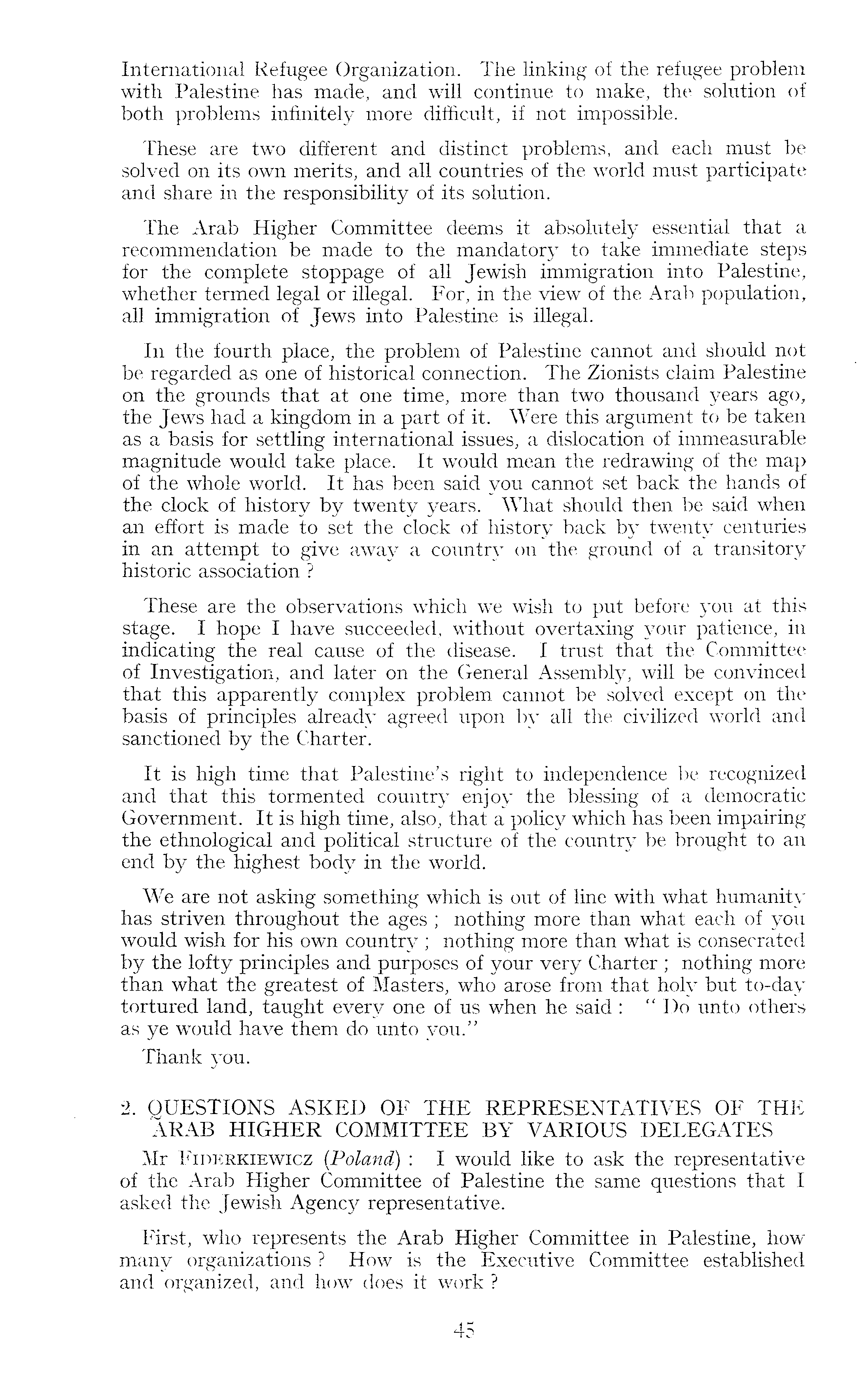 International Refugee Organization. The linking of the refugee problem with Palestine has made, and will continue to make, the solution of both problems infinitely more difficult, if not impossible. These are two different and distinct problems, and each must be solved on its own merits, and all countries of the world must participate and share in the responsibility of its solution. The Arab Higher Committee deems it absolutely essential that a recommendation be made to the mandatory to take immediate steps for the complete stoppage of all Jewish immigration into Palestine, whether termed legal or illegal. For, in the view of the Arab population, all immigration of Jews into Palestine is illegal. In the fourth place, the problem of Palestine cannot and should not be regarded as one of historical connection. The Zionists claim Palestine on the grounds that at one time, more than two thousand years ago, the Jews had a kingdom in a part of it. Were this argument to be taken as a basis for settling international issues, a dislocation of immeasurable magnitude would take place. It would mean the redrawing of.the map of the whole world. It has been said you cannot set back the hands of the clock of history by twenty years. What should then be said when an effort is made to set the clock of history back by twenty centuries in an attempt to give away a country on the ground of a transitory historic association ? These are the observations which we wish to put before you at this stage. I hope I have succeeded, without overtaxing your patience, in indicating the real cause of the disease. I trust that the Committee of Investigation, and later on the General Assembly, will be convinced that this apparently complex problem cannot be solved except on the basis of principles already agreed upon by all the civilized world and sanctioned by the Charter. It is high time that Palestine's right to independence be recognized and that this tormented country enjoy the blessing of a democratic Government. It is high time, also, that a policy which has been impairing the ethnological and political structure of the country be brought to an end by the highest body in the world. We are not asking something which is out of line with what humanity has striven throughout the ages ; nothing more than what each of you would wish for his own country ; nothing more than what is consecrated by the lofty principles and purposes of your very Charter ; nothing more than what the greatest of Masters, who arose from that holy but to-day tortured land, taught every one of us when he said : "Do unto others as ye would have them do unto you." Thank you. 2. QUESTIONS ASKED OF THE REPRESENTATIVES OF THE ARAB HIGHER COMMITTEE BY VARIOUS DELEGATES Mr Fiderkiewicz (Poland) : I would like to ask the representative of the Arab Higher Committee of Palestine the same questions that I asked the Jewish Agency representative. First, who represents the Arab Higher Committee in Palestine, how many organizations ? How is the Executive Committee established and organized, and how does it work ?