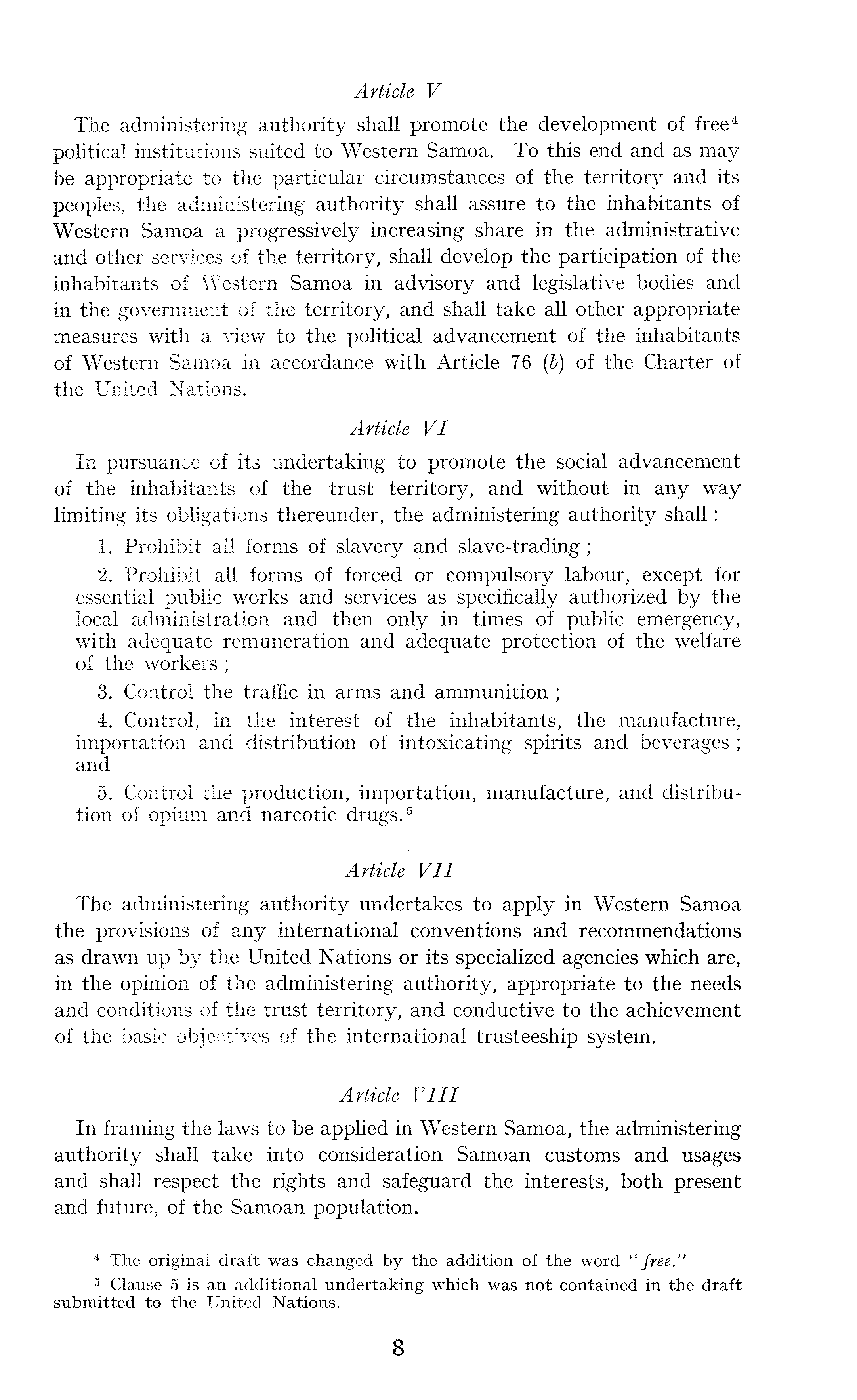 Article V The administering authority shall promote the development of free 4 political institutions suited to Western Samoa. To this end and as maybe appropriate to the particular circumstances of the territory and its peoples, the administering authority shall assure to the inhabitants of Western Samoa a progressively increasing share in the administrative and other services of the territory, shall develop the participation of the inhabitants of Western Samoa in advisory and legislative bodies and in the government of the territory, and shall take all other appropriate measures with a view to the political advancement of the inhabitants of Western Samoa in accordance with Article 76 (b) of the Charter of the United Nations. Article VI In pursuance of its undertaking to promote the social advancement of the inhabitants of the trust territory, and without in any way limiting its obligations thereunder, the administering authority shall: 1. Prohibit all forms of slavery and slave-trading ; 2. Prohibit all forms of forced or compulsory labour, except for essential public works and services as specifically authorized by the local administration and then only in times of public emergency, with adequate remuneration and adequate protection of the welfare of the workers ; 3. Control the traffic in arms and ammunition ; 4. Control, in the interest of the inhabitants, the manufacture, importation and distribution of intoxicating spirits and beverages ; and 5. Control the production, importation, manufacture, and distribution of opium and narcotic drugs. 5 Article VII The administering authority undertakes to apply in Western Samoa the provisions of any international conventions and recommendations as drawn up by the United Nations or its specialized agencies which are, in the opinion of the administering authority, appropriate to the needs and conditions of the trust territory, and conductive to the achievement of the basic objectives of the international trusteeship system. Article VIII In framing the laws to be applied in Western Samoa, the administering authority shall take into consideration Samoan customs and usages and shall respect the rights and safeguard the interests, both present and future, of the Samoan population. 4 The original draft was changed by the addition of the word "free." 5 Clause 5 is an additional undertaking which was not contained in the draft submitted to the United Nations.