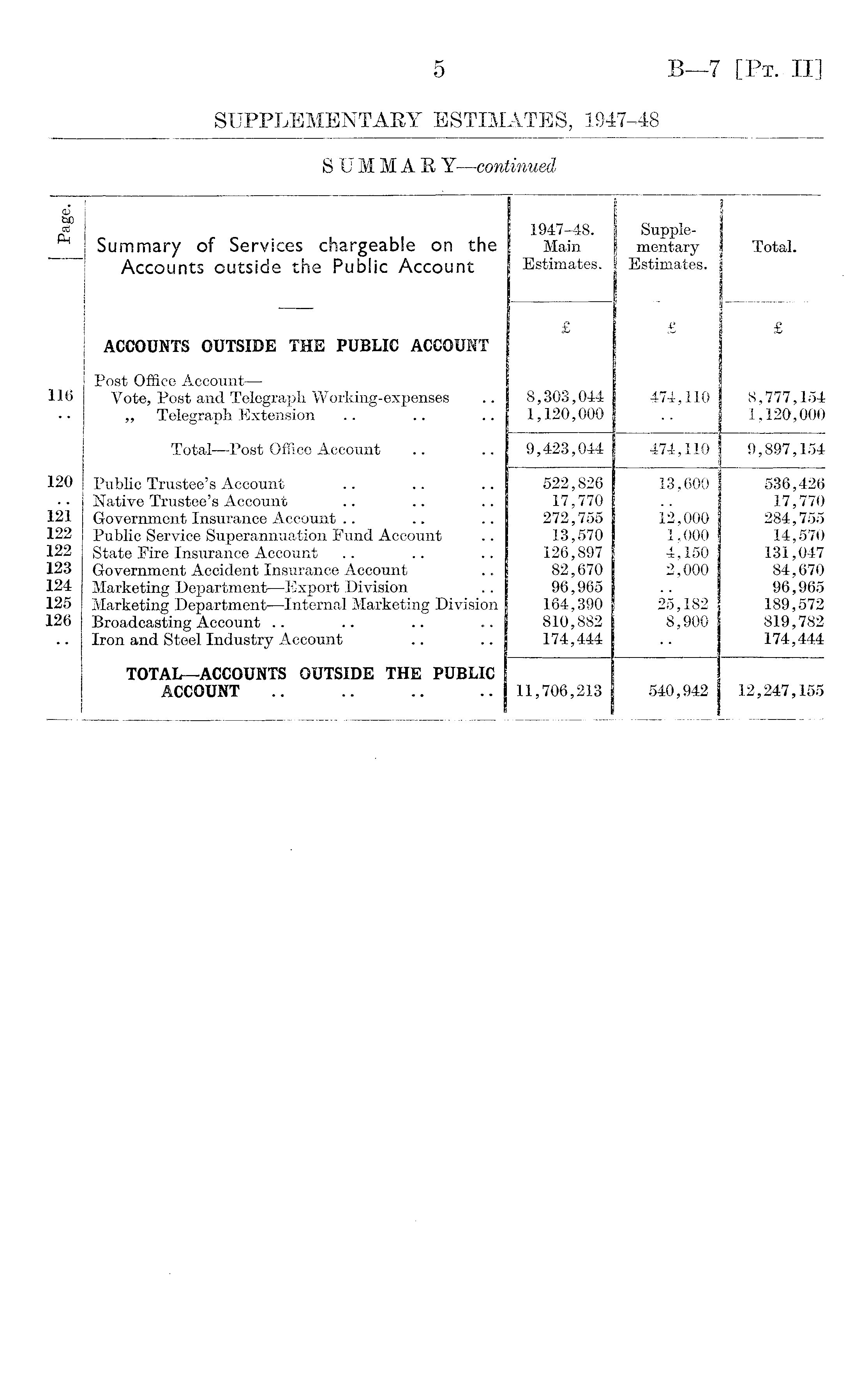 bC 1947-48. SuppleSummary of Services chargeable on the Main mentary Total. Accounts outside the Public Account Estimates. Estimates. ACCOUNTS OUTSIDE THE PUBLIC ACCOUNT £ £ £ Post Office Account—■ 116 Vote, Post and Telegraph Working-expenses 8,303,044 474,110 8,777,154 „ Telegraph Extension Total —Post Office Account Public Trustee's Account 1,120,000 1,120,000 9,423,044 474,110 9,897,154 120 522,826 13,600 536,426 Native Trustee's Account 17,770 17,770 12i Government Insurance Account 272,755 12,000 284,755 122 Public Service Superannuation Fund Account 13,570 1,000 14,570 122 State Fire Insurance Account 126,897 4,150 131,047 123 Government Accident Insurance Account 82,670 2,000 84,670 124 Marketing Department—Export Division 96,965 96,965 125 Marketing Department—Internal Marketing Division 164,390 25,182 189,572 126 Broadcasting Account 810,882 8,900 819,782 •• Iron and Steel Industry Account TOTAL—ACCOUNTS OUTSIDE THE PUBLIC 174,444 174,444 ACCOUNT 11,706,213 540,942 12,247,155