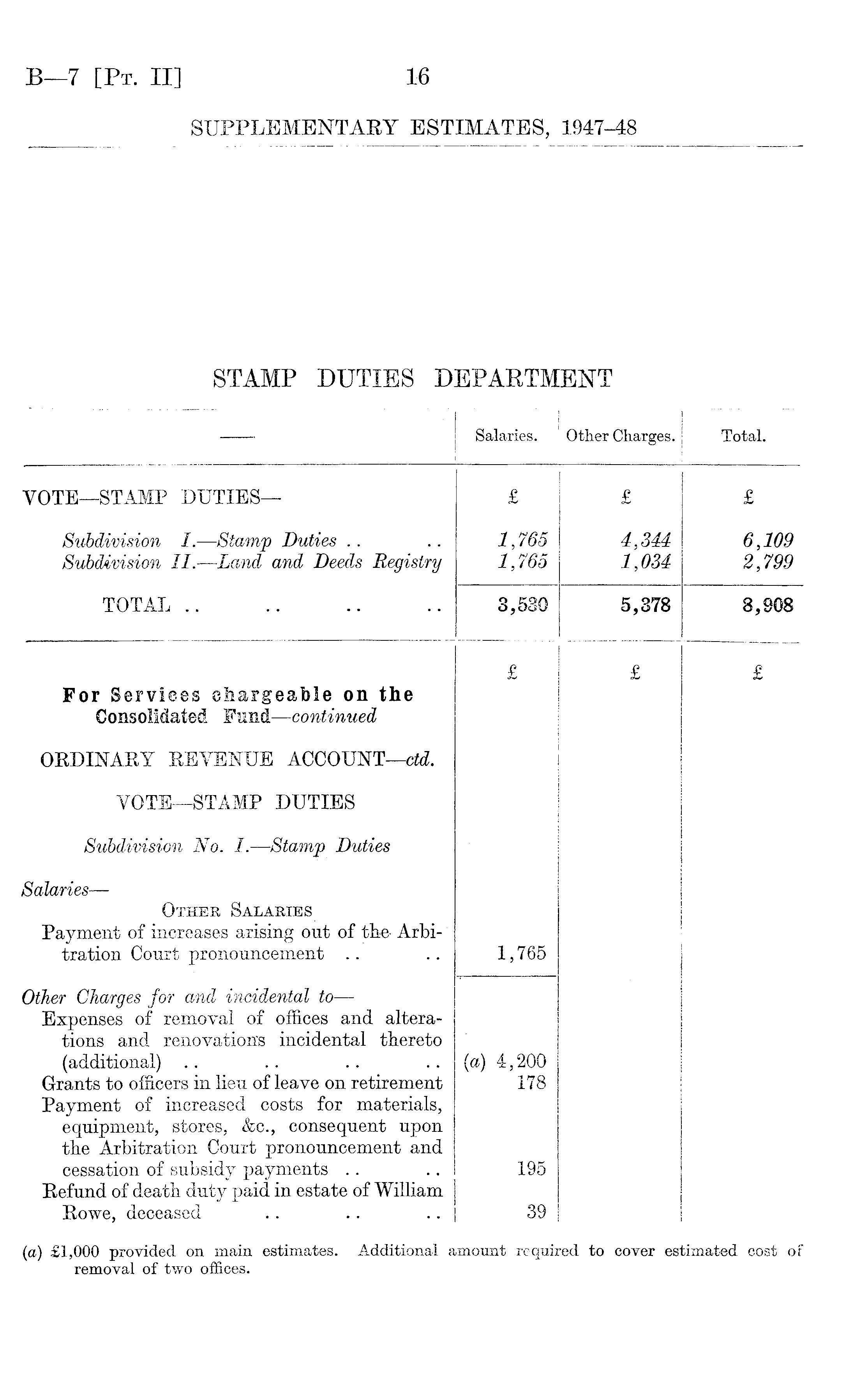 — Salaries. Other Charges. I Total. VOTE—STAMP DUTIES— £ £ £ Subdivision I. —Stamp Duties Subdivision II.—Land and Deeds Registry 1,765 1,765 4,344 1,034 6,109 2,799 TOTAL .. 3,530 5,378 3,908 For Services chargeable on the Consolidated Fund —continued £ £ £ ORDINARY REVENUE ACCOUNT —ctd. VOTE—STAMP DUTIES Subdivision No. I.—Stamp Duties Salaries — Other Salaries Payment of increases arising out of the- Arbitration Court pronouncement 1,765 Other Charges for and incidental to —- Expenses of removal of offices and alterations and renovation's incidental thereto (additional) Grants to officers in lieu of leave on retirement Payment of increased costs for materials, equipment, stores, &c., consequent upon tlie Arbitration Court pronouncement and cessation of subsidy payments Refund of death duty paid in estate of William Rowe, deceased .. .. (a) 4,200 178 195 39 (a) £1,000 provided on main estimates. Additional amount required to cover estimated cost of removal of two offices.