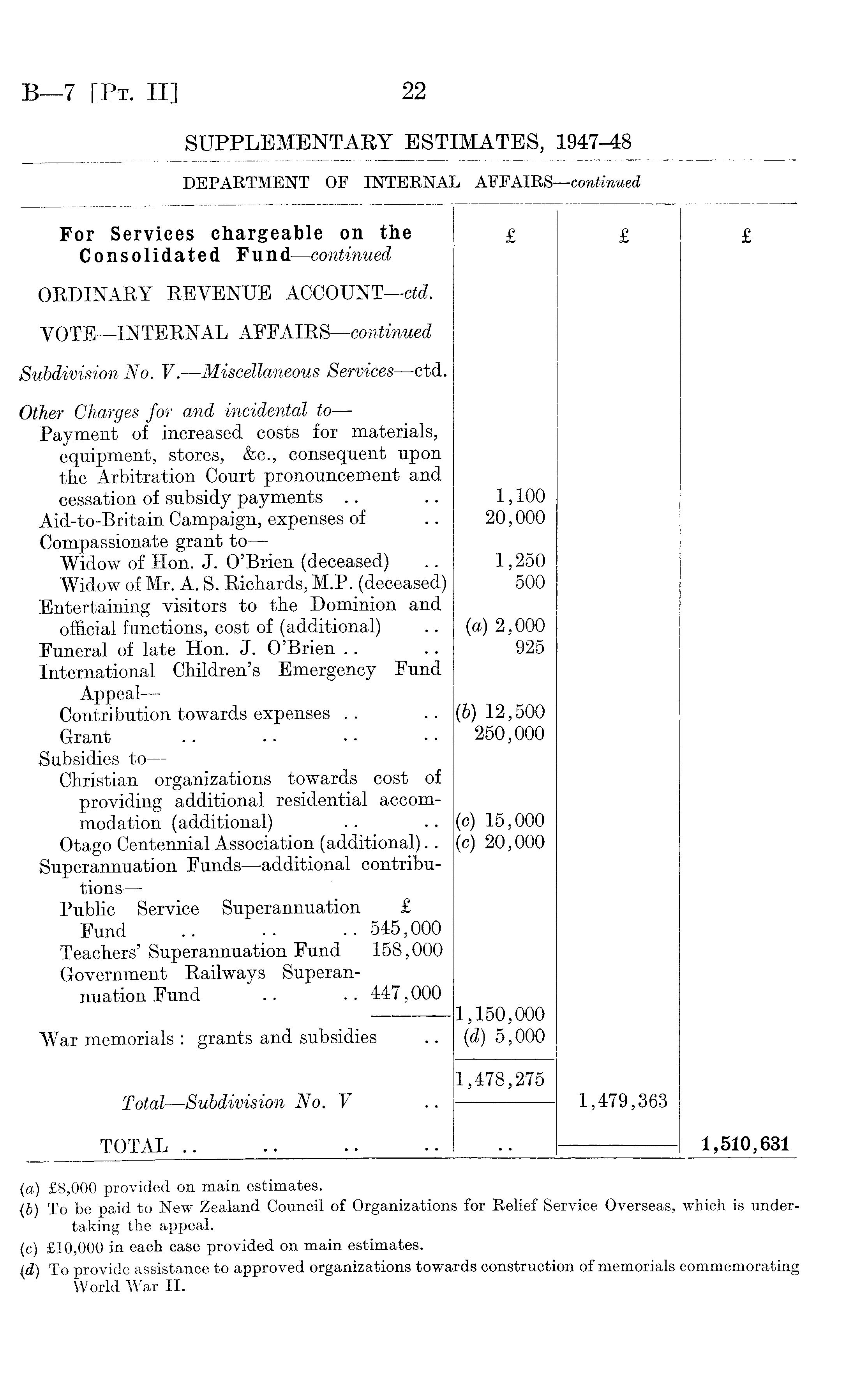 For Services chargeable on the £ £ £ Consolidated Fund — continued ORDINARY REVENUE ACCOUNT— ctd. VOTE—INTERNAL AEFAIRS— continued Subdivision No. V. — Miscellaneous Services —ctd. Other Charges for and incidental to — Payment of increased costs for materials, equipment, stores, &c, consequent upon the Arbitration Court pronouncement and cessation of subsidy payments 1,100 Aid-to-Britain Campaign, expenses of 20,000 Compassionate grant to — Widow of Hon. J. O'Brien (deceased) 1,250 Widow of Mr. A. S. Richards, M.P. (deceased) 500 Entertaining visitors to the Dominion and official functions, cost of (additional) (a) 2,000 Funeral of late Hon. J. O'Brien 925 International Children's Emergency Fund Appeal — Contribution towards expenses (b) 12,500 Grant 250,000 Subsidies to — Christian organizations towards cost of providing additional residential accommodation (additional) (c) 15,000 Otago Centennial Association (additional).. (c) 20,000 Superannuation Funds —additional contributions — Public Service Superannuation £ Fund .. •■ ■- 545,000 Teachers' Superannuation Fund 158,000 Government Railways Superannuation Fund .. ..447,000 1,150,000 War memorials : grants and subsidies (d) 5,000 1,478,275 Total — Subdivision No. V 1,479,363 TOTAL .. 1,510,631