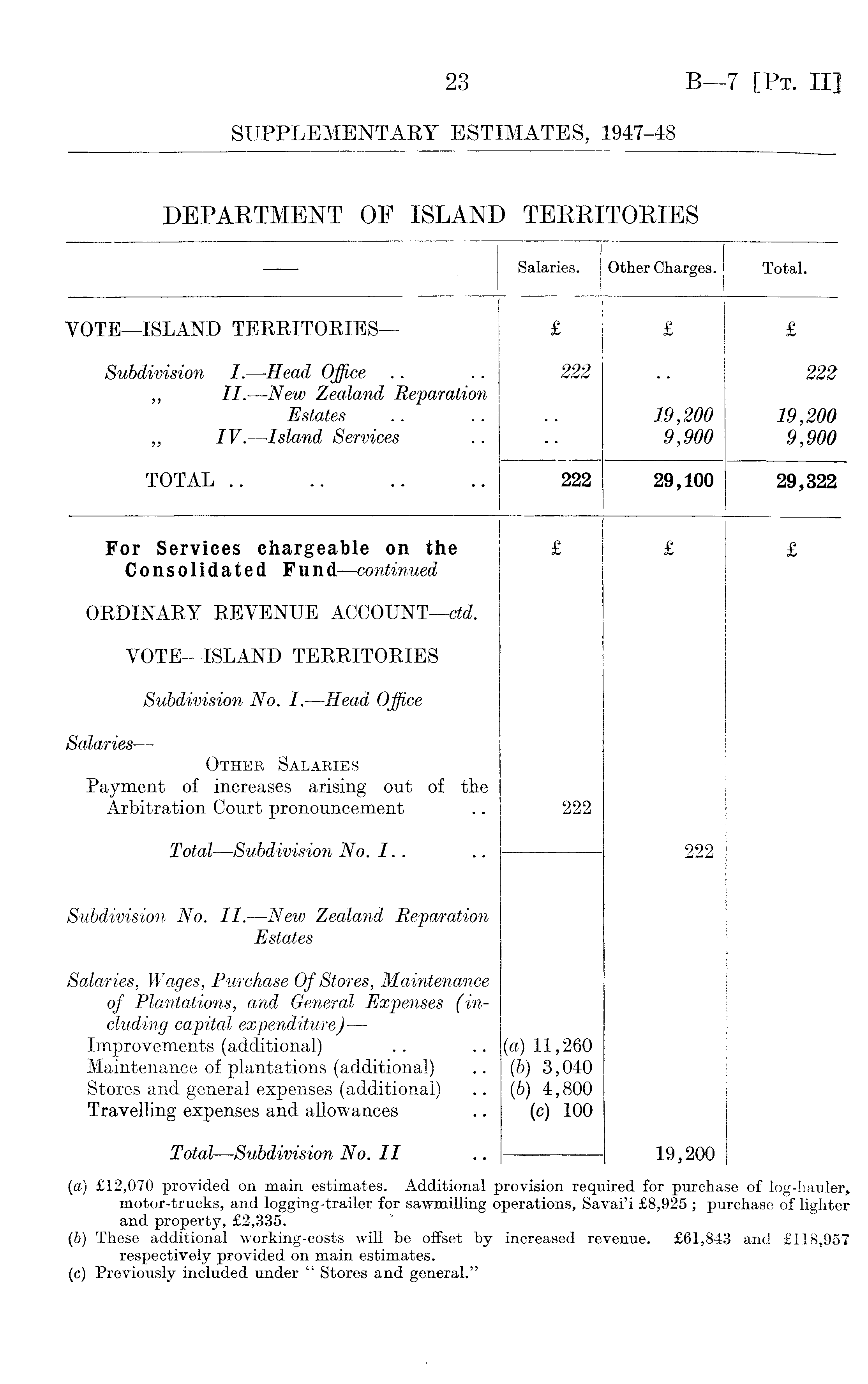 — Salaries. Other Charges. J Total. VOTE—ISLAND TERRITORIES— £ £ £ Subdivision I. —Head Office „ II.—New Zealand Reparation Estates „ IV. —Island Services 222 19,200 9,900 222 19,200 9,900 TOTAL .. 222 29,100 29,322 For Services chargeable on the Consolidated Fund—continued £ £ £ ORDINARY REVENUE ACCOUNT—ctd. VOTE—ISLAND TERRITORIES Subdivision No. I.—Head Office Salaries — Other Salaries Payment of increases arising out of the Arbitration Court pronouncement 222 j i | Total —Subdivision No. I.. 222 Subdivision No. II.—New Zealand Reparation Estates [ Salaries, Wages, Purchase Of Stores, Maintenance of Plantations, and General Expenses (including capital expenditure) — Improvements (additional) Maintenance of plantations (additional) Stores and general expenses (additional) Travelling expenses and allowances (a) 11,260 (b) 3,040 (b) 4,800 (c) 100 j i Total —Subdivision No. II 19,200
