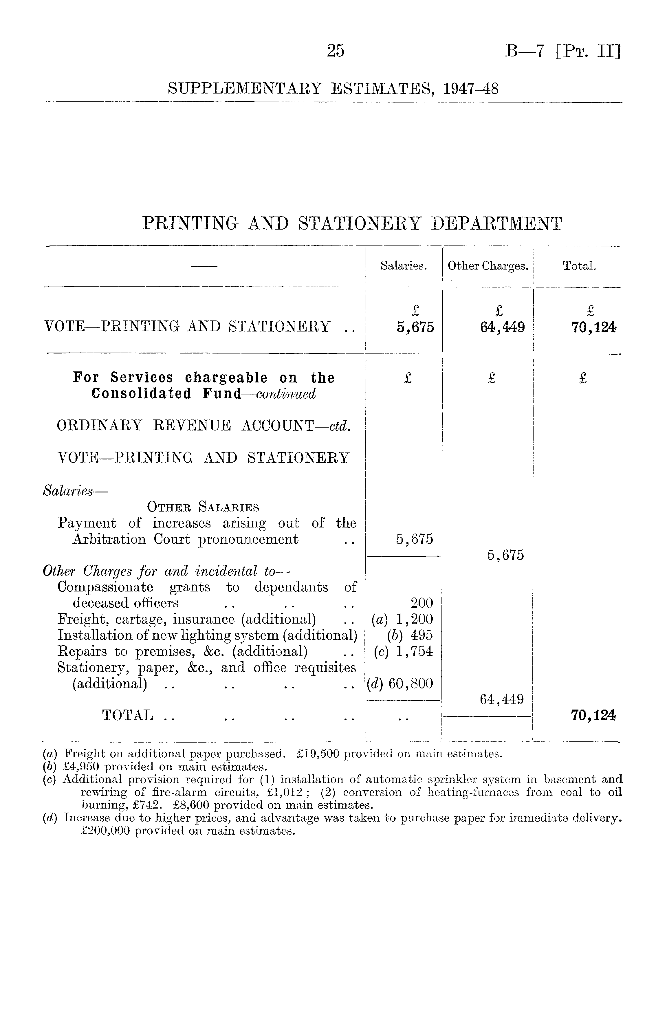 (a) Freight on additional paper purchased. £19,500 provided on main estimates. (b) £4,950 provided on main estimates. (c) Additional provision required for (1) installation of automatic sprinkler system in basement and rewiring of fire-alarm circuits, £1,012 ; (2) conversion of heating-furnaces from coal to oil burning, £742. £8,600 provided on main estimates. (d) Increase due to higher prices, and advantage was taken to purchase paper for immediate delivery. £200,000 provided on main estimates.
