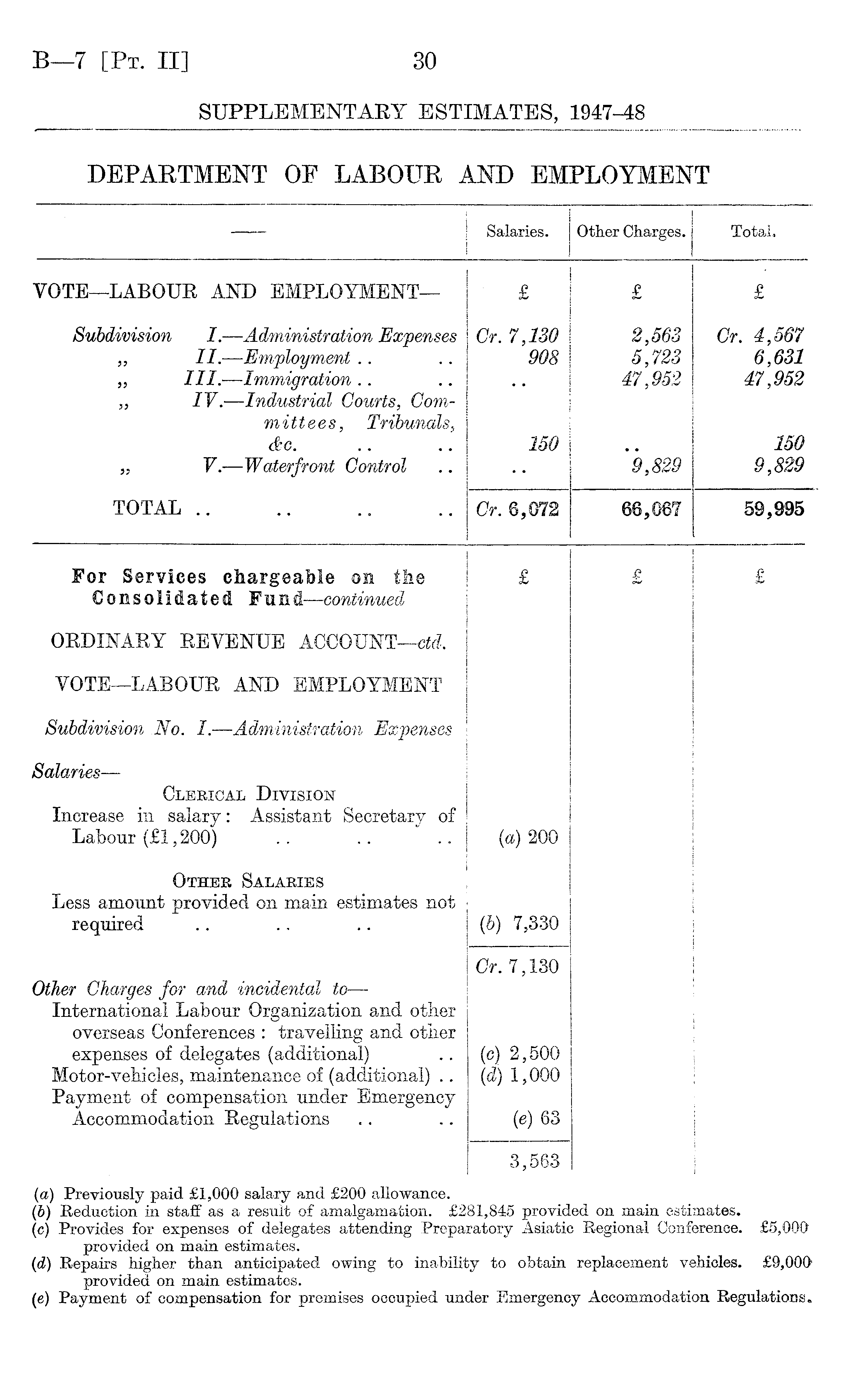 (а) Previously paid £l,OOO salary and £2OO allowance. (б) Reduction in staff as a result of amalgamation. £281,845 provided on main estimates. (c) Provides for expenses of delegates attending Preparatory Asiatic Regional Conference. £5,000 provided on main estimates. (d) Repairs higher than anticipated owing to inability to obtain replacement vehicles. £9,000 provided on main estimates. (c) Payment of compensation for premises occupied under Emergency Accommodation Regulations.