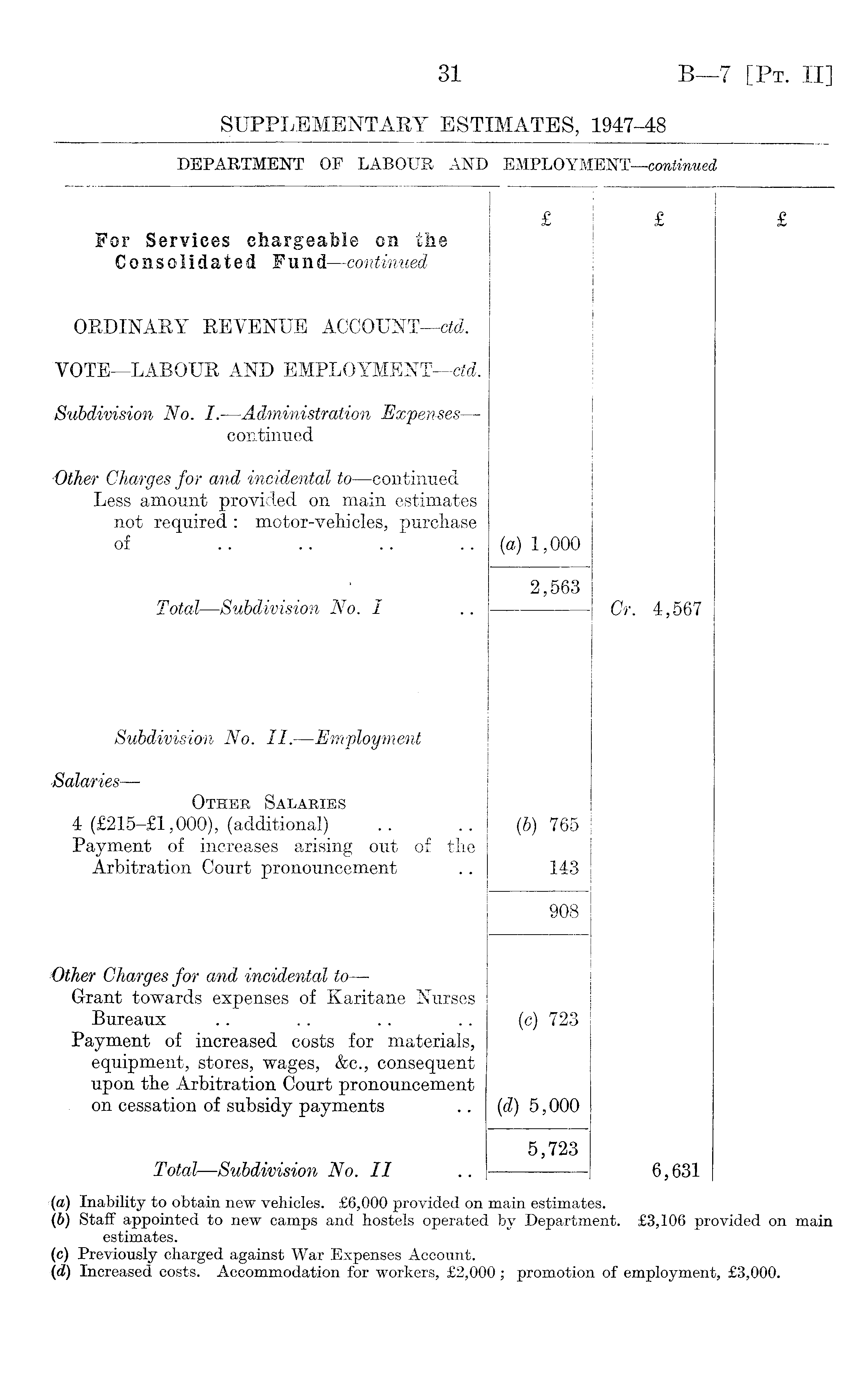 For Serviees chargeable on the Consolidated Fund —continued £ £ £ ORDINARY REVENUE ACCOUNT —ctd. TOTE—LABOUR AND EMPLOYMENT —ctd. .Subdivision No. I.—Administration Expenses— continued Other Charges for and incidental to —continued Less amount provided on main estimates not required : motor-vehicles, purchase of (a) 1,000 Total—-Subdivision No. I Subdivision No. II. —Employment ■Salaries— Other Salaries 4 (£215-£1,000), (additional) Payment of increases arising out of the Arbitration Court pronouncement 2,563 Cr. 4,567 (b) 765 143 908 Other Charges for and incidental to — Grant towards expenses of Karitane Nurses Bureaux Payment of increased costs for materials, equipment, stores, wages, &c., consequent upon the Arbitration Court pronouncement on cessation of subsidy payments (c) 723 (d) 5,000 Total—Subdivision No. II 5,723 6,631