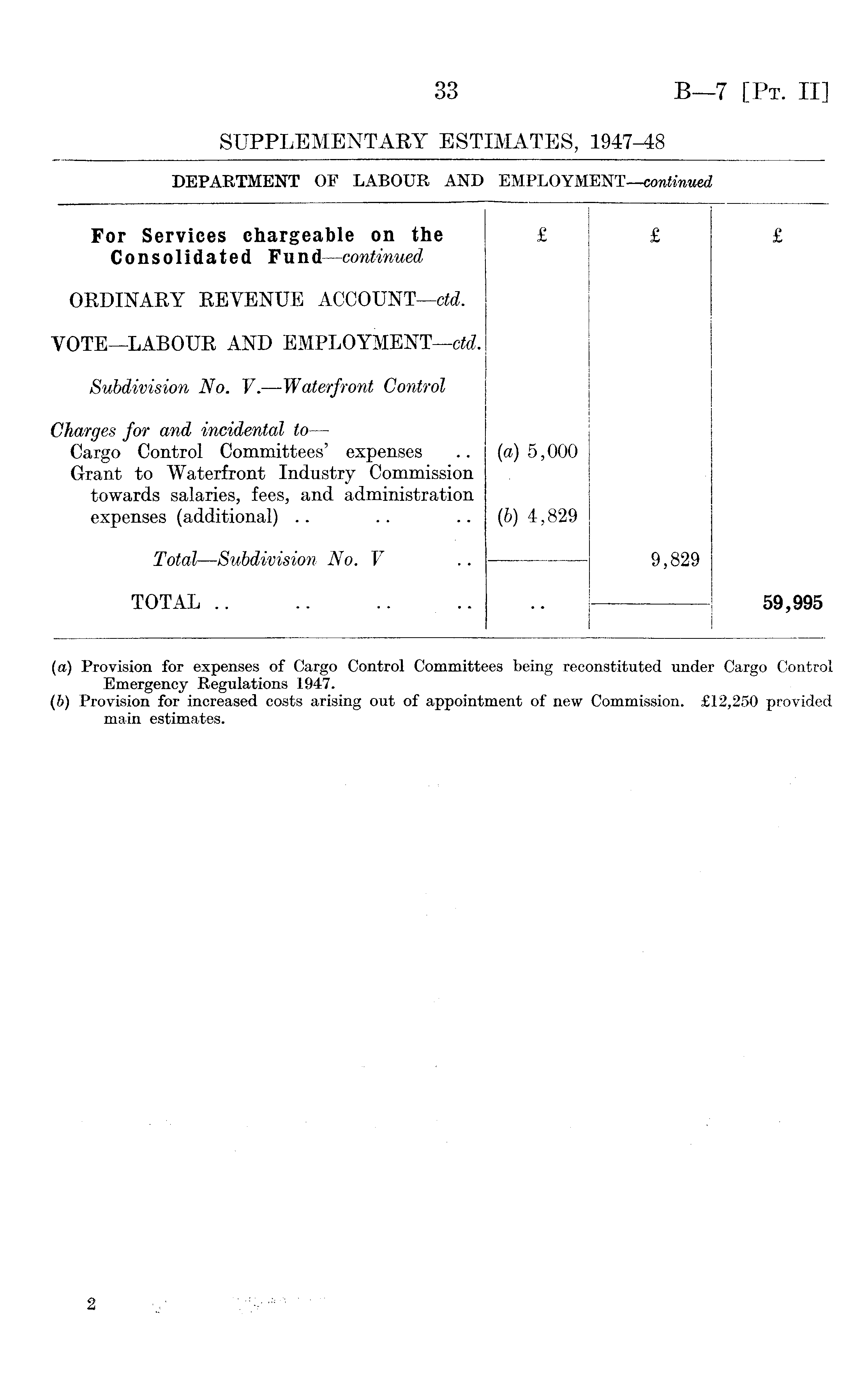 For Services chargeable on the Consolidated Fund —continued £ £ £ ORDINARY REVENUE ACCOUNT —ctd. VOTE—LABOUR AND EMPLOYMENT —ctd. Subdivision No. V.—Waterfront Control Charges for and incidental to — Cargo Control Committees' expenses Grant to Waterfront Industry Commission towards salaries, fees, and administration expenses (additional) (а) 5,000 (б) 4,829 Total —Subdivision No. V 9,829 TOTAL 59,995 i (а) Provision for expenses of Cargo Control Committees being reconstituted under Cargo Control Emergency Regulations 1947. (б) Provision for increased costs arising out of appointment of new Commission. £12,250 provided main estimates.