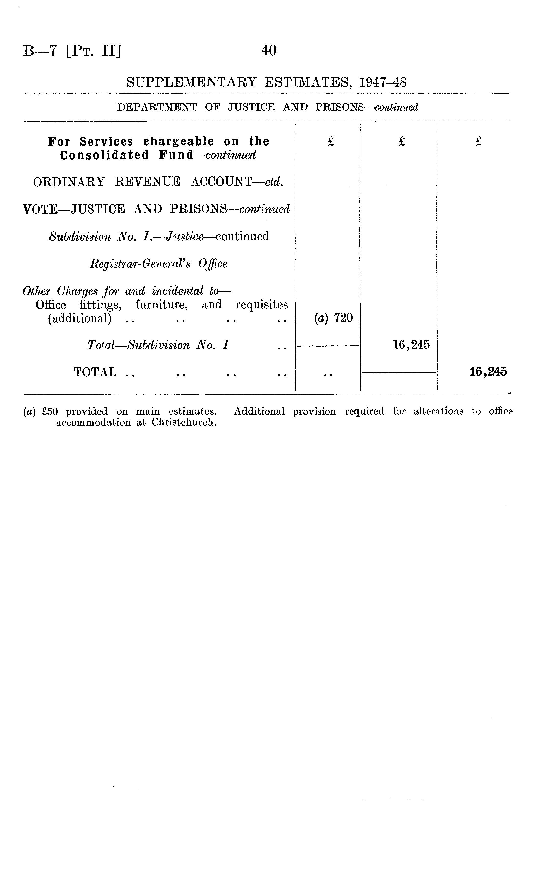 For Services chargeable on the Consolidated Fund —continued £ £ £ ORDINARY REVENUE ACCOUNT—ctd. VOTE—JUSTICE AND PRISONS —continued Subdivision No. I.—Justice—continued Registrar-General's Office Other Charges for and incidental to — Office fittings, furniture, and requisites (additional) (a) 720 | Total—Subdivision No. I 16,245 TOTAL 16,245 (a) £50 provided on main estimates. Additional provision required accommodation at Christchurch. for alterations to office