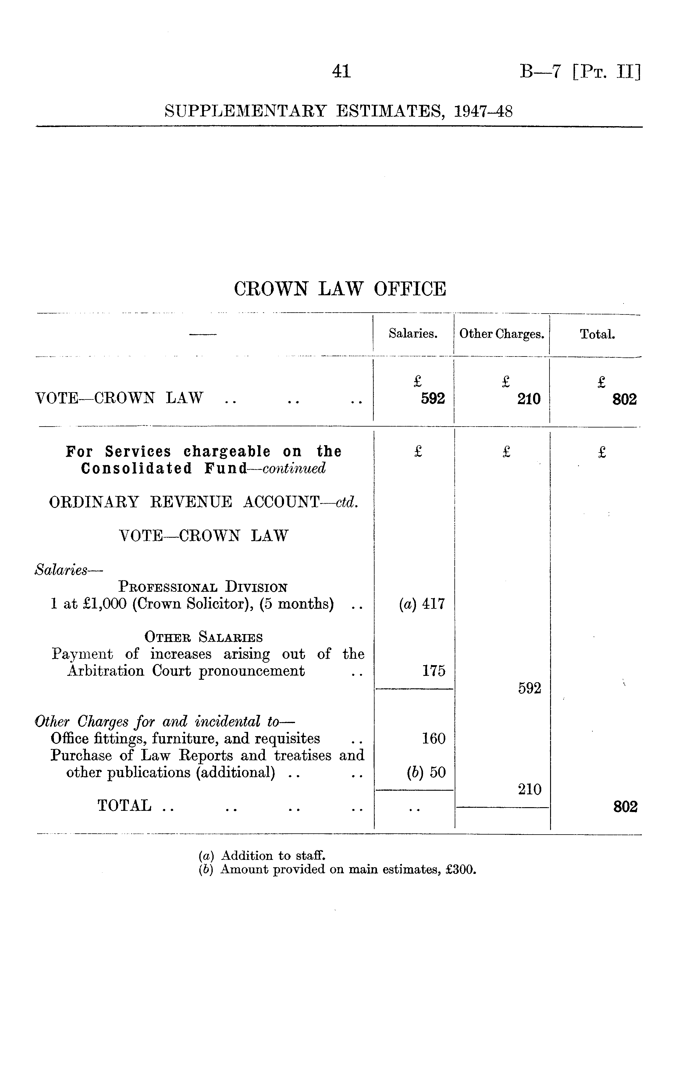 — Salaries. Other Charges. Total. VOTE—CROWN LAW .. £ 592 £ 210 £ 802 For Services chargeable on the Consolidated Fund—continued £ £ £ ORDINARY REVENUE ACCOUNT—ctd. VOTE—CROWN LAW Salaries— Professional Division 1 at £1,000 (Crown Solicitor), (5 months) .. (a) 417 Other Salaries Payment of increases arising out of the Arbitration Court pronouncement 175 592 Other Charges for and incidental to — Office fittings, furniture, and requisites Purchase of Law Reports and treatises and other publications (additional) 160 (6) 50 210 TOTAL 802 (a) Addition to staff. (b) Amount provided on main estimates, £300.