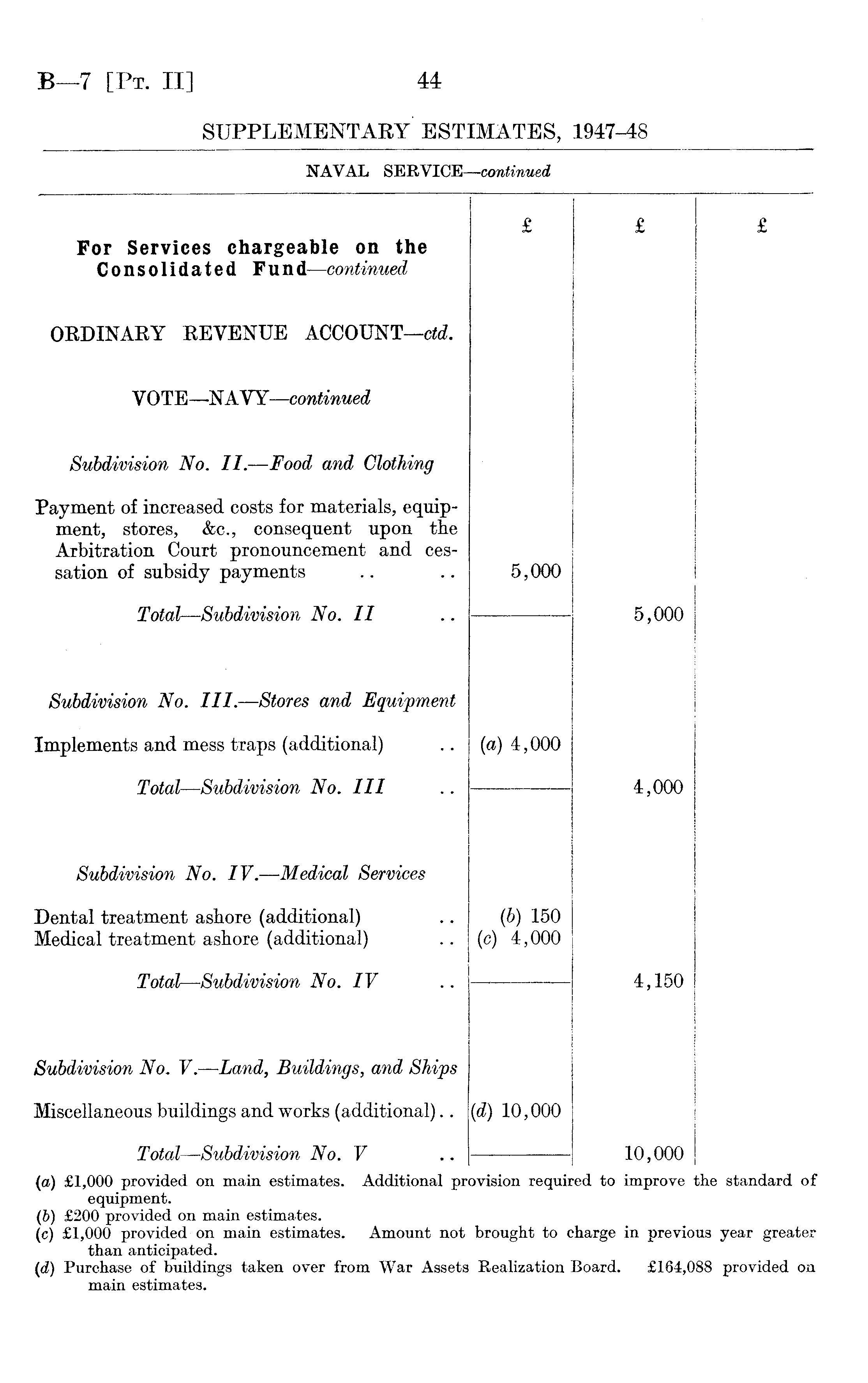 For Services chargeable on the Consolidated Fund—continued £ £ £ ORDINARY REVENUE ACCOUNT —ctd. VOTE—NAVY —continued j Subdivision No. II.—Food and Clothing Payment of increased costs for materials, equipment, stores, &c., consequent upon the Arbitration Court pronouncement and cessation of subsidy payments 5,000 Total—Subdivision No. II 5,000 Subdivision No. III.—Stores and Equipment i Implements and mess traps (additional) (a) 4,000 Total—Subdivision No. Ill 4,000 Subdivision No. IV. —Medical Services Dental treatment ashore (additional) Medical treatment ashore (additional) (b) 150 (c) 4,000 Total—Subdivision No. IV 4,150 Subdivision No. V. —Land, Buildings, and Ships Miscellaneous buildings and works (additional).. (d) 10,000 Total—Subdivision No. V 10,000