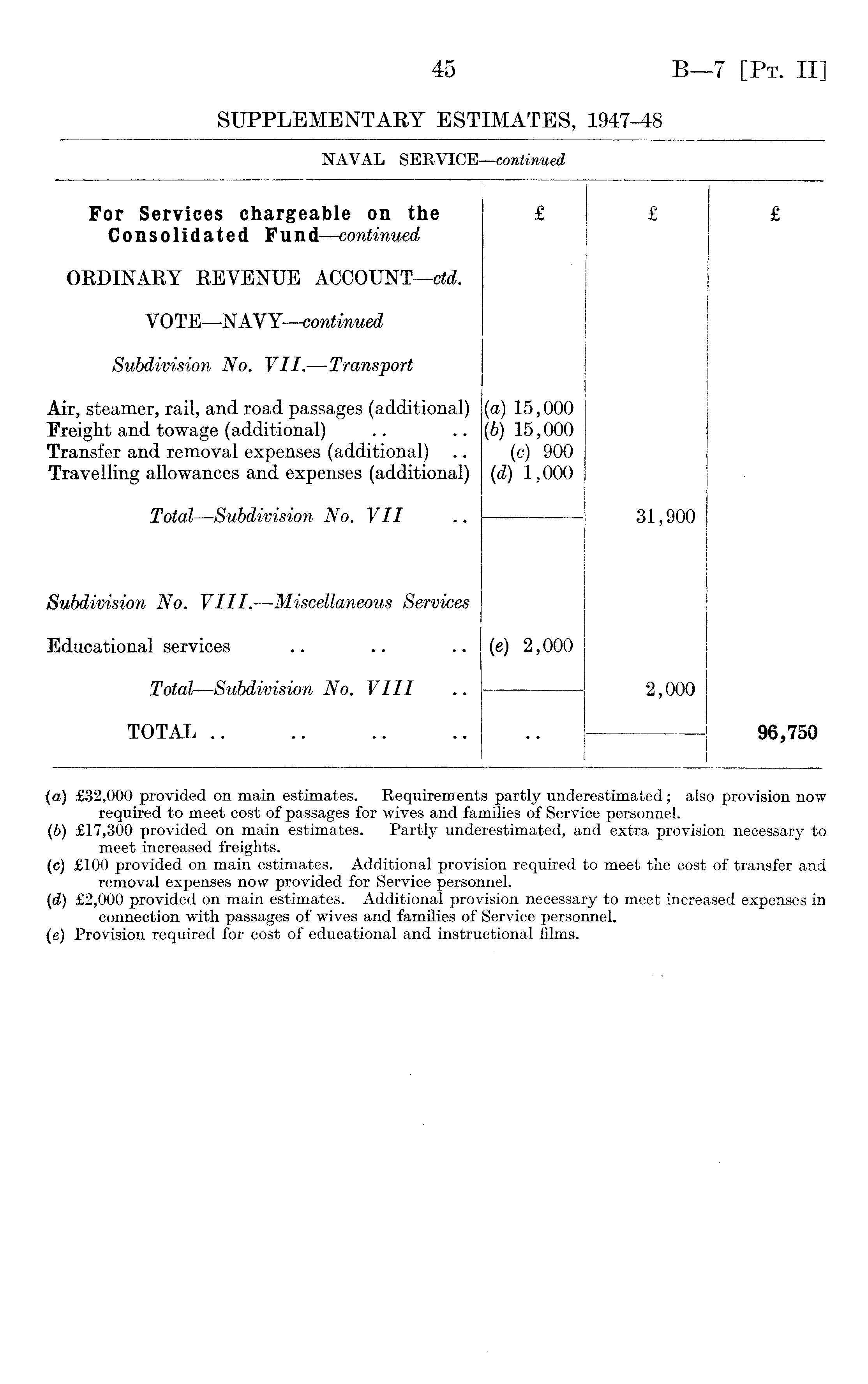 For Services chargeable on the Consolidated Fund—continued £ £ £ ORDINARY REVENUE ACCOUNT —ctd. VOTE —NAVY —continued Subdivision No. VII. —Transport j i Air, steamer, rail, and road passages (additional) Freight and towage (additional) Transfer and removal expenses (additional) .. Travelling allowances and expenses (additional) 1 (a) 15,000 (b) 15,000 (c) 900 (d) 1,000 1 Total—Subdivision No. VII 31,900 Subdivision No. VIII.—Miscellaneous Services Educational services (e) 2,000 Total —Subdivision No. VIII 2,000 TOTAL .. 96,750