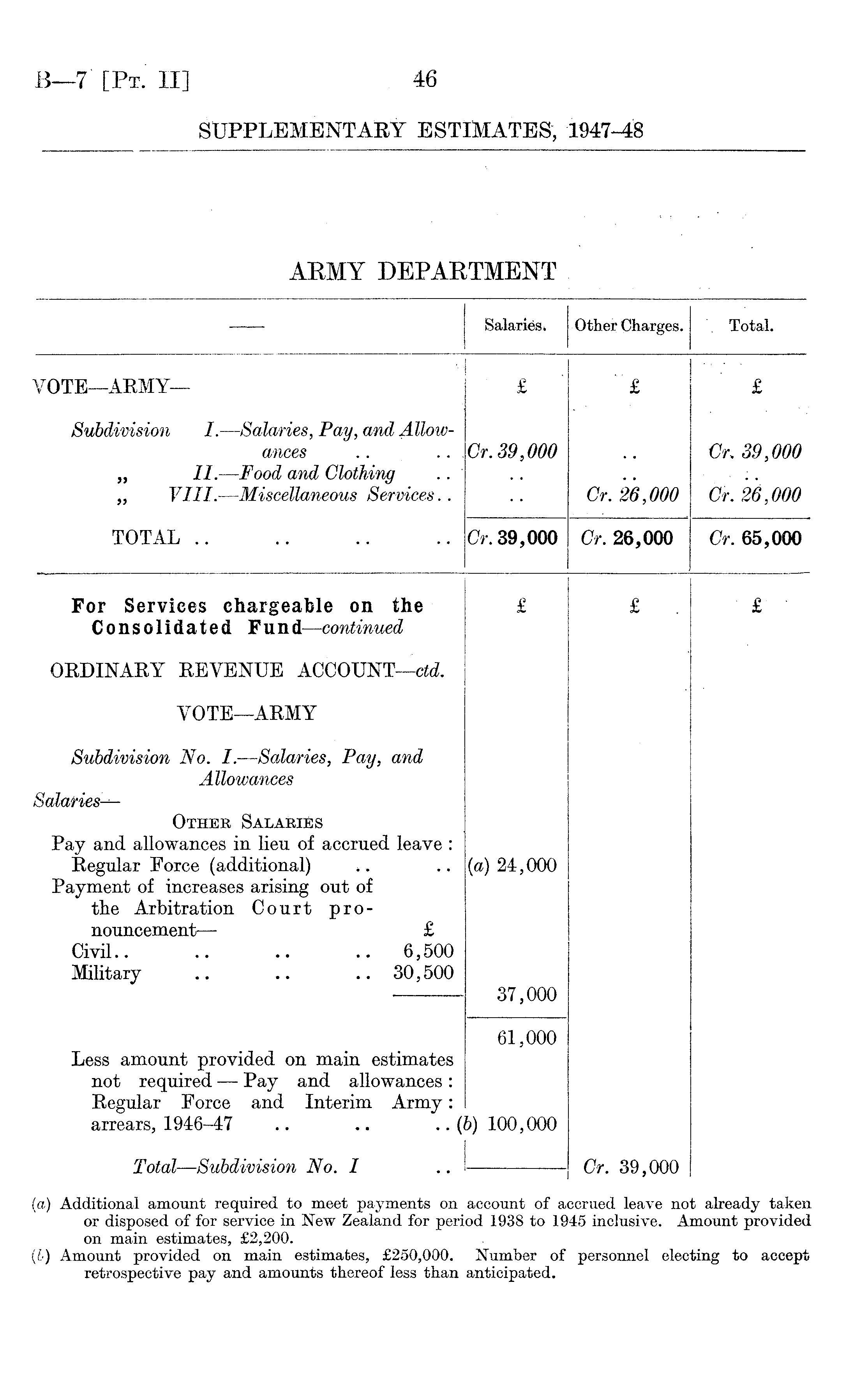 — Salaries. Other Charges. Total. VOTE—ARMY— Subdivision I.—Salaries, Pay, and Allowances . . . . : „ II —Food and Clothing „ VIII. —Miscellaneous Services.. TOTAL .. £ Cr. 39,000 "£ Cr. 26,000 £ Cr, 39,000 Cr. 26,000 Cr. 39,000 Cr. 26,000 Cr. 65,000 For Services chargeable on the Consolidated Fund—continued ORDINARY REVENUE ACCOUNT—etd. VOTE—ARMY Subdivision No. I.—Salaries, Pay, and Allowances Salaries- j - Other Salaries Pay and. allowances in lien of accrued leave : Regular Force (additional) Payment of increases arising out of the Arbitration Court pronouncement — £ Civil.. .. .. .. 6,500 Military .. .. .. 30,500 Less amount provided on main estimates not required — Pay and allowances : Regular Force and Interim Army: arrears, 1946-47 .. .. .. (i Total—Subdivision No. I £ (a) 24,000 37,000 61,000 b) 100,000 £ . Cr. 39,000 ' £- '