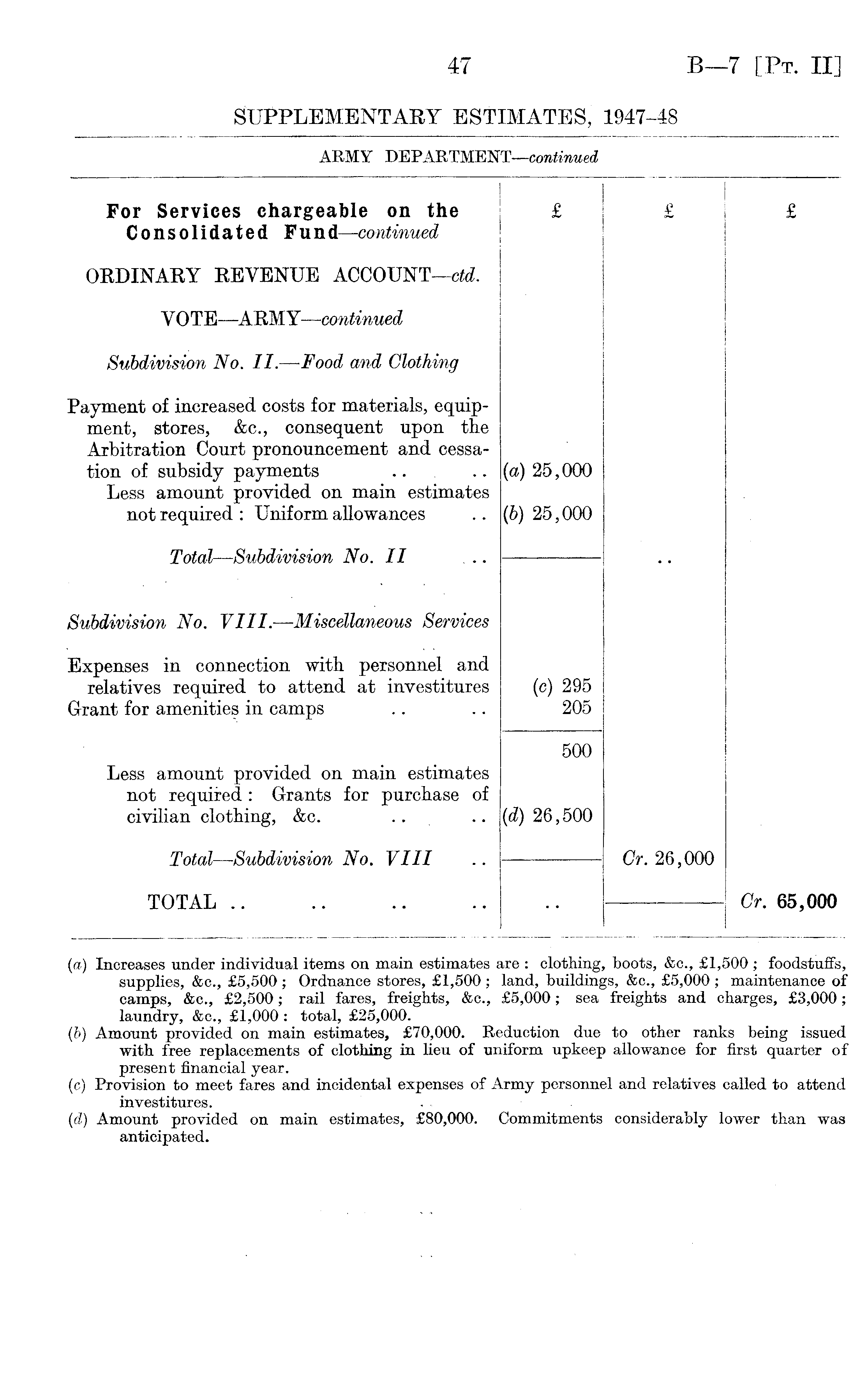 For Services chargeable on the Consolidated Fund — continued £ £ £ ORDINARY REVENUE ACCOUNT— ctd. VOTE—ARMY— continued Subdivision No. II.—Food and Clothing Payment of increased costs for materials, equipment, stores, fee, consequent upon the Arbitration Court pronouncement and cessation of subsidy payments Less amount provided on main estimates not required : Uniform allowances (a) 25,000 (6) 25,000 ■ Total — Subdivision No. II Subdivision No. VIII. — Miscellaneous Services Expenses in connection with personnel and relatives required to attend at investitures Grant for amenities in camps (c) 295 205 Less amount provided on main estimates not required : Grants for purchase of civilian clothing, &c. 500 (d) 26,500 Total — Subdivision No. VIII TOTAL .. Or. 26,000 •• Cr. 65,000