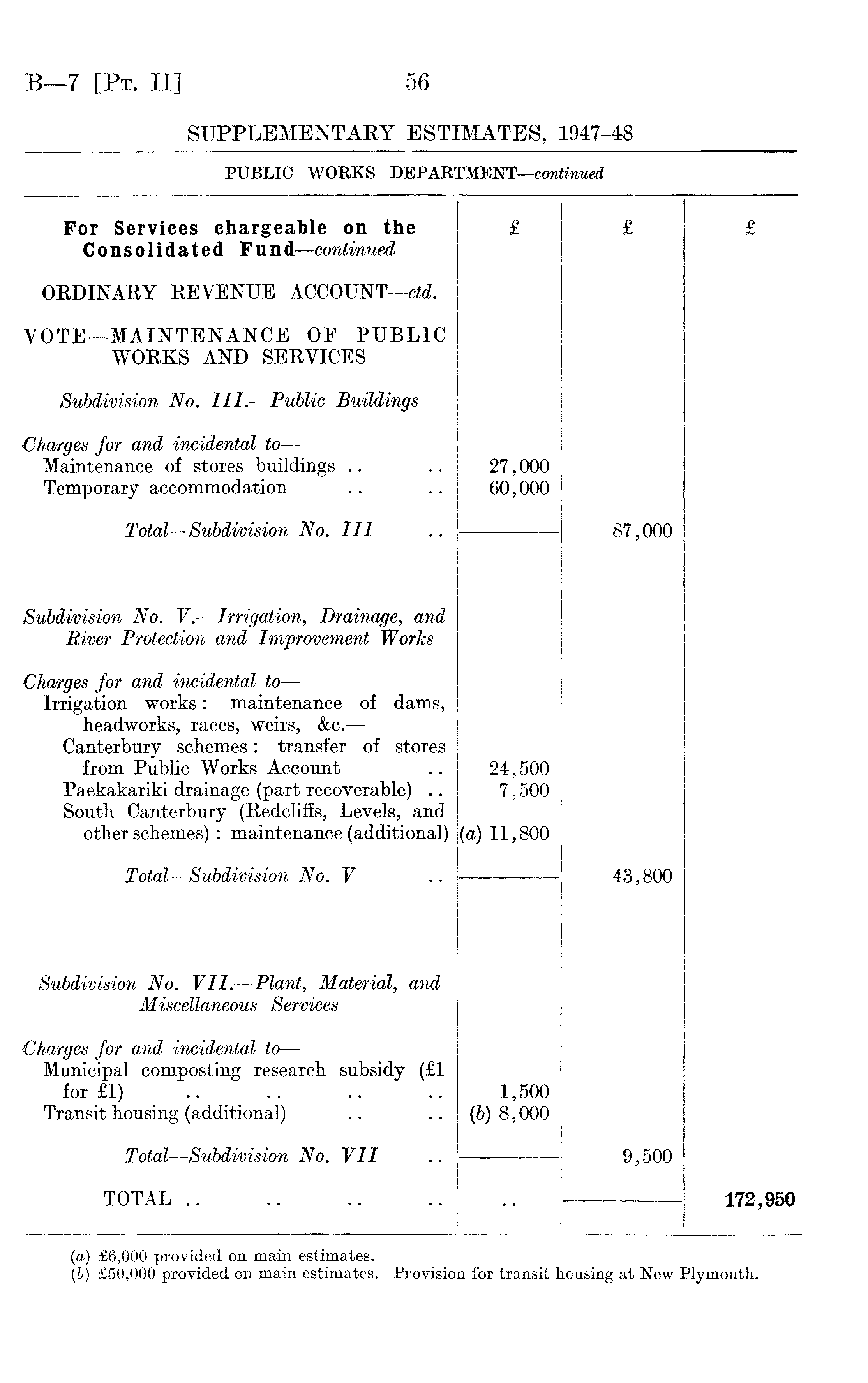 For Services chargeable on the Consolidated Fund —continued £ £ £ ORDINARY REVENUE ACCOUNT—ctd. VOTE—MAINTENANCE OF PUBLIC WORKS AND SERVICES Subdivision No. III.—Public Buildings Charges for and incidental to— Maintenance of stores buildings Temporary accommodation 27,000 60,000 Total—Subdivision No. Ill 87,000 Subdivision No. V.—Irrigation, Drainage, and River Protection and Improvement Worhs Charges for and incidental to — Irrigation works: maintenance of dams, head works, races, weirs, &c. — Canterbury schemes: transfer of stores from Public Works Account Paekakariki drainage (part recoverable) -. South Canterbury (Redcliffs, Levels, and other schemes): maintenance (additional) 24,500 7,500 (a) 11,800 Total—Subdivision No. V 43,800 Subdivision No. VII. —Plant, Material, and Miscellaneous Services Charges for and incidental to — Municipal composting research subsidy (£1 for £1) Transit housing (additional) 1,500 (b) 8,000 Total—Subdivision No. VII 9,500 TOTAL .. 172,950 (a) £6,000 provided on main estimates. (b) £50,000 provided on main estimates. Provision for transit housing at New Plymouth.