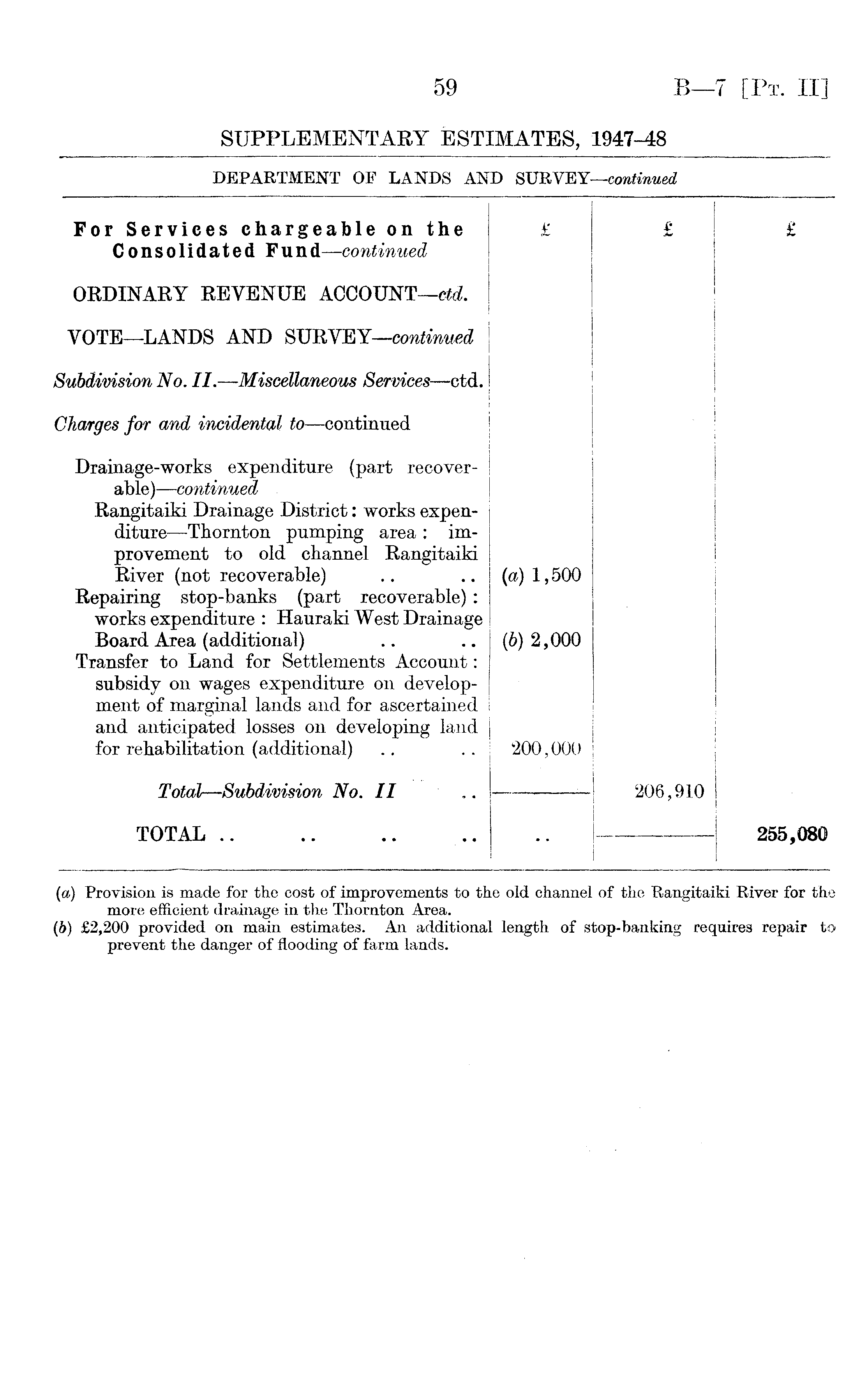 For Services chargeable on the Consolidated Fund —continued £ £ £ ORDINARY REVENUE ACCOUNT—ctd. VOTE—LANDS AND SURVEY—continued Subdivision No. II. —Miscellaneous Services—ctd. Charges for and incidental to—continued j Drainage-works expenditure (part recoverable) —continued Rangitaiki Drainage District: works expenditure —Thornton pumping area : improvement to old channel Rangitaiki River (not recoverable) Repairing stop-banks (part recoverable): works expenditure : Hauraki West Drainage Board Area (additional) Transfer to Land for Settlements Account: subsidy on wages expenditure on development of marginal lands and for ascertained and anticipated losses on developing land for rehabilitation (additional) (а) 1,500 (б) 2,000 200,000 Total —Subdivision No. II , 206,910 TOTAL .. 255,080 (a) Provision is made for the cost of improvements to the old channel of the Rangitaiki River for the more efficient drainage in the Thornton Area. (b) £2,200 provided on main estimates. An additional length of stop-banking requires repair to prevent the danger of flooding of farm lands.