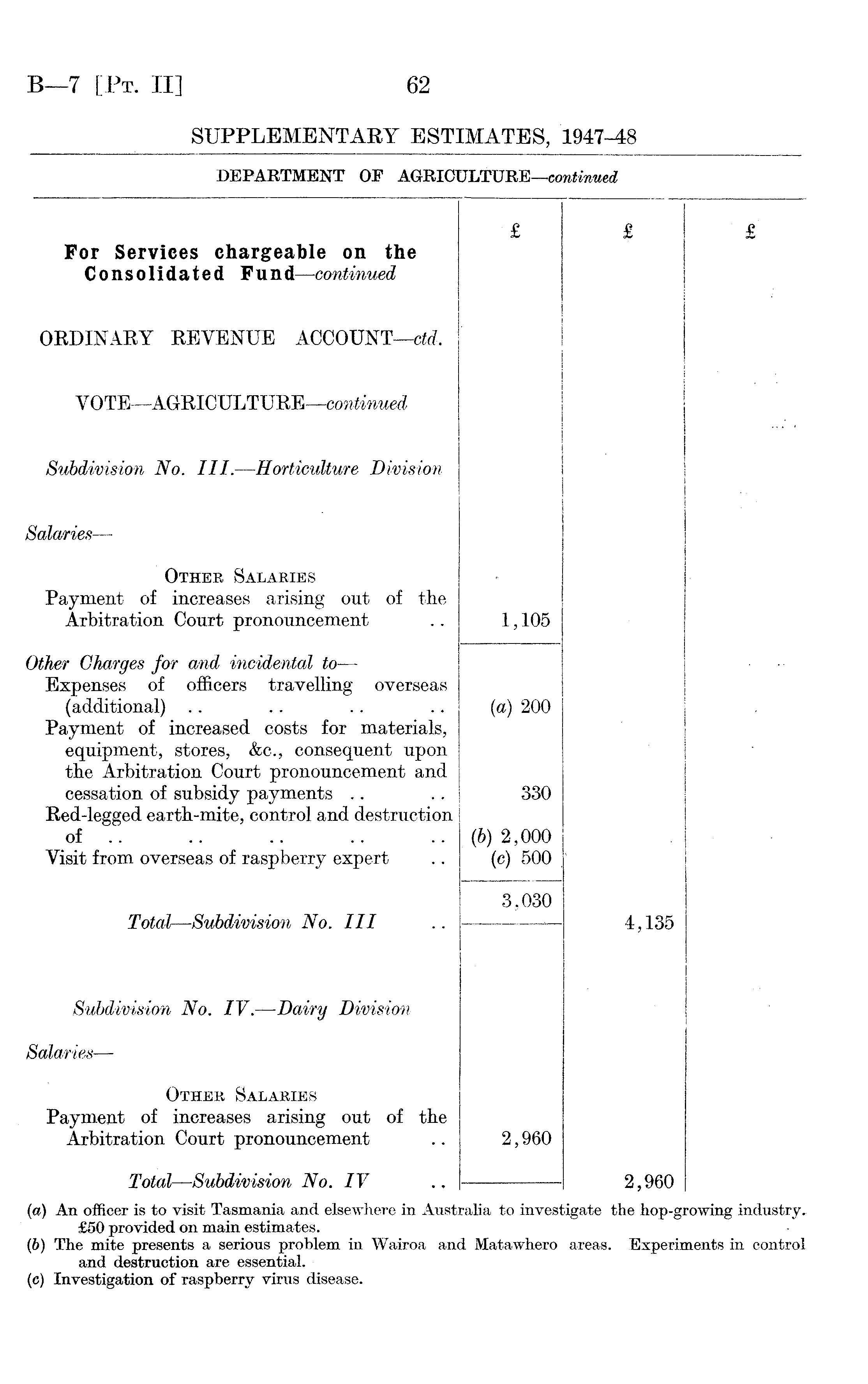 For Services chargeable on the Consolidated Fund—continued £ £ £ ORDINARY REVENUE ACCOUNT—ctd, V OTE —AGRICULTURE—continued i | Subdivision No. III. —Horticulture Division I i ! ! ... i Salaries — . ■ Other Salaries Payment of increases arising out of the Arbitration Court pronouncement 1,105 Other Charges for and incidental to — Expenses of officers travelling overseas (additional) Payment of increased costs for materials, equipment, stores, &c., consequent upon the Arbitration Court pronouncement and cessation of subsidy payments Red-legged earth-mite, control and destruction of Visit from overseas of raspberry expert (a) 200 330 (6) 2,000 (c) 500 Total—Subdivision No. Ill 3,030 4,135 i Subdivision No. IV. —Dairy Division Salaries — Other Salaries Payment of increases arising out of the Arbitration Court pronouncement 2,960 Total—Subdivision No. IV 2,960