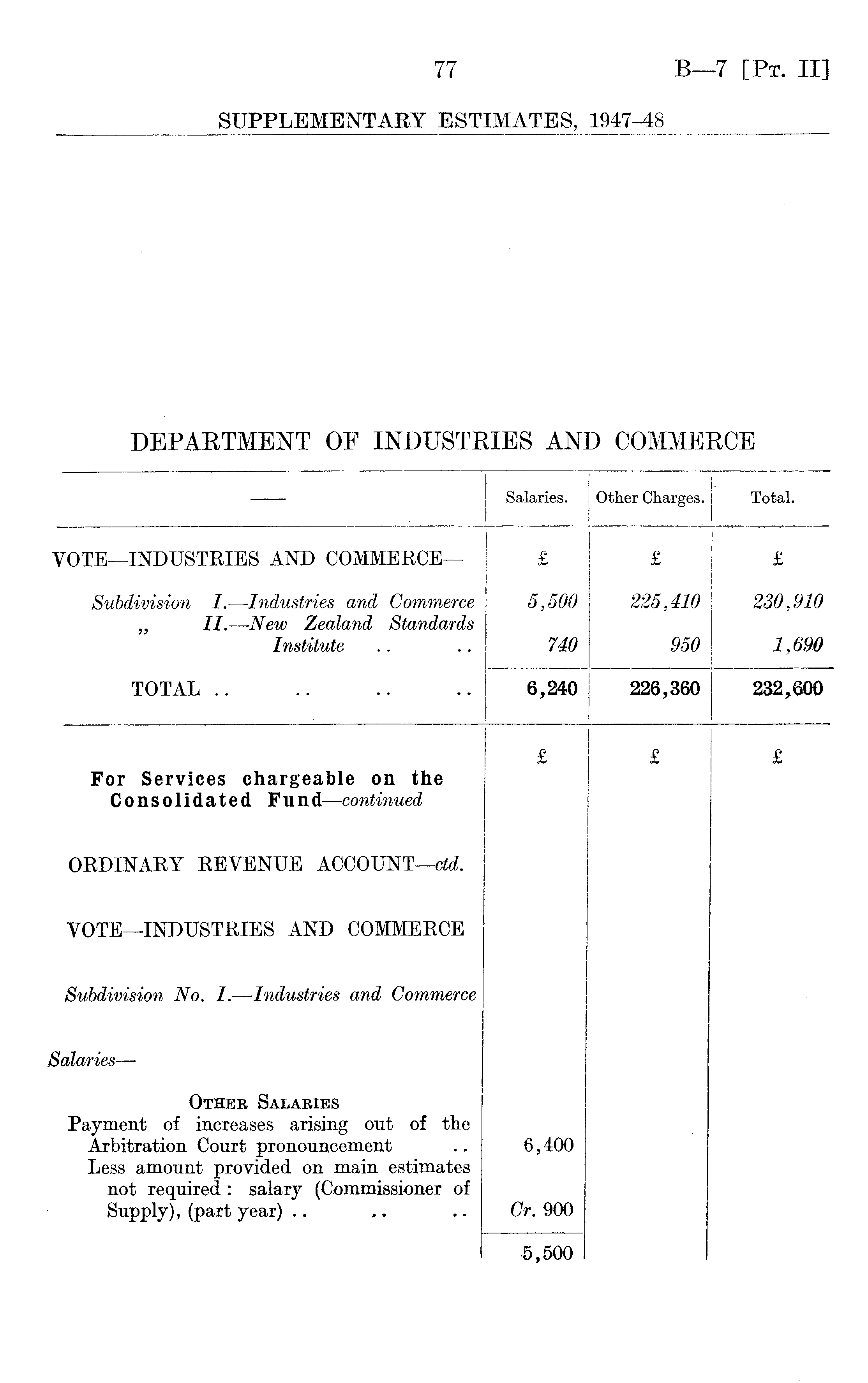 — Salaries. Other Charges. Total. VOTE—INDUSTRIES AND COMMERCE— £ £ £ Subdivision I. —Industries and Commerce „ II. —New Zealand Standards Institute 5,500 740 225,410 950 230,910 1,690 TOTAL 6,240 226,360 232,600 For Services chargeable on the Consolidated Fund —continued £ £ £ ORDINARY REVENUE ACCOUNT —ctd. VOTE—INDUSTRIES AND COMMERCE Subdivision No. I. —Industries and Commerce Salaries — Other Salaries Payment of increases arising out of the Arbitration Court pronouncement Less amount provided on main estimates not required : salary (Commissioner of Supply), (part year) 6,400 Cr. 900 5,500
