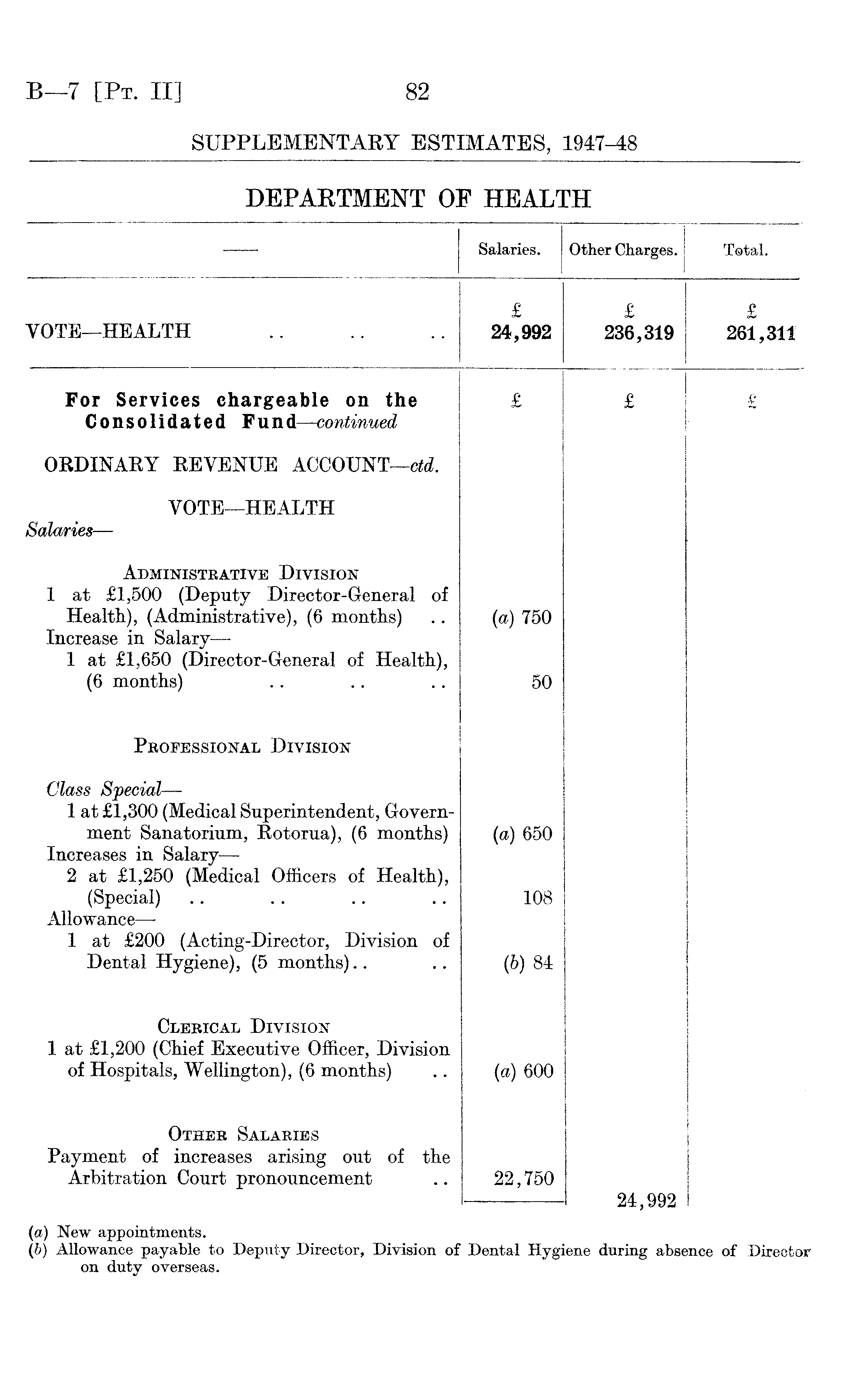 — Salaries. Other Charges. Total. VOTE—HEALTH £ 24,992 £ 236,319 £ 261,311 For Services chargeable on the Consolidated Fund—continued £ £ £ ORDINARY REVENUE ACCOUNT —ctd. VOTE—HEALTH Salaries— Administrative Division 1 at £1,500 (Deputy Director-General of Health), (Administrative), (6 months) Increase in Salary — 1 at £1,650 (Director-General of Health), (6 months) (a) 750 50 Professional Division Class Special— 1 at £1,300 (Medical Superintendent, Government Sanatorium, Rotorua), (6 months) Increases in Salary- — 2 at £1,250 (Medical Officers of Health), (Special) Allowance— 1 at £200 (Acting-Director, Division of Dental Hygiene), (5 months) (a) 650 108 (b) 84 Clerical Division 1 at £1,200 (Chief Executive Officer, Division of Hospitals, Wellington), (6 months) (a) 600 Other Salaries Payment of increases arising out of the Arbitration Court pronouncement 22,750 24,992 (a) New appointments. (b) Allowance payable to Deputy Director, Division of Dental Hygiene during absence of Director on duty overseas.