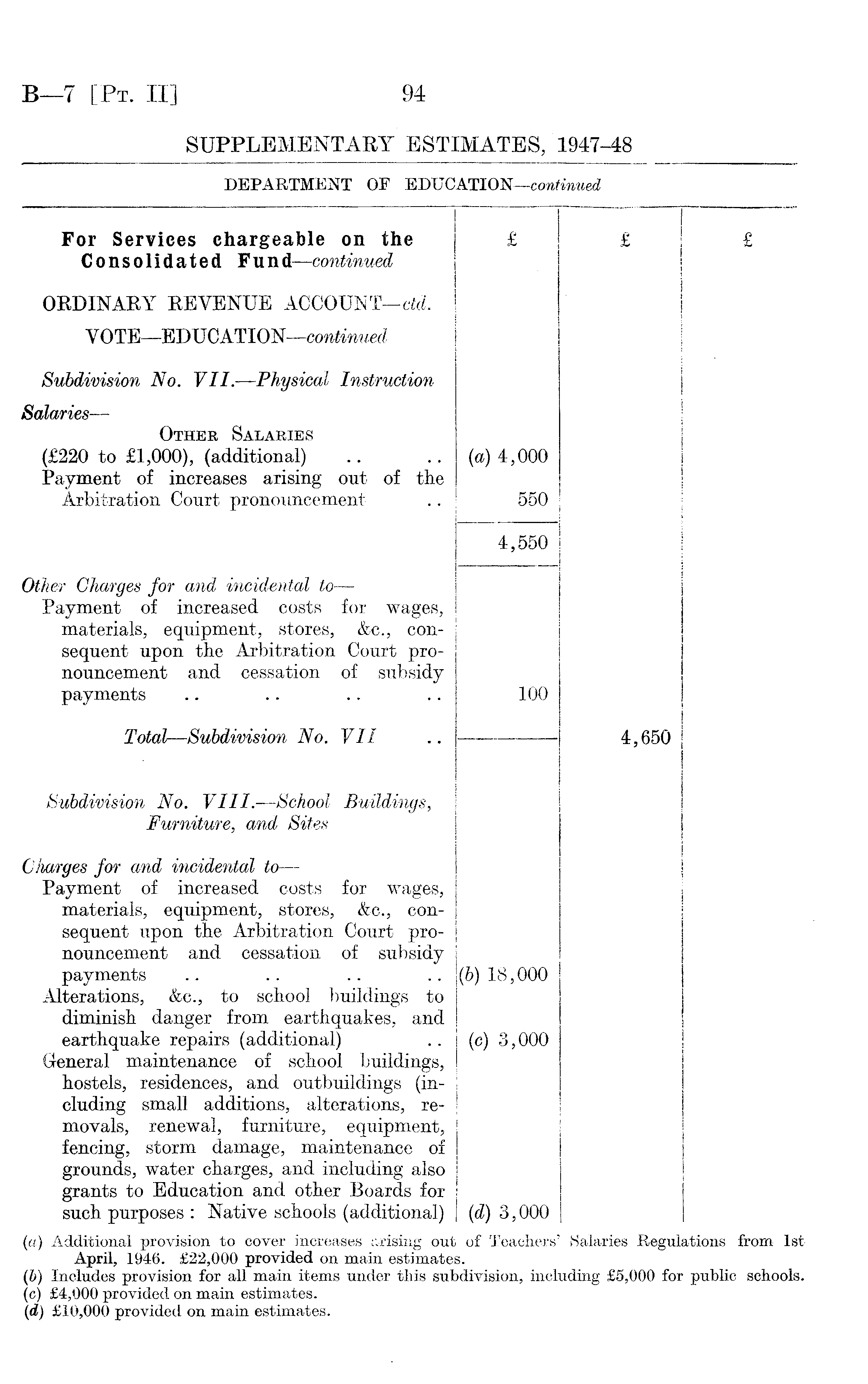 (а) Additional provision to cover increases arising out of Teachers' Salaries Regulations from Ist April, 1946. £22,000 provided on main estimates. (б) Includes provision for all main items under this subdivision, including £5,000 for public schools. (c) £4,000 provided on main estimates. (d) £lO,OOO provided on main estimates.