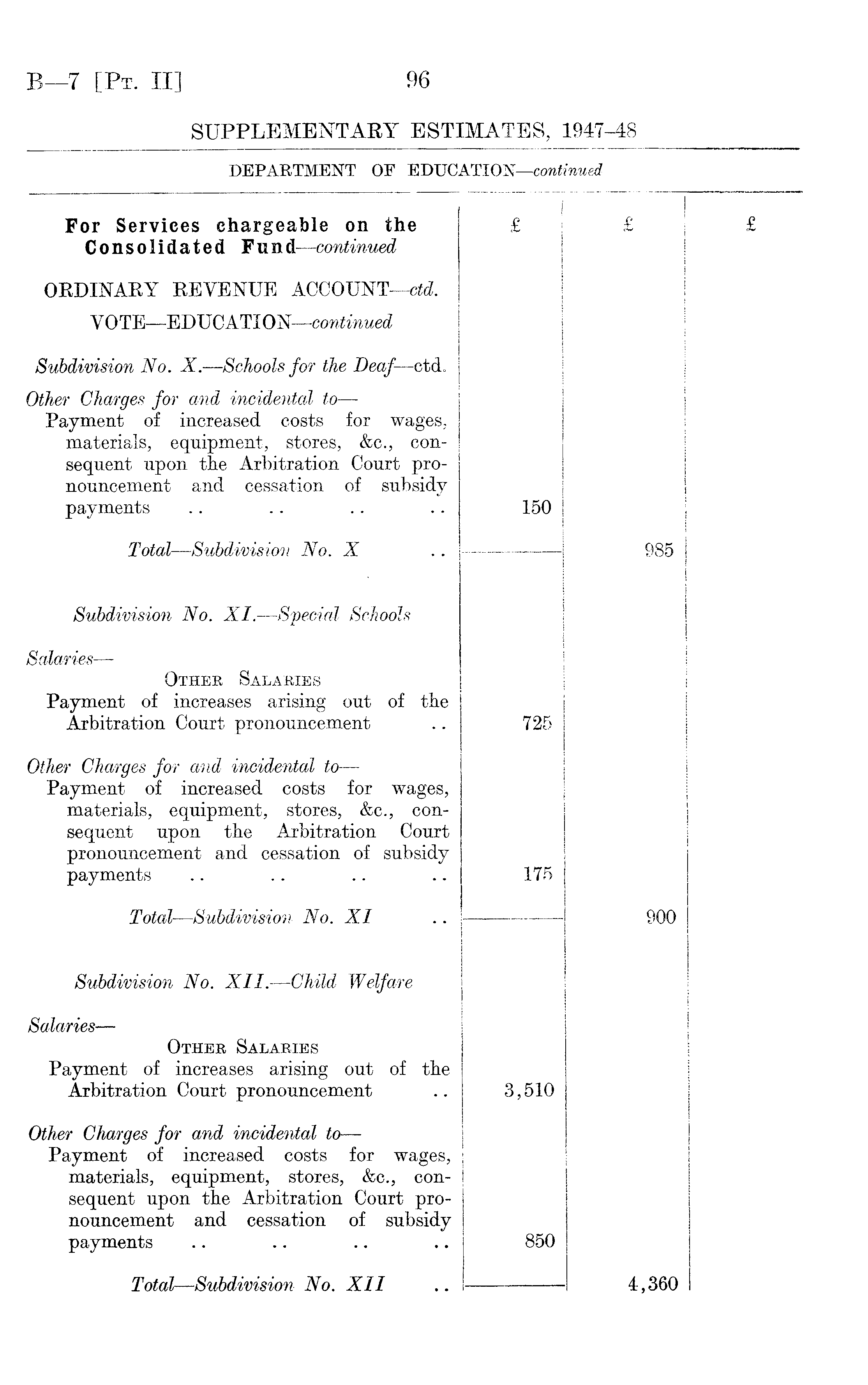 For Services chargeable on the Consolidated Fund—continued £ £ £ ORDINARY REVENUE ACCOUNT—ctd. ! | VOTE —EDUCATION —continued | Subdivision No. X. —Schools for the Deaf —ctd. ] i j Other Charges for and incidental to — Payment of increased costs for wages, materials, equipment, stores, &c., consequent upon the Arbitration Court pronouncement and cessation of subsidy payments 150 j Total—Subdivision No. X 985 Subdivision No. XI.—Special Schools i ! I Salaries — Other Salaries Payment of increases arising out of the Arbitration Court pronouncement 1 i i 725 Other Charges for and incidental to — Payment of increased costs for wages, materials, equipment, stores, &c., consequent upon the Arbitration Court pronouncement and cessation of subsidy payments 175 Total —Subdivision No. XI 900 Subdivision No. XII. —Child Welfare j Salaries— Other Salaries Payment of increases arising out of the Arbitration Court pronouncement 3,510 i i | Other Charges for and incidental to — Payment of increased costs for wages, materials, equipment, stores, &c., consequent upon the Arbitration Court pronouncement and cessation of subsidy payments 850 Total —Subdivision No. XII 4,360