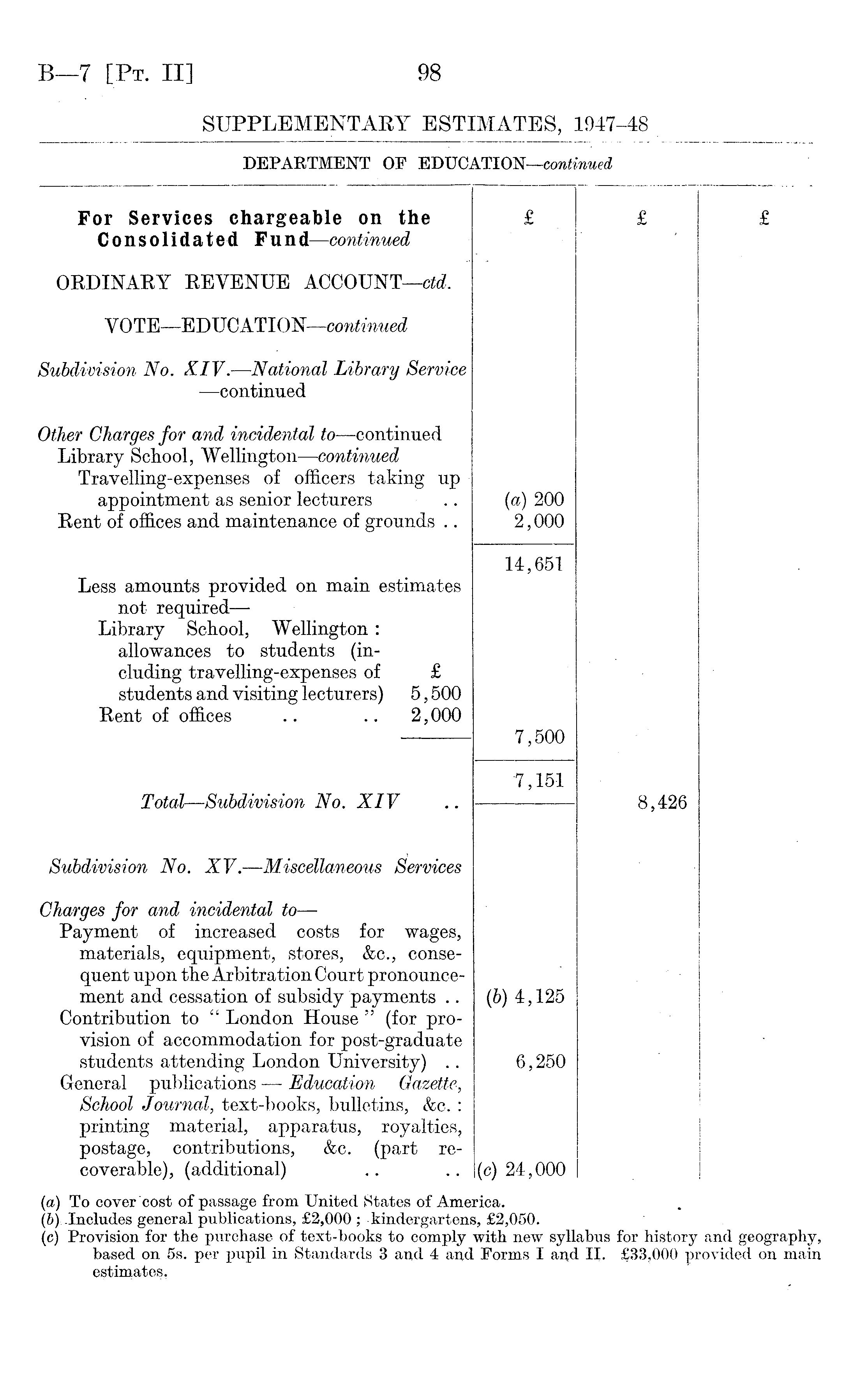 For Services ehargeable on the Consolidated Fund—continued £ £ £ ORDINARY REVENUE ACCOUNT —ctd. VOTE —EDUCATION —continued Subdivision No. XIV. —National Library Service —continued Other Charges for and incidental to —continued Library School, Wellington—continued Travelling-expenses of officers taking up appointment as senior lecturers Rent of offices and maintenance of grounds .. {a) 200 2,000 Less amounts provided on main estimates not required — Library School, Wellington: allowances to students (including travelling-expenses of £ students and visiting lecturers) 5,500 Rent of offices .. .. 2,000 14,651 7,500 Total—Subdivision No. XIV 7,151 8,426 Subdivision No. XV. —Miscellaneous Services Charges for and incidental to — Payment of increased costs for wages, materials, equipment, stores, &c., consequent upon the Arbitration Court pronouncement and cessation of subsidy payments .. Contribution to " London House " (for provision of accommodation for post-graduate students attending London University) .. General publications — Education Gazette,, School Journal, text-books, bulletins, &c. : printing material, apparatus, royalties, postage, contributions, &c. (part recoverable), (additional) (b) 4,125 6,250 (c) 24,000 | 1