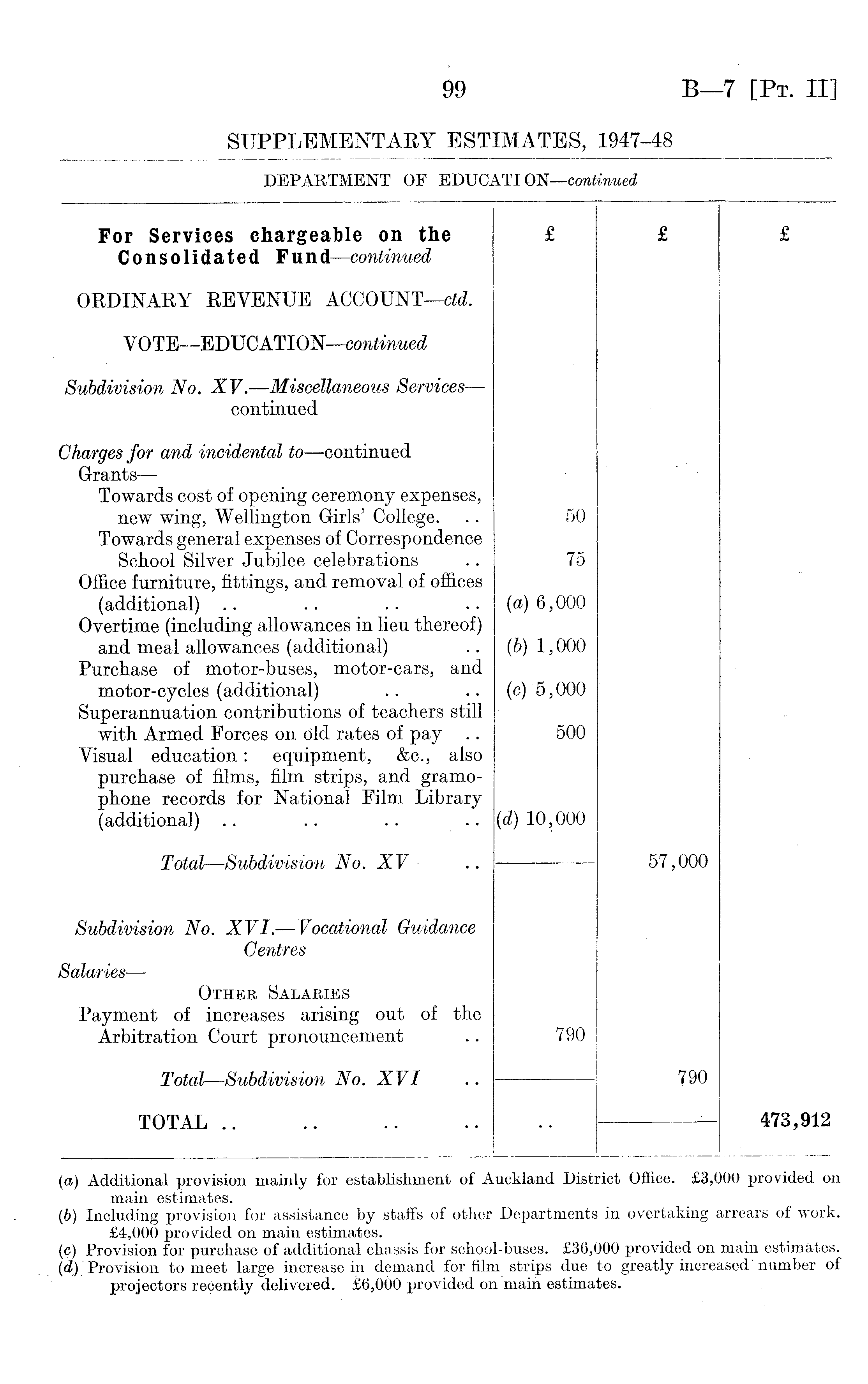 (a) Additional provision mainly for establishment of Auckland District Office. £3,000 provided on main estimates. (6) Including provision for assistance by staffs of other Departments in overtaking arrears of work. £4,000 provided on main estimates, (c) Provision for purchase of additional chassis for school-buses. £36,000 provided on main estimates. \d) Provision to meet large increase in demand for film strips due to greatly increased number of projectors recently delivered. £6,000 provided on main estimates.