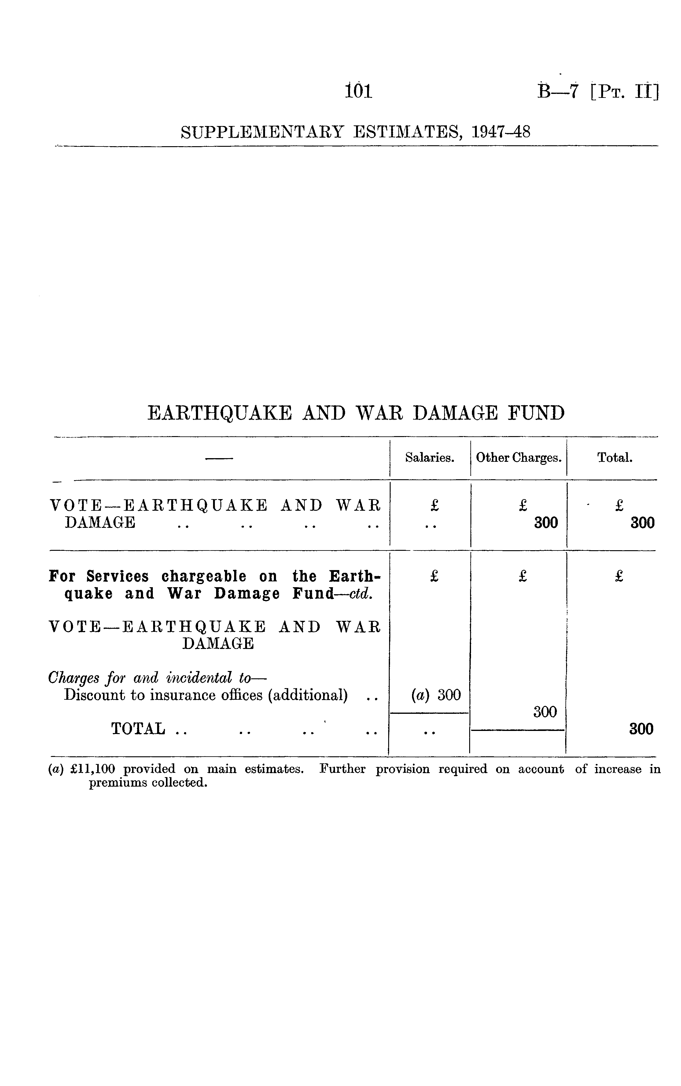 ,— Salaries. Other Charges. Total. VOTE —EARTHQUAKE AND WAR DAMAGE £ £ 300 • £ 300 For Services chargeable on the Earthquake and War Damage Fund—ctd. £ £ £ VOTE—EARTHQUAKE AND WAR DAMAGE Charges for and incidental to — Discount to insurance offices (additional) .. {a) 300 300 TOTAL ' 300 (a) £11,100 provided on main estimates. Further provision required on account premiums collected. of increase in