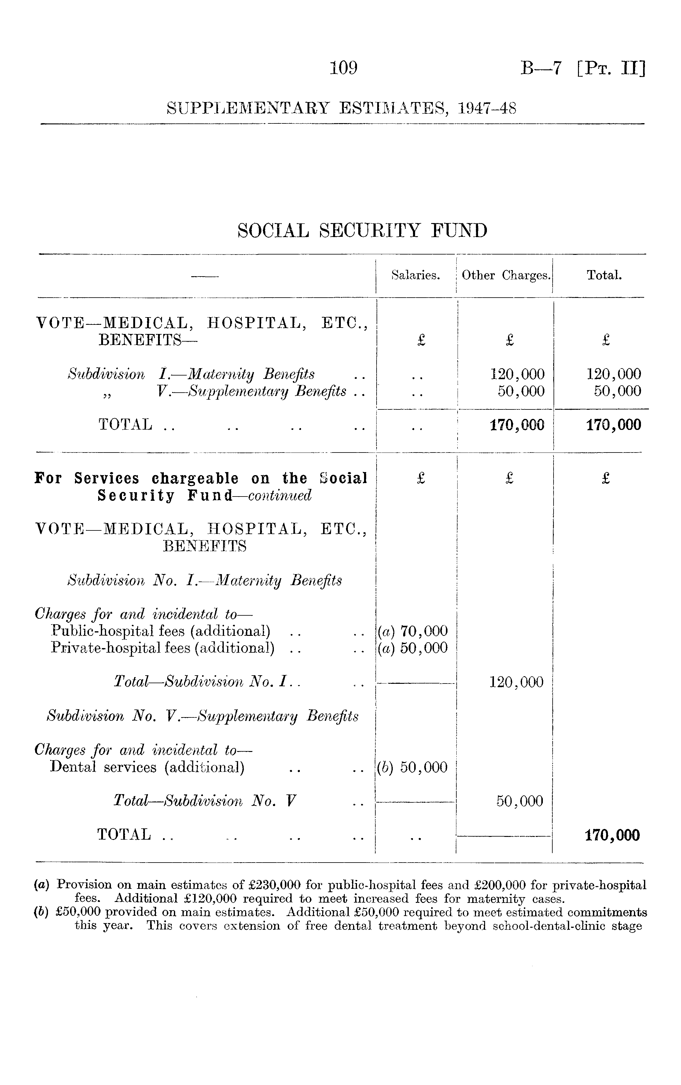 — Salaries. 1 1 Other Charges. Total. VOTE—MEDICAL, HOSPITAL, ETC., BENEFITS— £ £ £ Subdivision 1.—Maternity Benefits „ V. —Supplementary Benefits .. 120,000 50,000 120,000 50,000 TOTAL .. 170,000 170,000 For Services chargeable on the Social Security Fund—continued £ £ £ VOTE—MEDICAL, HOSPITAL, ETC., BENEFITS Subdivision No. I. —Maternity Benefits Charges for and incidental to — Public-hospital fees (additional) Private-hospital fees (additional) (a) 70,000 (a) 50,000 Total —Subdivision No. I.. 120,000 Subdivision No. V. —Supplementary Benefits Charges for and incidental to — Dental services (additional) (6) 50,000 Total—Subdivision No. V 50,000 TOTAL .. 170,000 (a) Provision on main estimates of £230,000 for public-hospital fees and £200,000 for private-hospital fees. Additional £120,000 required to meet increased fees for maternity cases. (b) £50,000 provided on main estimates. Additional £50,000 required to meet estimated commitments this year. This covers extension of free dental treatment beyond school-dental-clinic stage