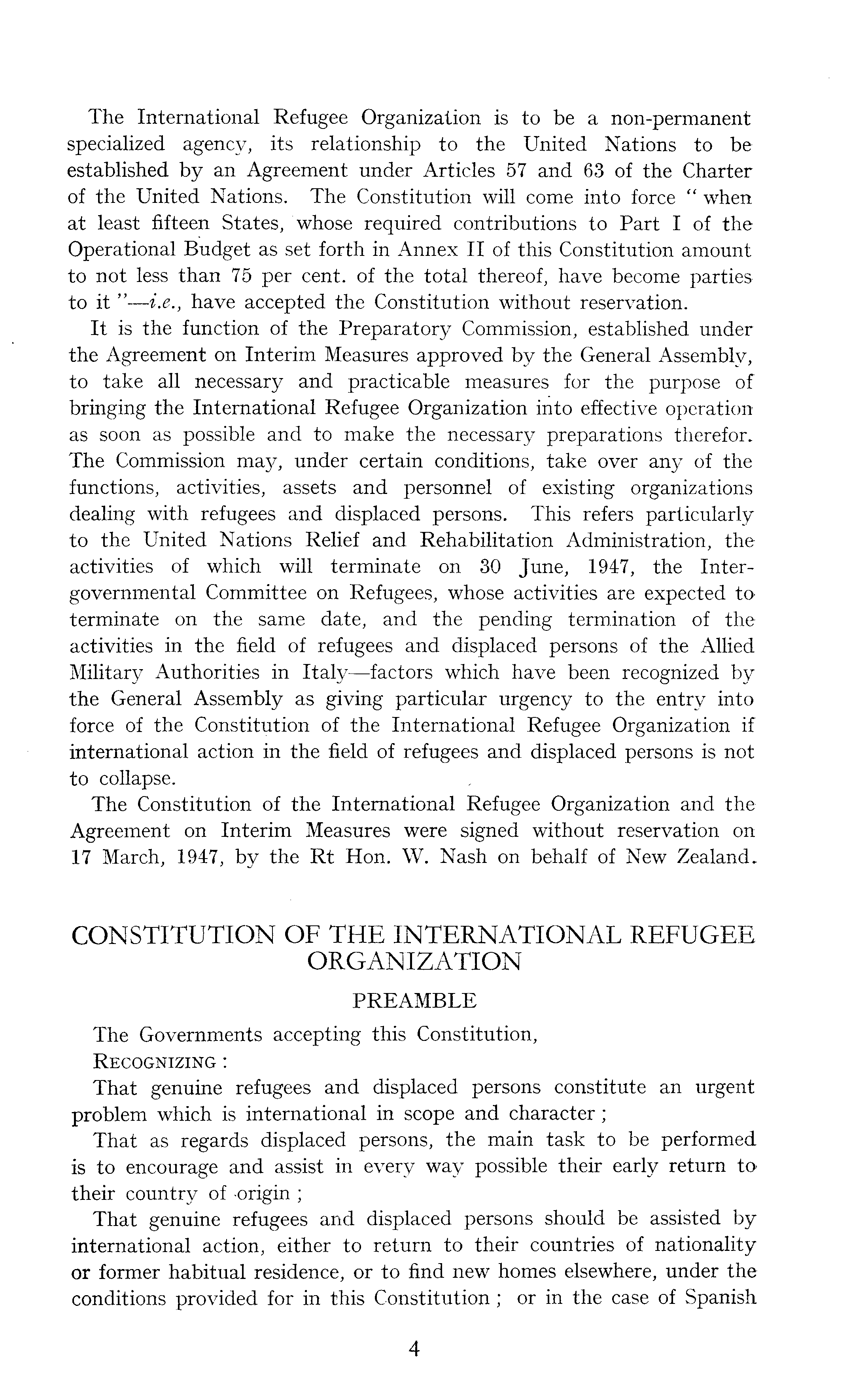 The International Refugee Organization is to be a non-permanent specialized agency, its relationship to the United Nations to be established by an Agreement under Articles 57 and 63 of the Charter of the United Nations. The Constitution will come into force " when at least fifteen States, whose required contributions to Part I of the Operational Budget as set forth in Annex II of this Constitution amount to not less than 75 per cent, of the total thereof, 'have become parties to it " —i.e., have accepted the Constitution without reservation. It is the function of the Preparatory Commission, established under the Agreement on Interim Measures approved by the General Assembly, to take all necessary and practicable measures for the purpose of bringing the International Refugee Organization into effective operation as soon as possible and to make the necessary preparations therefor. The Commission may, under certain conditions, take over any of the functions, activities, assets and personnel of existing organizations dealing with refugees and displaced persons. This refers particularly to the United Nations Relief and Rehabilitation Administration, the activities of which will terminate on 30 June, 1947, the Intergovernmental Committee on Refugees, whose activities are expected to terminate on the same date, and the pending termination of the activities in the field of refugees and displaced persons of the Allied Military Authorities in Italy—factors which have been recognized by the General Assembly as giving particular urgency to the entry into force of the Constitution of the International Refugee Organization if international action in the field of refugees and displaced persons is not to collapse. The Constitution of the International Refugee Organization and the Agreement on Interim Measures were signed without reservation on 17 March, 1947, by the Rt Hon. W. Nash on behalf of New Zealand. CONSTITUTION OF THE INTERNATIONAL REFUGEE ORGANIZATION PREAMBLE The Governments accepting this Constitution, Recognizing : That genuine refugees and displaced persons constitute an urgent problem which is international in scope and character; That as regards displaced persons, the main task to be performed is to encourage and assist in every way possible their early return to their country of origin ; That genuine refugees and displaced persons should be assisted by international action, either to return to their countries of nationality or former habitual residence, or to find new homes elsewhere, under the conditions provided for in this Constitution; or in the case of Spanish