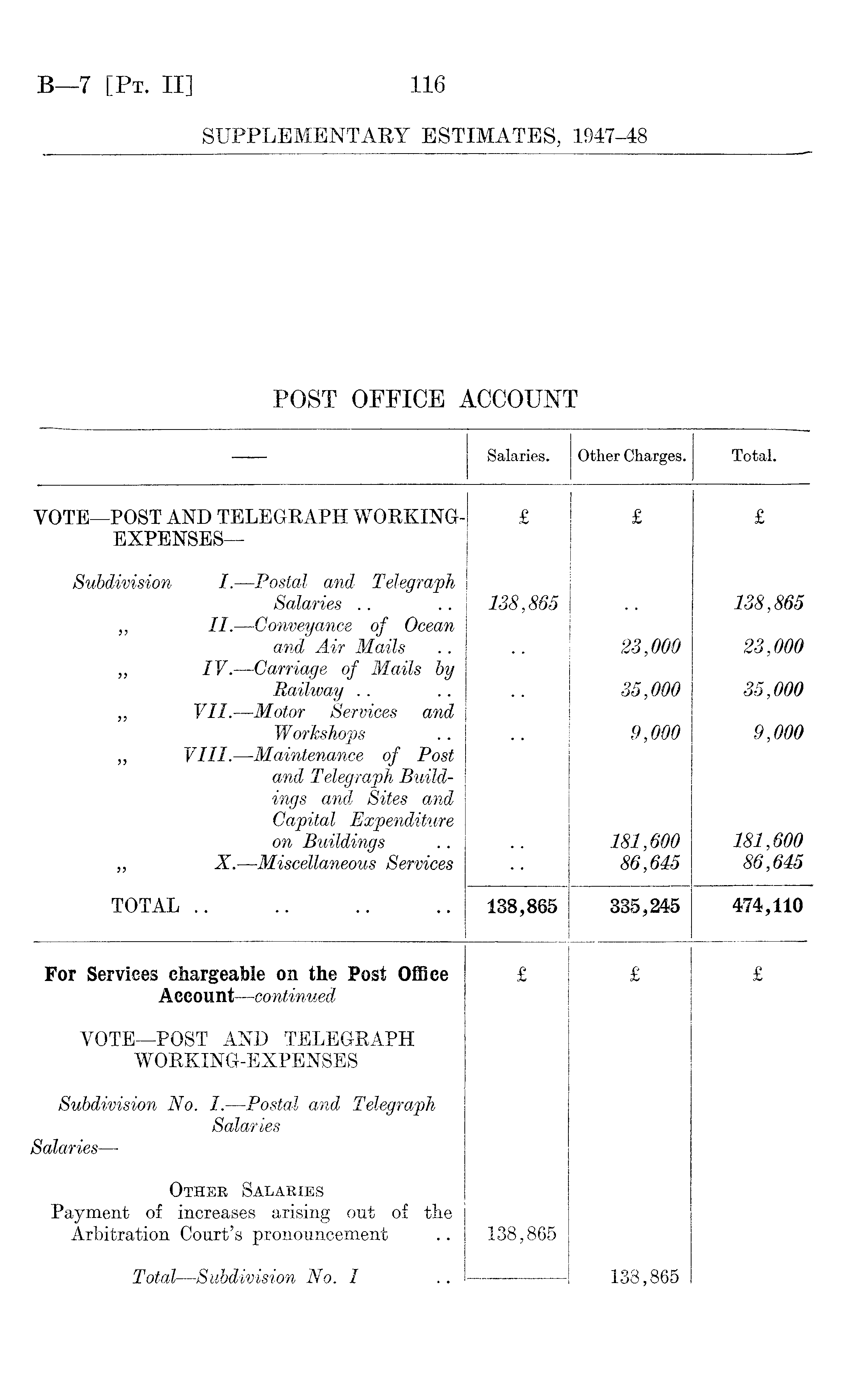 — Salaries. Other Charges. Total. VOTE—POST AND TELEGRAPH WORKINGEXPENSES— £ £ £ Subdivision I.—Postal and Telegraph Salaries .. ,, II.—Conveyance of Ocean and Air Mails „ IV. —Carriage of Mails by Railway .. „ VII.—Motor Services and Workshops „ VIII. —Maintenance of Post and Telegraph Buildings and Sites and Capital Expenditure on Buildings „ X.—Miscellaneous Services 138,865 23,000 35,000 9,000 181,600 86,645 138,865 23,000 35,000 9,000 181,600 86,645 TOTAL .. 138,865 335,245 474,110 For Services chargeable on the Post Office Account—continued £ £ £ VOTE—POST AND TELEGRAPH WORKING-EXPENSES Subdivision No. I. —Postal and Telegraph Salaries Salaries— Other Salaries Payment of increases arising out of the Arbitration Court's pronouncement 138,865 Total—Subdivision No. I 138,865