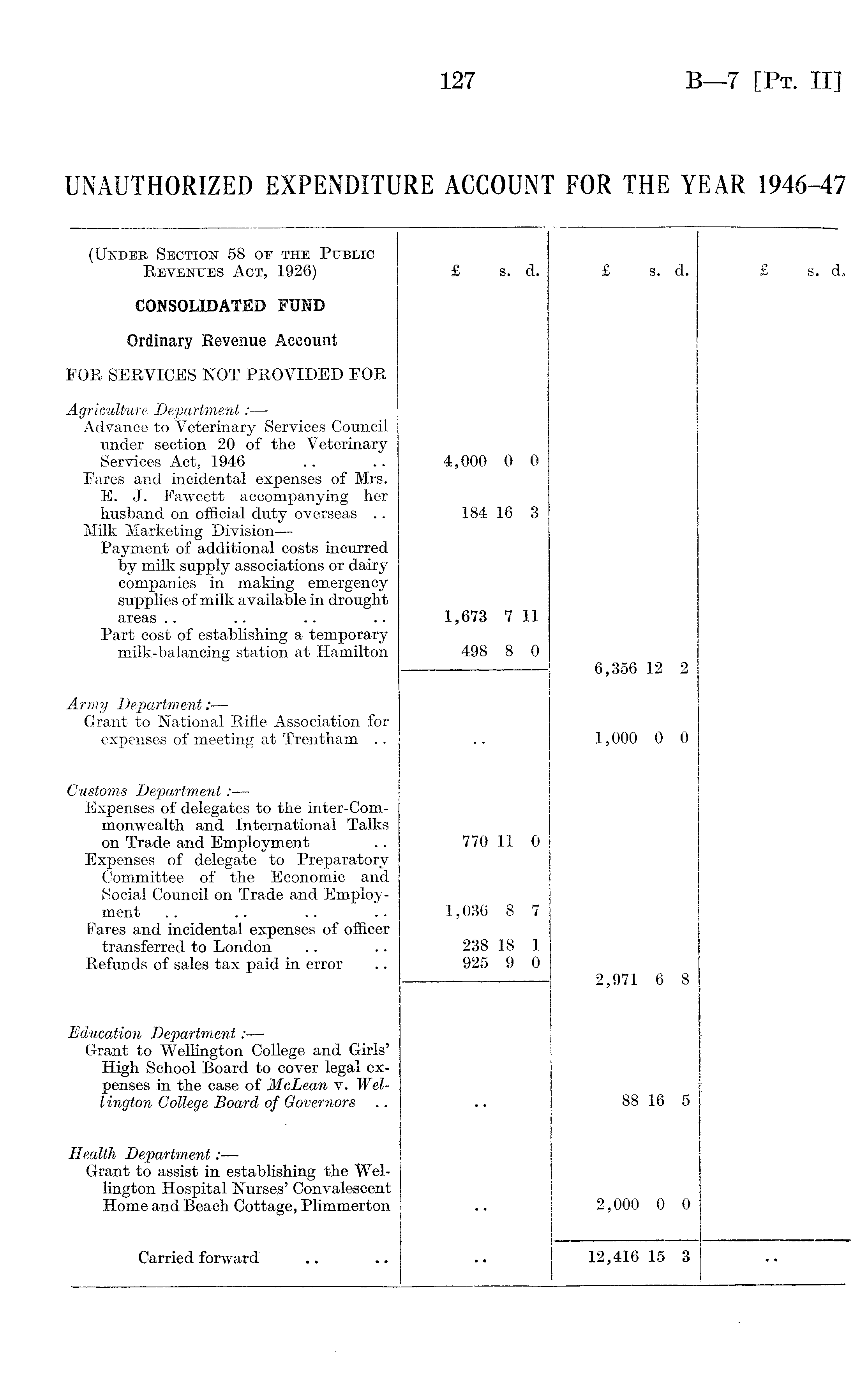 (Under Section 58 of the Public Revenues Act, 1926) £ s. d. £ s. d. £ s. d. CONSOLIDATED FUND Ordinary Revenue Aceount FOR SERVICES NOT PROVIDED FOR Agriculture Department: — Advance to Veterinary Services Council under section 20 of the Veterinary Services Act, 1946 4,000 0 0 Fares and incidental expenses of Mrs. E. J. Fawcett accompanying her husband on official duty overseas .. 184 16 3 Milk Marketing Division— Payment of additional costs incurred by milk supply associations or dairy companies in making emergency supplies of milk available in drought areas 1,673 7 11 Part cost of establishing a temporary milk-balancing station at Hamilton 498 8 0 6,356 12 2 Army Department: — Grant to National Rifle Association for expenses of meeting at Trentham .. 1,000 0 0 Custo?ns Department: — Expenses of delegates to the inter-Com-monwealth and International Talks on Trade and Employment 770 11 0 ; Expenses of delegate to Preparatory Committee of the Economic and Social Council on Trade and Employment 1,036 8 7 Fares and incidental expenses of officer transferred to London 238 18 1 Refunds of sales tax paid in error 925 9 0 2,971 6 8 Education Department: — Grant to Wellington College and Girls' High School Board to cover legal expenses in the case of McLean v. Wellington College Board of Governors .. •• 88 16 5 Health Department: — Grant to assist in establishing the Wellington Hospital Nurses' Convalescent Home and Beach Cottage, Plimmerton .. 2,000 0 0 Carried forward 12,416 15 3 ••