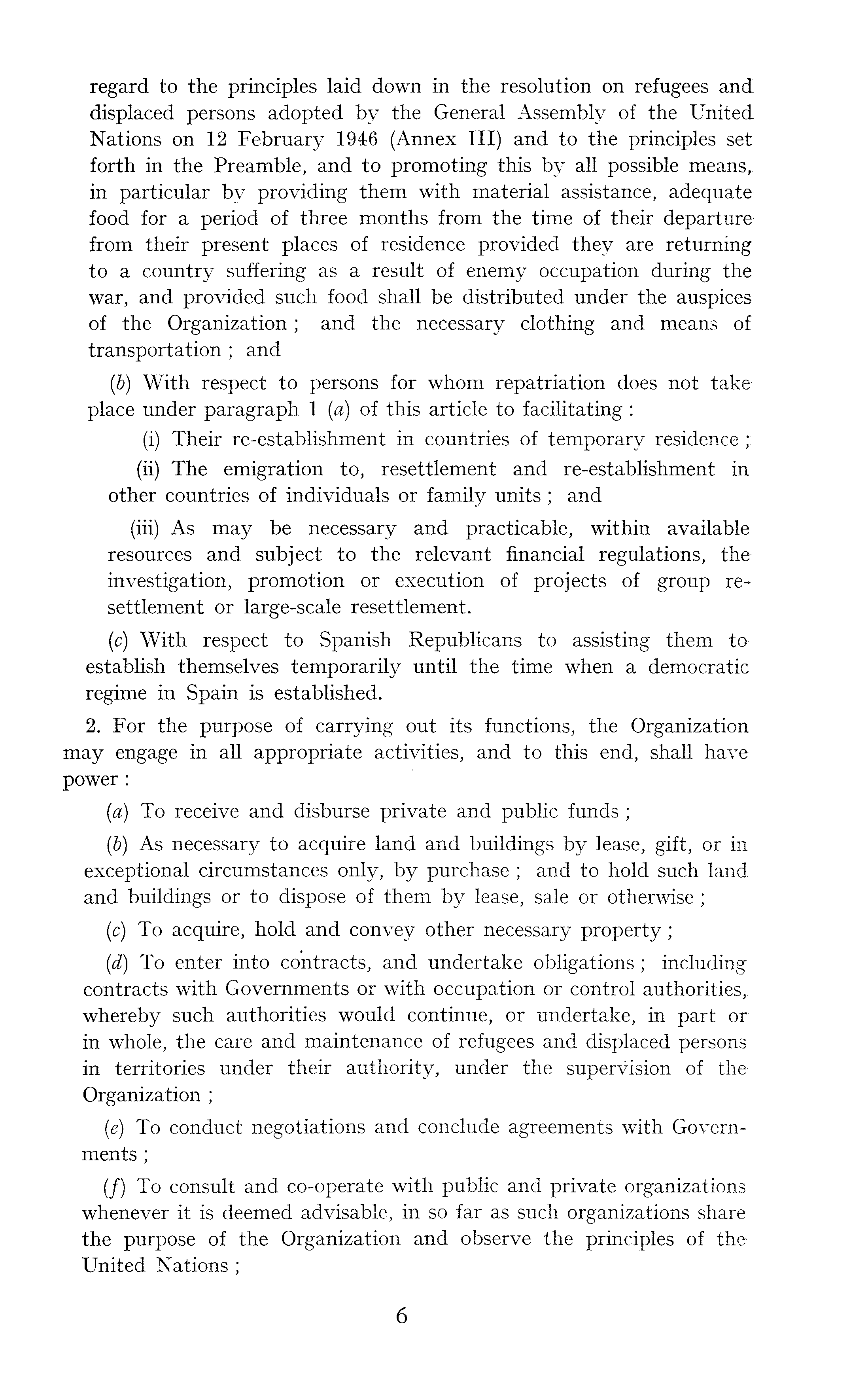 regard to the principles laid down in the resolution on refugees and displaced persons adopted by the General Assembly of the United Nations on 12 February 1946 (Annex III) and to the principles set forth in the Preamble, and to promoting this by all possible means, in particular by providing them with material assistance, adequate food for a period of three months from the time of their departure from their present places of residence provided they are returning to a country suffering as a result of enemy occupation during the war, and provided such food shall be distributed under the auspices of the Organization; and the necessary clothing and means of transportation ; and (b) With respect to persons for whom repatriation does not take place under paragraph 1 (a) of this article to facilitating : (i) Their re-establishment in countries of temporary residence ; (ii) The emigration to, resettlement and re-establishment in other countries of individuals or family units; and (iii) As may be necessary and practicable, within available resources and subject to the relevant financial regulations, the investigation, promotion or execution of projects of group resettlement or large-scale resettlement. (c) With respect to Spanish Republicans to assisting them to establish themselves temporarily until the time when a democratic regime in Spain is established. 2. For the purpose of carrying out its functions, the Organization may engage in all appropriate activities, and to this end, shall have power: (a) To receive and disburse private and public funds; (b) As necessary to acquire land and buildings by lease, gift, or in exceptional circumstances only, by purchase ; and to hold such land and buildings or to dispose of them by lease, sale or otherwise; (c) To acquire, hold and convey other necessary property; (d) To enter into contracts, and undertake obligations; including contracts with Governments or with occupation or control authorities, whereby such authorities would continue, or undertake, in part or in whole, the care and maintenance of refugees and displaced persons in territories under their authority, under the supervision of the Organization ; (e) To conduct negotiations and conclude agreements with Governments ; (/) To consult and co-operate with public and private organizations whenever it is deemed advisable, in so far as such organizations share the purpose of the Organization and observe the principles of the United Nations ;