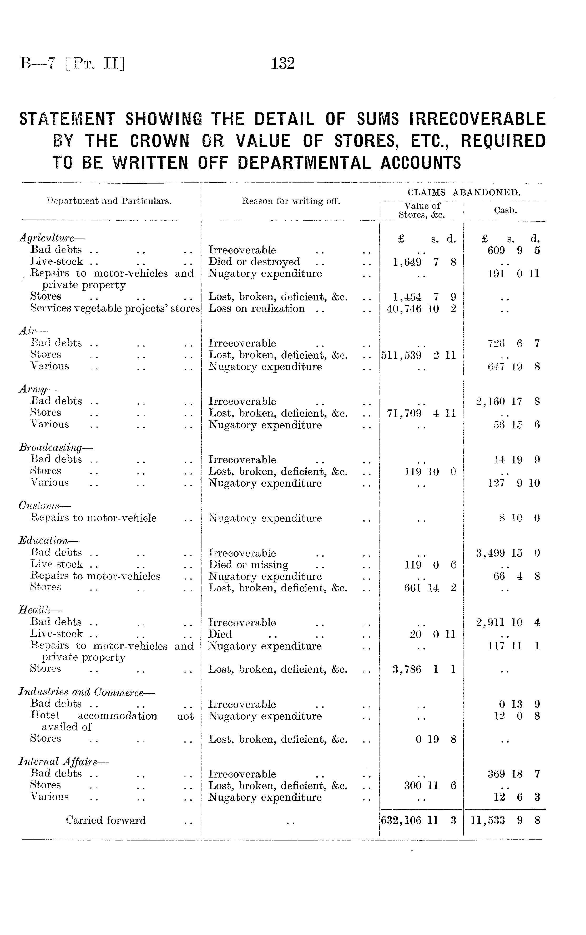 Department and Particulars. Reason for writing off. CLAIMS ! ABANDONED. | Value of ! Stores, <fcc. Cash. Agriculture— Bad debts Live-stock Repairs to motor-vehicles and private property Stores Services vegetable projects' stores Irrecoverable Died or destroyed Nugatory expenditure Lost, broken, deficient, &c. Loss on realization £ s. 1,649 7 1,454 7 40,746 10 d. 8 9 2 £ s. 609 9 19i 0 d. 5 11 Air — Bad debts Stores Various Irrecoverable Lost, broken, deficient, &c. Nugatory expenditure 511,539 2 11 726 6 647 19 7 8 Army— Bad debts Stores Various Irrecoverable Lost, broken, deficient, &c. Nugatory expenditure 71,709 4 i 11 ! 2,160 17 56 15 8 6 Broadcasting— Bad debts Stores Various Irrecoverable Lost, broken, deficient, &c. Nugatory expenditure 11910 0 14 19 127 9 9 10 Customs— Repairs to motor-vehicle Nugatory expenditure 8 10 0 Education— Bad debts Live-stock Repairs to motor-vehicles Stores Irrecoverable Died or missing Nugatory expenditure Lost, broken, deficient, &c. 119' 0 66i 14 6 2 3,499 15 66 4 0 8 Health— Bad debts Live-stock Repairs to motor-vehicles private property Stores and Irrecoverable Died Nugatory expenditure Lost, broken, deficient, &c. 20' 0 3,786 1 11 1 2,911 10 117 11 4 1 Industries and Commerce— Bad debts Hotel accommodation availed of Stores not Irrecoverable Nugatory expenditure 0 13 12 0 9 8 Lost, broken, deficient, &c. 0 19 8 Internal Affairs — Bad debts Stores Various Irrecoverable Lost, broken, deficient, &c. Nugatory expenditure 300"11 6 369 18 12 6 7 3 Carried forward 632,106 11 3 11,533 9 8