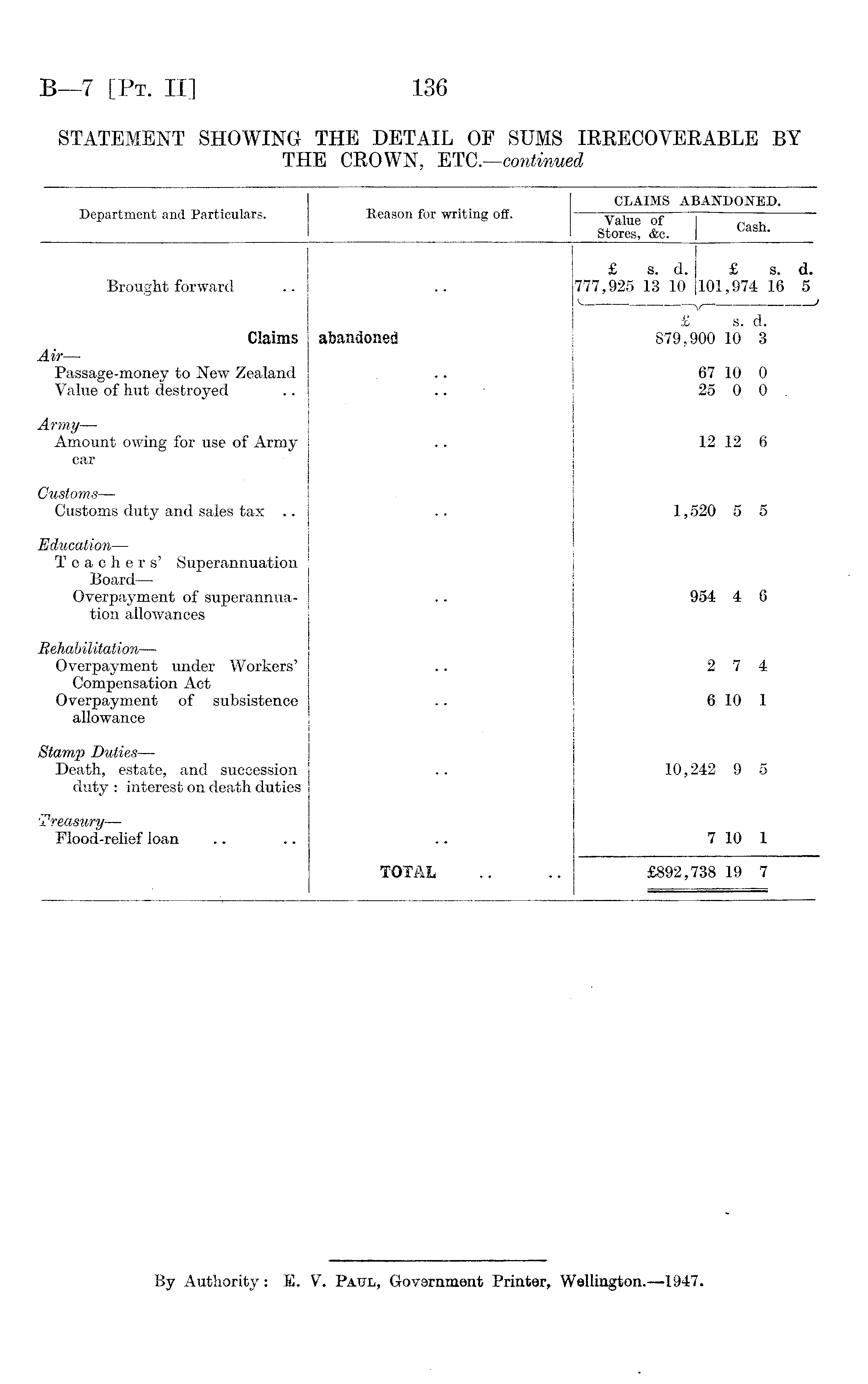 Department and Particulars. feeagbn for writing off. CLAIMS ABANDONED. Value Stores, of &c. Cash. Brought forward £ s. d. 777,925 13 10 £ s. d. 101,974 16 5 J Claims Air— Passage-money to New Zealand Value of hut destroyed abandoned V £ s. 879,900 10* 67 10 25 0 d. 3 0 0 . Army— Amount owing for use of Army car 12 12 6 Customs — Customs duty and sales tax .. 1,520 5 5 Education— Teachers' Superannuation Board — Overpayment of superannuation allowances i 954 4 6 Rehabilitation— Overpayment under Workers' Compensation Act Overpayment of subsistence allowance •• 2 7 6 10 4 1 Stamp Duties— Death, estate, and succession duty : interest on death duties • 10,242 9 5 Treasury— Flood-relief loan 7 10 1 TOTAL £892,738 19 7
