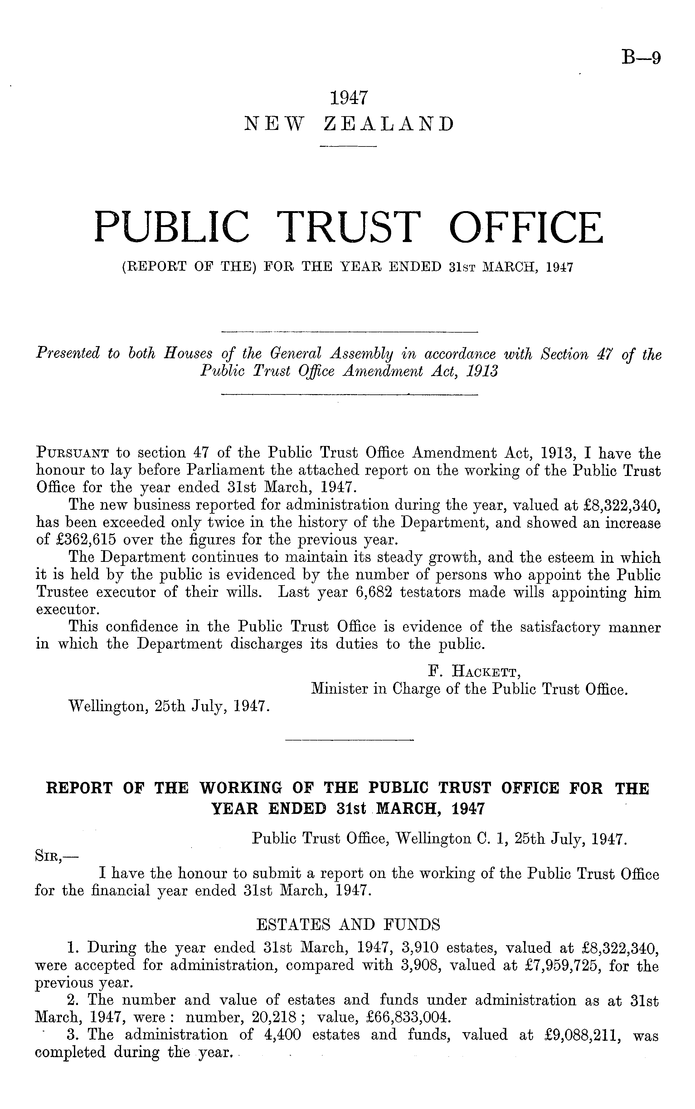 Pursuant to section 47 of the Public Trust Office Amendment Act, 1913, I have the honour to lay before Parliament the attached report on the working of the Public Trust Office for the year ended 31st March, 1947. The new business reported for administration during the year, valued at £8,322,340, has been exceeded only twice in the history of the Department, and showed an increase of £362,615 over the figures for the previous year. The Department continues to maintain its steady growth, and the esteem in which it is held by the public is evidenced by the number of persons who appoint the Public Trustee executor of their wills. Last year 6,682 testators made wills appointing him executor. This confidence in the Public Trust Office is evidence of the satisfactory manner in which the Department discharges its duties to the public. F, Hackett, Minister in Charge of the Public Trust Office. Wellington, 25th July, 1947.