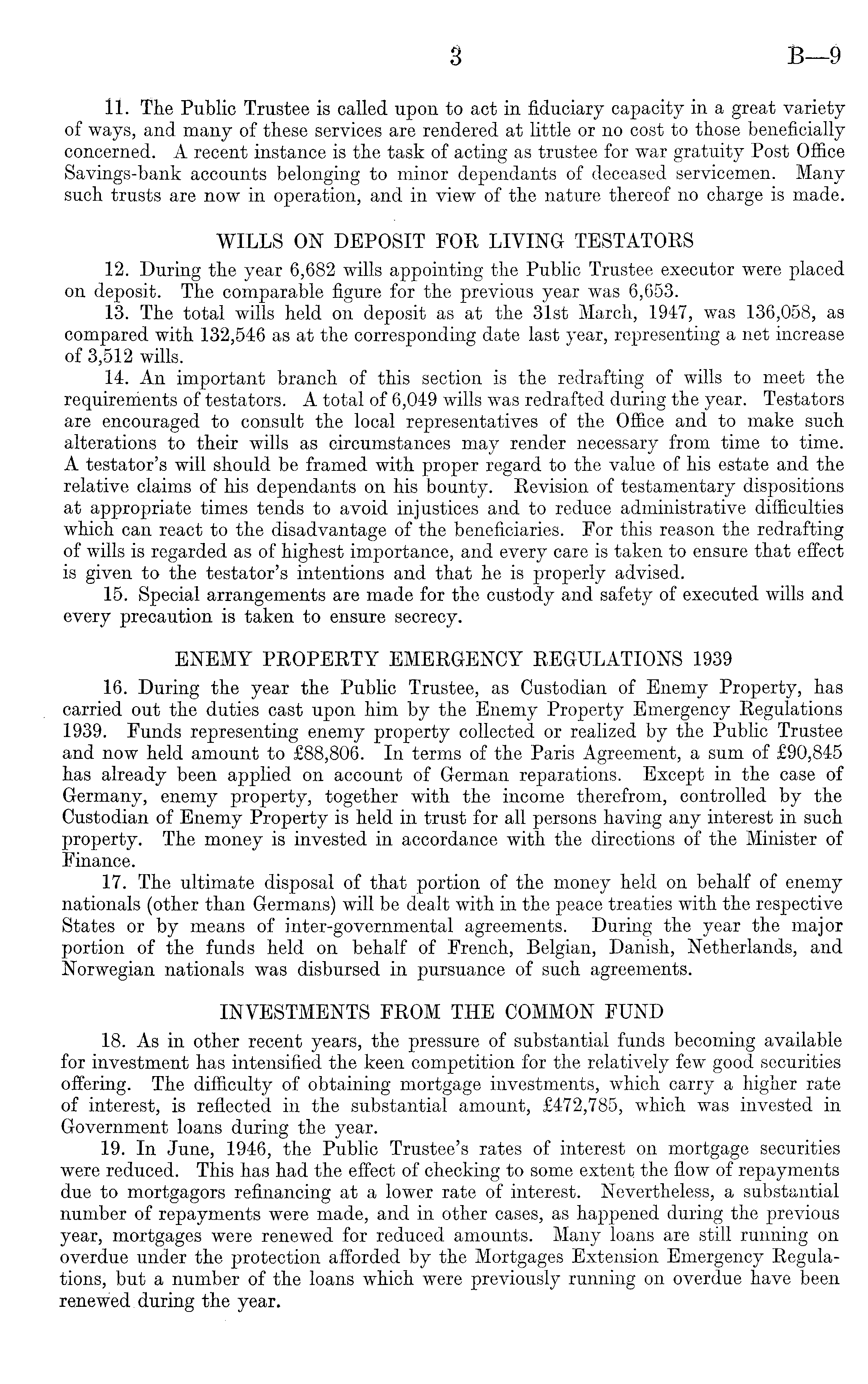11. The Public Trustee is called upon to act in fiduciary capacity in a great variety of ways, and many of these services are rendered at little or no cost to those beneficially concerned. A recent instance is the task of acting as trustee for war gratuity Post Office Savings-bank accounts belonging to minor dependants of deceased servicemen. Many such trusts are now in operation, and in view of the nature thereof no charge is made. WILLS ON DEPOSIT FOR LIVING TESTATORS 12. During the year 6,682 wills appointing the Public Trustee executor were placed on deposit. The comparable figure for the previous year was 6,653. 13. The total wills held on deposit as at the 31st March, 1947, was 136,058, as compared with 132,546 as at the corresponding date last year, representing a net increase of 3,512 wills. 14. An important branch of this section is the redrafting of wills to meet the requirements of testators. A total of 6,049 wills was redrafted during the year. Testators are encouraged to consult the local representatives of the Office and to make such alterations to their wills as circumstances may render necessary from time to time. A testator's will should be framed with proper regard to the value of his estate and the relative claims of his dependants on his bounty. Revision of testamentary dispositions at appropriate times tends to avoid injustices and to reduce administrative difficulties which can react to the disadvantage of the beneficiaries. For this reason the redrafting of wills is regarded as of highest importance, and every care is taken to ensure that effect is given to the testator's intentions and that he is properly advised. 15. Special arrangements are made for the custody and safety of executed wills and every precaution is taken to ensure secrecy. ENEMY PROPERTY EMERGENCY REGULATIONS 1939 16. During the year the Public Trustee, as Custodian of Enemy Property, has carried out the duties cast upon him by the Enemy Property Emergency Regulations 1939. Funds representing enemy property collected or realized by the Public Trustee and now held amount to £88,806. In terms of the Paris Agreement, a sum of £90,845 has already been applied on account of German reparations. Except in the case of Germany, enemy property, together with the income therefrom, controlled by the Custodian of Enemy Property is held in trust for all persons having any interest in such property. The money is invested in accordance with the directions of the Minister of Finance. 17. The ultimate disposal of that portion of the money held on behalf of enemy nationals (other than Germans) will be dealt with in the peace treaties with the respective States or by means of inter-governmental agreements. During the year the major portion of the funds held on behalf of French, Belgian, Danish, Netherlands, and Norwegian nationals was disbursed in pursuance of such agreements. INVESTMENTS FROM THE COMMON FUND 18. As in other recent years, the pressure of substantial funds becoming available for investment has intensified the keen competition for the relatively few good securities offering. The difficulty of obtaining mortgage investments, which carry a higher rate of interest, is reflected in the substantial amount, £472,785, which was invested in Government loans during the year. 19. In June, 1946, the Public Trustee's rates of interest on mortgage securities were reduced. This has had the effect of checking to some extent the flow of repayments due to mortgagors refinancing at a lower rate of interest. Nevertheless, a substantial number of repayments were made, and in other cases, as happened during the previous year, mortgages were renewed for reduced amounts. Many loans .are still running on overdue under the protection afforded by the Mortgages Extension Emergency Regulations, but a number of the loans which were previously running on overdue have been renewed during the year.