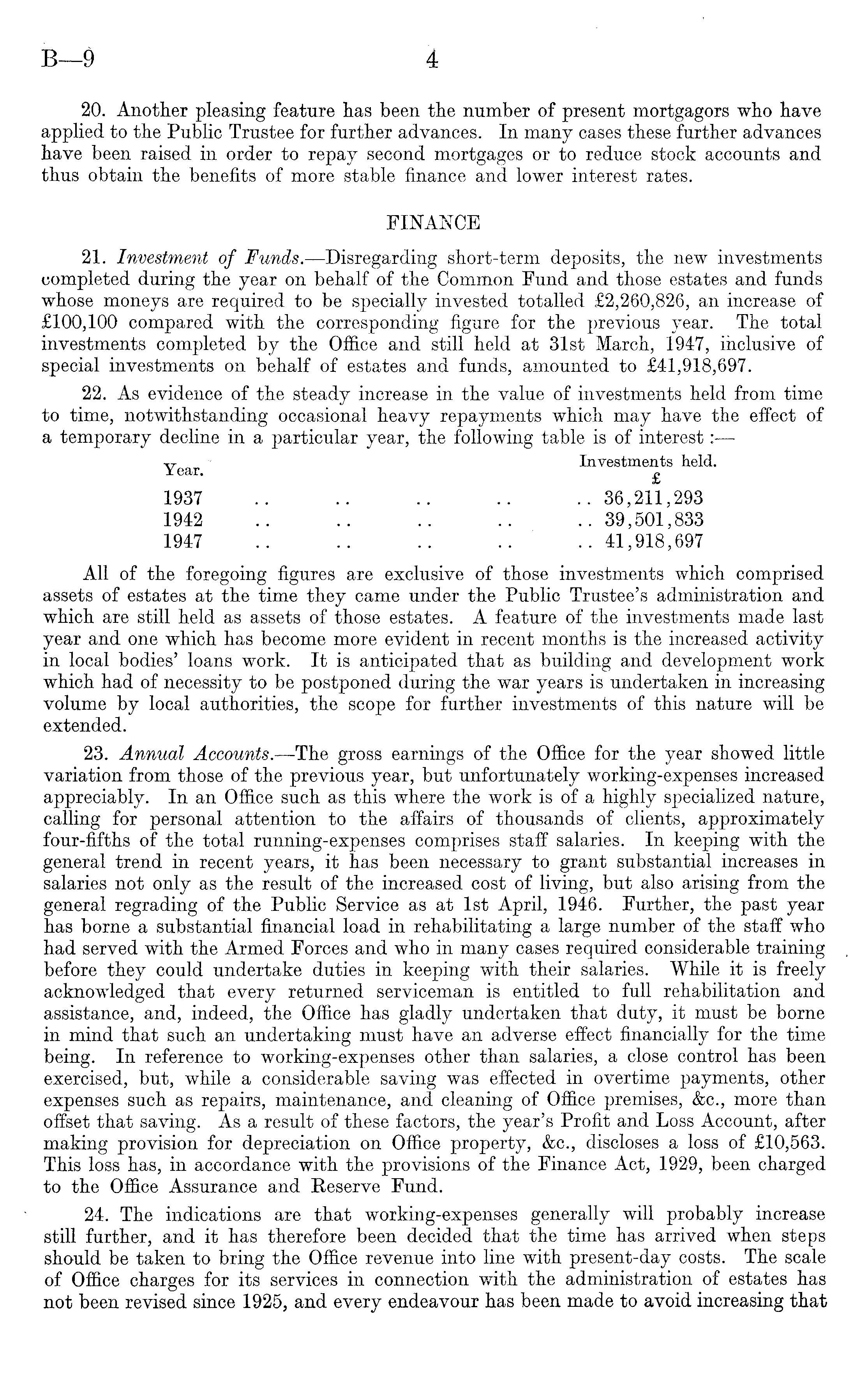 20. Another pleasing feature has been the number of present mortgagors who have applied to the Public Trustee for further advances. In many cases these further advances have been raised in order to repay second mortgages or to reduce stock accounts and thus obtain the benefits of more stable finance and lower interest rates. FINANCE 21. Investment of Funds.—Disregarding short-term deposits, the new investments completed during the year on behalf of the Common Fund and those estates and funds whose moneys are required to be specially invested totalled £2,260,826, an increase of £lOO,lOO compared with the corresponding figure for the previous year. The total investments completed by the Office and still held at 31st March, 1947, inclusive of special investments on behalf of estates and funds, amounted to £41,918,697. 22. As evidence of the steady increase in the value of investments held from time to time, notwithstanding occasional heavy repayments which may have the effect of a temporary decline in a particular year, the following table is of interest: — Y ear * Investments held. 1937 .. .. .. .. .. 36,211,293 1942 .. .. .. .. .. 39,501,833 1947 .. .. .. .. .. 41,918,697 All of the foregoing figures are exclusive of those investments which comprised assets of estates at the time they came under the Public Trustee's administration and which are still held as assets of those estates. A feature of the investments made last year and one which has become more evident in recent months is the increased activity in local bodies' loans work. It is anticipated that as building and development work which had of necessity to be postponed during the war years is undertaken in increasing volume by local authorities, the scope for further investments of this nature will be extended. 23. Annual Accounts. —The gross earnings of the Office for the year showed little variation from those of the previous year, but unfortunately working-expenses increased appreciably. In an Office such as this where the work is of a highly specialized nature, calling for personal attention to the affairs of thousands of clients, approximately four-fifths of the total running-expenses comprises staff salaries. In keeping with the general trend in recent years, it has been necessary to grant substantial increases in salaries not only as the result of the increased cost of living, but also arising from the general regrading of the Public Service as at Ist April, 1946. Further, the past year has borne a substantial financial load in rehabilitating a large number of the staff who had served with the Armed Forces and who in many cases required considerable training before they could undertake duties in keeping with their salaries. While it is freely acknowledged that every returned serviceman is entitled to full rehabilitation and assistance, and, indeed, the Office has gladly undertaken that duty, it must be borne in mind that such an undertaking must have an adverse effect financially for the time being. In reference to working-expenses other than salaries, a close control has been exercised, but, while a considerable saving was effected in overtime payments, other expenses such as repairs, maintenance, and cleaning of Office premises, &c., more than offset that saving. As a result of these factors, the year's Profit and Loss Account, after making provision for depreciation on Office property, &c., discloses a loss of £10,563. This loss has, in accordance with the provisions of the Finance Act, 1929, been charged to the Office Assurance and Eeserve Fund. 24. The indications are that working-expenses generally will probably increase still further, and it has therefore been decided that the time has arrived when steps should be taken to bring the Office revenue into line with present-day costs. The scale of Office charges for its services in connection with the administration of estates has not been revised since 1925, and every endeavour has been made to avoid increasing that