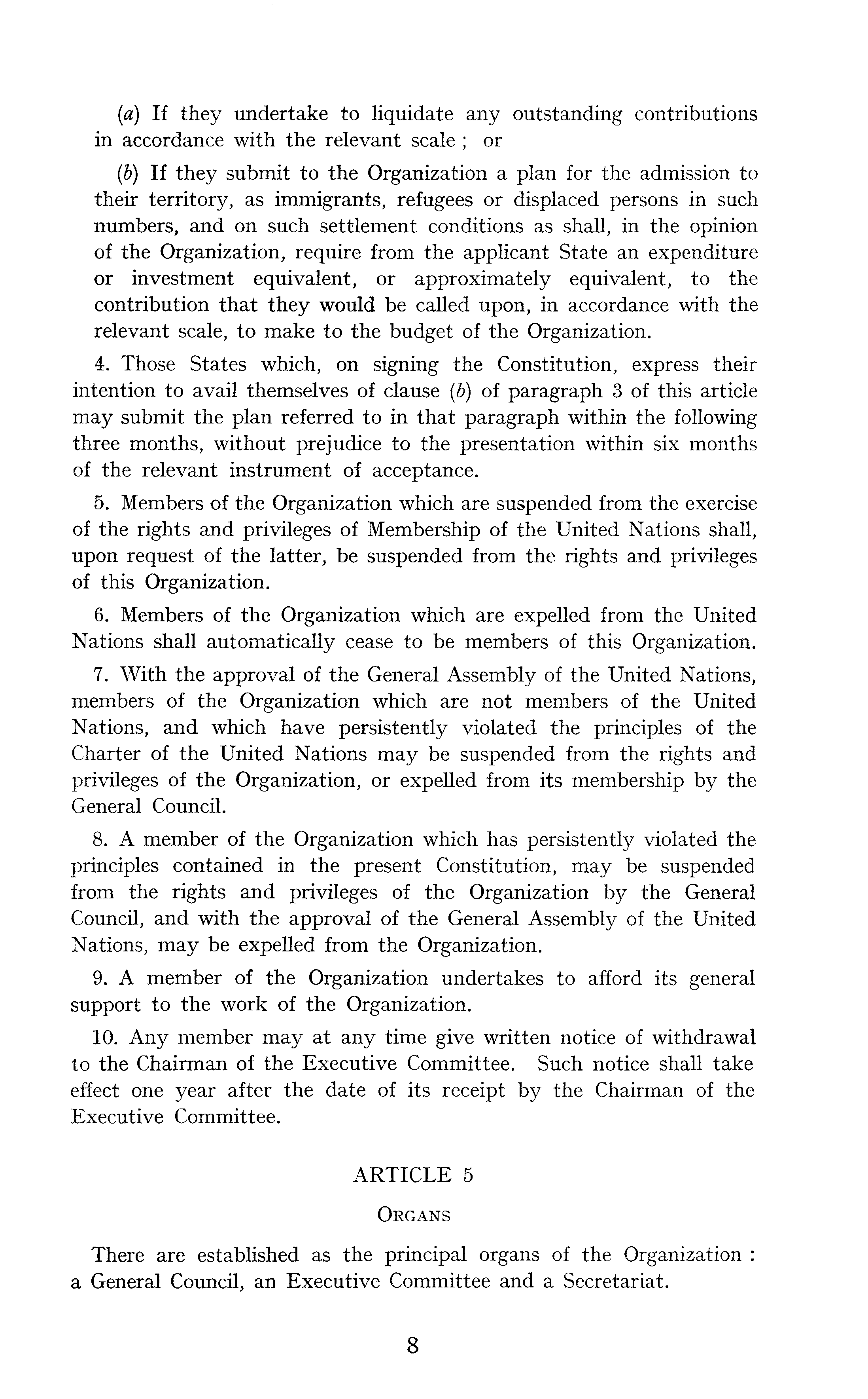 (a) If they undertake to liquidate any outstanding contributions in accordance with the relevant scale ; or (b) If they submit to the Organization a plan for the admission to their territory, as immigrants, refugees or displaced persons in such numbers, and on such settlement conditions as shall, in the opinion of the Organization, require from the applicant State an expenditure or investment equivalent, or approximately equivalent, to the contribution that they would be called upon, in accordance with the relevant scale, to make to the budget of the Organization. 4. Those States which, on signing the Constitution, express their intention to avail themselves of clause ( b) of paragraph 3of this article may submit the plan referred to in that paragraph within the following three months, without prejudice to the presentation within six months of the relevant instrument of acceptance. 5. Members of the Organization which are suspended from the exercise of the rights and privileges of Membership of the United Nations shall, upon request of the latter, be suspended from the rights and privileges of this Organization. 6. Members of the Organization which are expelled from the United Nations shall automatically cease to be members of this Organization. 7. With the approval of the General Assembly of the United Nations, members of the Organization which are not members of the United Nations, and which have persistently violated the principles of the Charter of the United Nations may be suspended from the rights and privileges of the Organization, or expelled from its membership by the General Council. 8. A member of the Organization which has persistently violated the principles contained in the present Constitution, may be suspended from the rights and privileges of the Organization by the General Council, and with the approval of the General Assembly of the United Nations, may be expelled from the Organization. 9. A member of the Organization undertakes to afford its general support to the work of the Organization. 10. Any member may at any time give written notice of withdrawal lo the Chairman of the Executive Committee. Such notice shall take effect one year after the date of its receipt by the Chairman of the Executive Committee. ARTICLE 5 Organs There are established as the principal organs of the Organization : a General Council, an Executive Committee and a Secretariat.