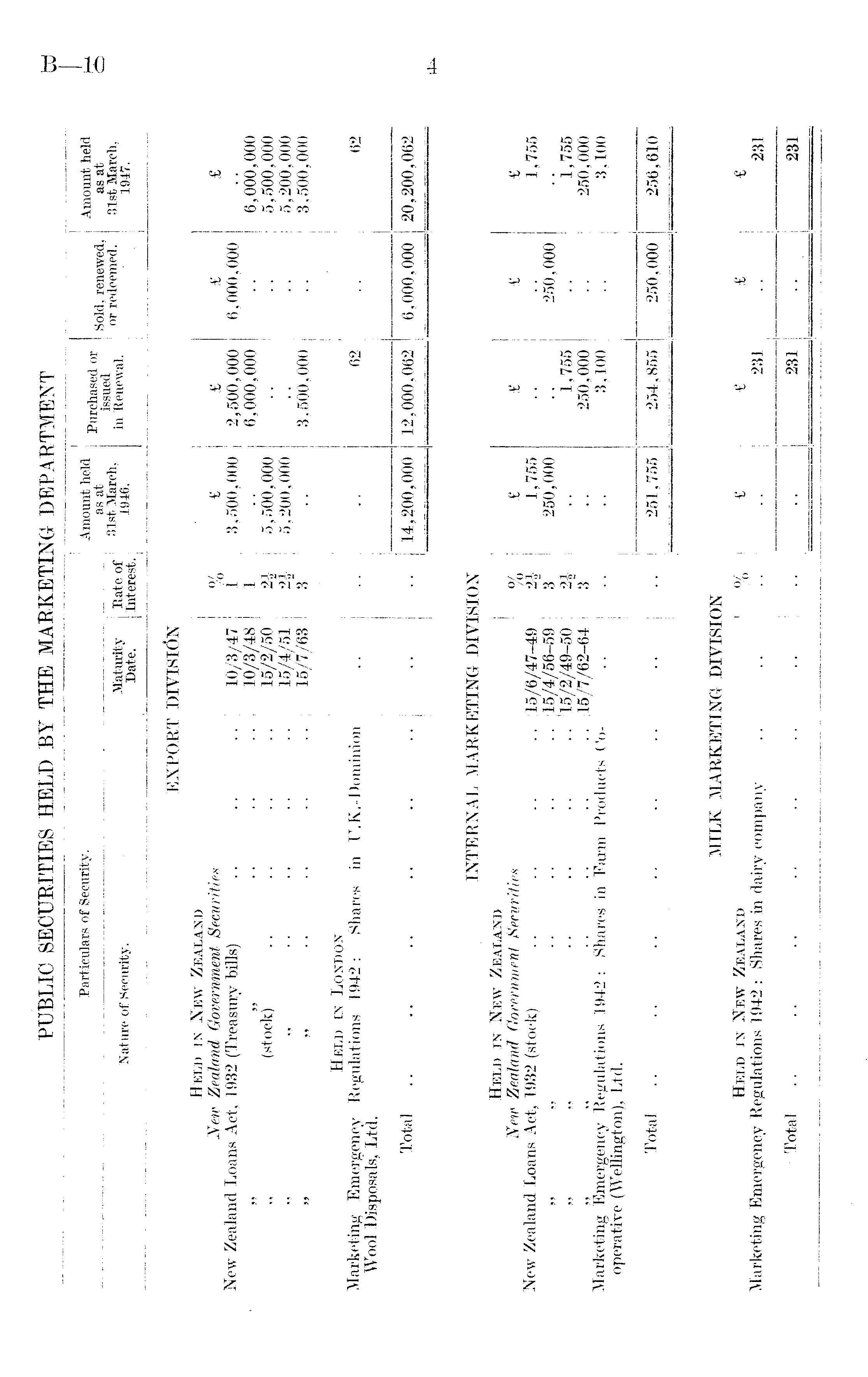 Particulars of Security. Amount held as at 31st March, 1946. Purchased or issued in Renewal. Sold, renewed, or redeemed. Amount held as at 31st March, 1947. Nature of Security. Maturity Date. 1 Rate of 1 Interest. EXPORT Held in New Zealand New Zealand Government Securities New Zealand Loans Act, 1932 (Treasury bills) „ (stock) Held in London Marketing Emergency Regulations 1942: Shares in U.K.-Dominion Wool Disposals, Ltd. Total INTERNAL MARK! Held in New Zealand New Zealand Government Securities New Zealand Loans Act, 1932 (stock) » 99 • • • • • • 99 99 • • • • • • • • )) 99 • • • • • • • • Marketing Emergency Regulations 1942 : Shares in Farm Products Cooperative (Wellington), Ltd. Total .. . . .. .. .. MILK MARKET1 Held in New Zealand Marketing Emergency Regulations 1942 : Shares in dairy company Total .. .. .. .. .. . . i DIVISI&N 10/3/47 10/3/48 15/2/50 15/4/51 15/7/63 STING DIV1 15/6/47-49 15/4/56-59 15/2/49-50 15/7/62-64 NG DIVISK 0/ /o 1 1 2* 2i 3 :sion % 2i 3 2i 3 ON % £ 3,500,000 5,500,000 5,200,000 £ 2,500,000 6,000,000 3,500,000 62 £ 6,000,000 £ 6,000,000 5,500,000 5,200,000 3,500,000 62 14,200,000 12,000,062 6,000,000 20,200,062 £ 1,755 250,000 £ 1,755 250,000 3,100 £ 250,000 £ 1,755 1,755 250,000 3,100 251,755 254,855 250,000 256,610 £ 1 £ 231 £ £ 231 231 231