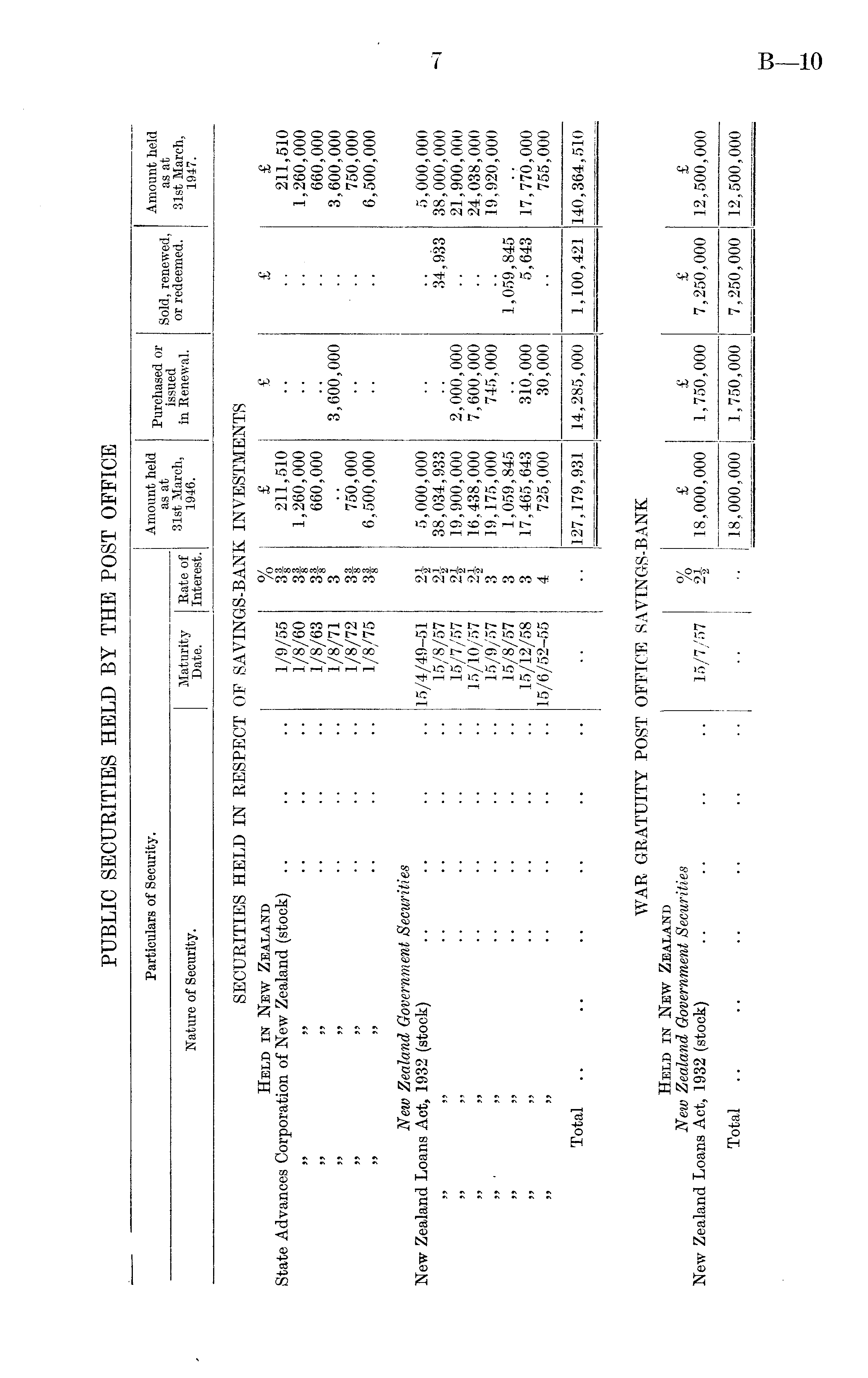 Particulars of Security. Amount held Pllr . h „ apf1 nt . Amount held as at Purchased or SoM ns at Mflturitv -Rate of 31st March, . or redeemed. 31st March, Nature of Security. 7 Interest 1946 " 111 EenewaL 1947. SECURITIES HELD IN RESPECT OF SAVINGS-BANK INVESTMENTS Held in New Zealand % £ £ £ £ State Advances Corporation of New Zealand (stock) .. .. .. 1/9/55 3f 211,510 .. .. 211,510 ...... 1/8/60 3f 1,260,000 .. .. 1,260,000 ...... 1/8/63 3f 660,000 .. .. 660,000 ...... 1/8/71 3 .. 3,600,000 .. 3,600,000 ...... 1/8/72 3| 750,000 .. .. 750,000 ...... 1/8/75 3| 6,500,000 .. .. 6,500,000 New Zealand Government Securities New Zealand Loans Act, 1932 (stock) .. .. .. .. 15/4/49-51 2\ 5,000,000 .. .. 5,000,000 15/8/57 2f 38,034,933 .. 34,933 38,000,000 15/7/57 2i 19,900,000 2,000,000 .. 21,900,000 15/10/57 2| 16,438,000 7,600,000 .. 24,038,000 15/9/57 3 19,175,000 745,000 .. 19,920,000 15/8/57 3 1,059,845 .. 1,059,845 15/12/58 3 17,465,643 310,000 5,643 17,770,000 .. 15/6/52-55 4 725,000 30,000 .. 755,000 Total .. .. .. .. .. .. .. .. 127,179,931 14,285,000 1,100,421 140,364,510 WAR GRATUITY POST OFFICE SAVINGS-BANK Held in New Zealand New Zealand Government Securities % £ £ £ £ New Zealand Loans Act, 1932 (stock) .. .. .. .. 15/7/57 18,000,000 1,750,000 7,250,000 12,500,000 Total .. .. .. .. .. .. .. .. 18,000,000 1,750,000 7,250,000 12,500,000