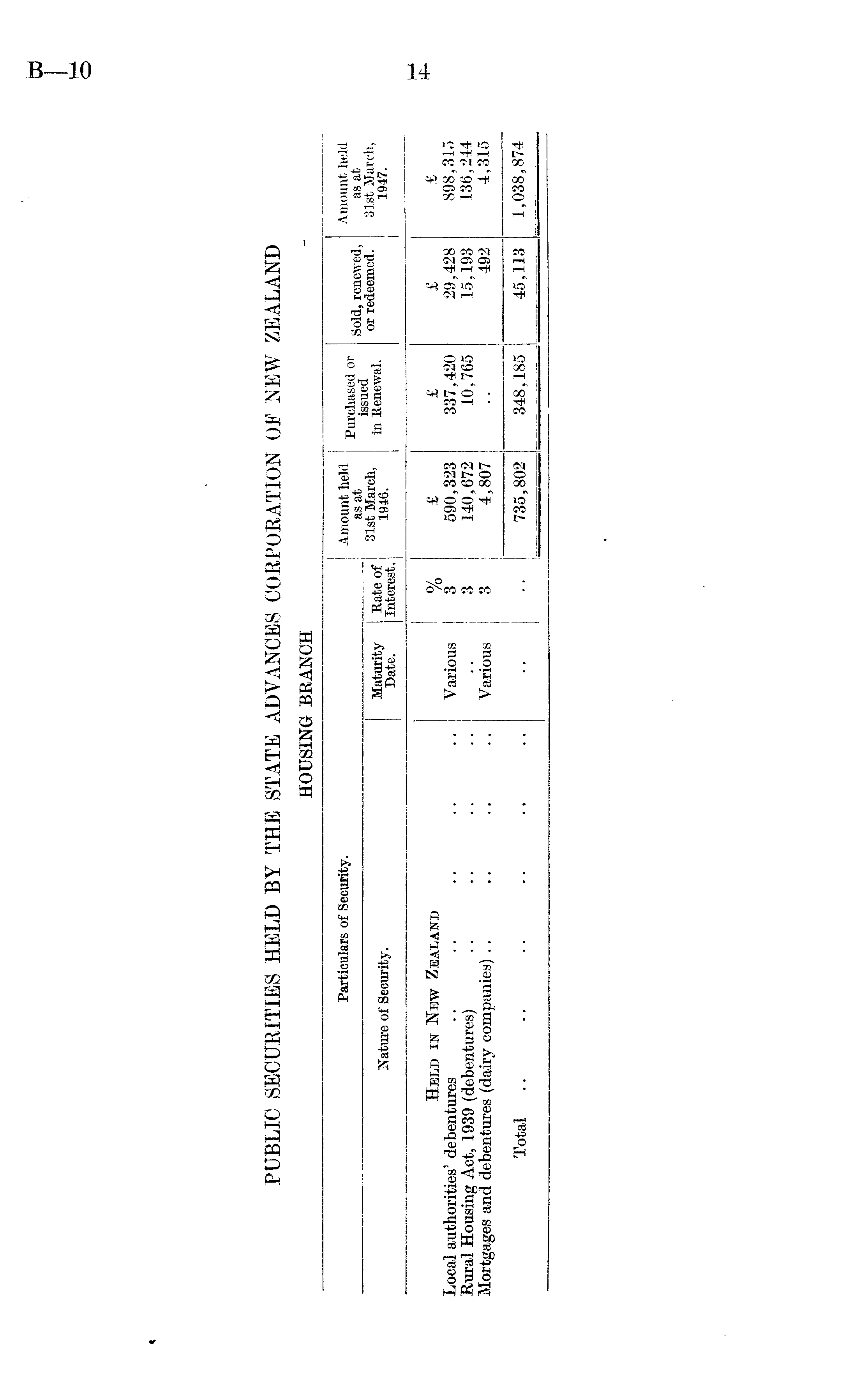 Particulars of Security. Amount held as at 81st March, 1946. Purchased or issued in Renewal. Sold, renewed, or redeemed. Amount held as at 31st March, 1947. Nature of Security. Maturity Date. Rate of Interest. Held in New Zealand Local authorities' debentures Rural Housing Act, 1939 (debentures) Mortgages and debentures (dairy companies) Total Various Various 0/ /o 3 3 3 £ 590,323 140,672 4,807 £ 337,420 10,765 £ 29,428 15,193 492 £ 898,315 136,244 4,315 735,802 348,185 45,113 1,038,874