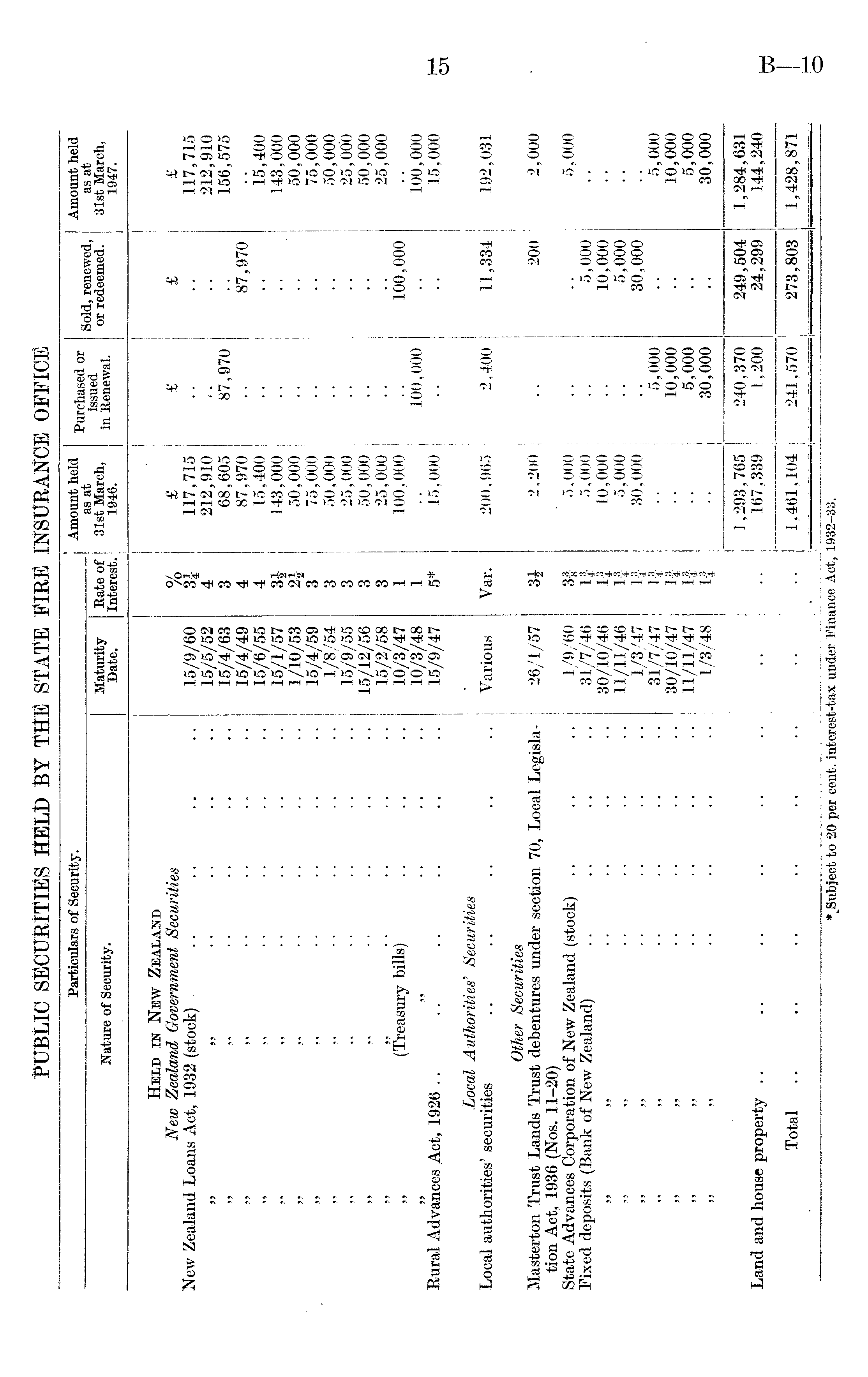 Particulars of Security. Amount held •p„,„v, 0£ . 0 /i m Amount held as at Sold, renewed, as at Nature of Security. "gg* Bgecf 31st March, to g£~aL or redeemed. 31st March, I 1 Held in New Zealand New Zealand Government Securities % £ £ £ £ New Zealand Loans Act, 1932 (stock) .. .. .. .. 15/9/60 3J 117,715 .. .. 117,715 15/5/52 4 212,910 .. 212,910 15/4/63 3 68,605 87,970 .. 156,575 15/4/49 4 87,970 .. 87,970 15/6/55 4 15,400 .. I .. 15,400 15/1/57 3i ' 143,000 .. I .. 143,000 ■ „ .. .. .. .. 1/10/53 2f 50,000 .. .. 50,000 .. 15/4/59 3 75,000 .. .. 75,000 1/8/54 3 50,000 .. .. 50,000 15/9/55 3 25,000 .. | .. 25,000 15/12/56 3 50,000 .. i .. 50,000 15/2/58 3 25,000 .. i .. 25,000 (Treasury bills) .. .. .. 10/3/47 1 100,000 .. 100,000 ...... 10/3/48 1 .. 100,000 .. 100,000 Rural Advances Act, 1926 .. .. .. .. .. .. 15/9/47 5* 15,000 .. .. 15,000 Local Authorities' Securities Local authorities' securities .. .. .. .. .. j Various Var. 200,965 2,400 11,334 192,031 Other Securities Masterton Trust Lands Trust debentures under section 70, Local Legisla- 26/1/57 3J 2,200 .. 200 2,000 tion Act, 1936 (Nos. 11-20) j State Advances Corporation of New Zealand (stock) .. .. .. j 1/9/60 3f- 5,000 .. .. 5,000 Fixed deposits (Bank of New Zealand) .. .. .. .. 31/7/46 If- 5,000 1 .. 5,000 30/10/46 If 10,000 .. 10,000 11/11/46 1-| 5,000 .. 5,000 1/3/47 If- 30,000 .. 30,000 31/7/47 if .. 5,000 .. 5,000 30/10/47 | if .. 10,000 .. 10,000 11/11/47 If .. 5,000 .. 5,000 1/3/48 If .. 30,000 .. 30,000 1,293,765 240,370 249,504 1,284,631 Land and house property .. .. .. .. .. .. .. .. 167,339 1,200 24,299 144,240 Total .. .. .. .. .. .. .. .. 1,461,104 241,570 273,803 1,428,871 to 20 per cent, interest-tax under Finance Act, 1932-33.